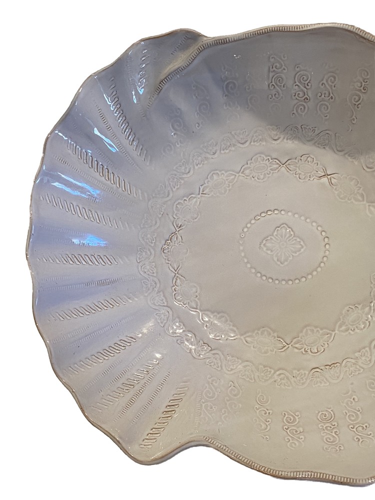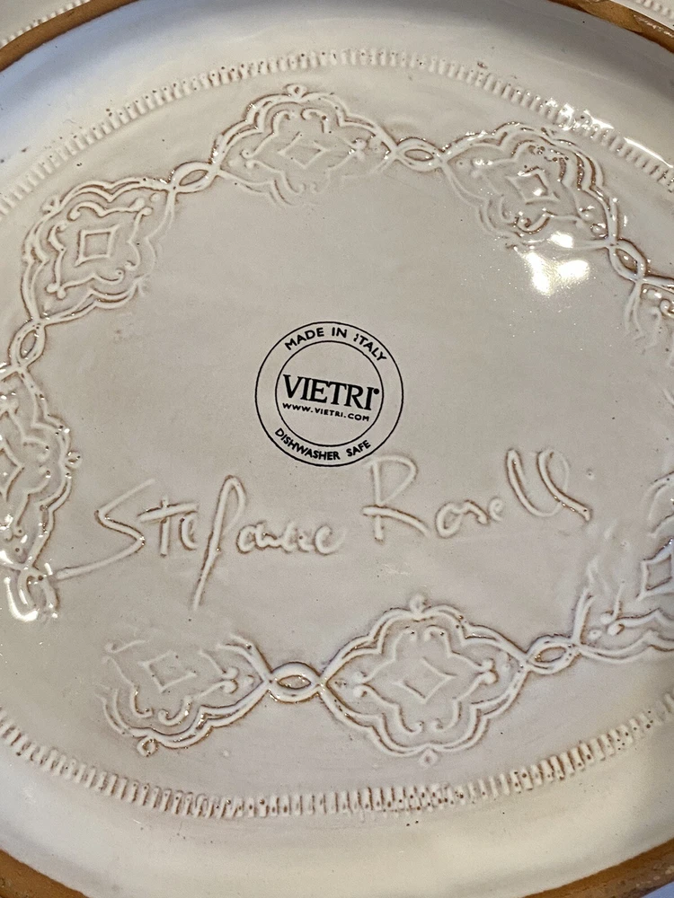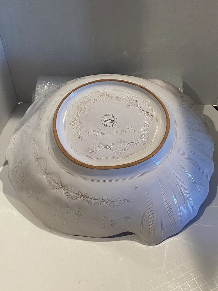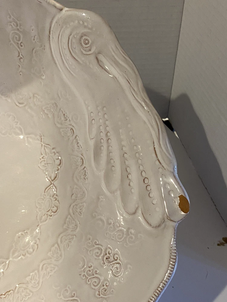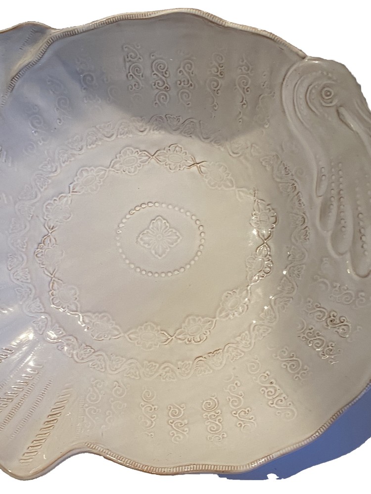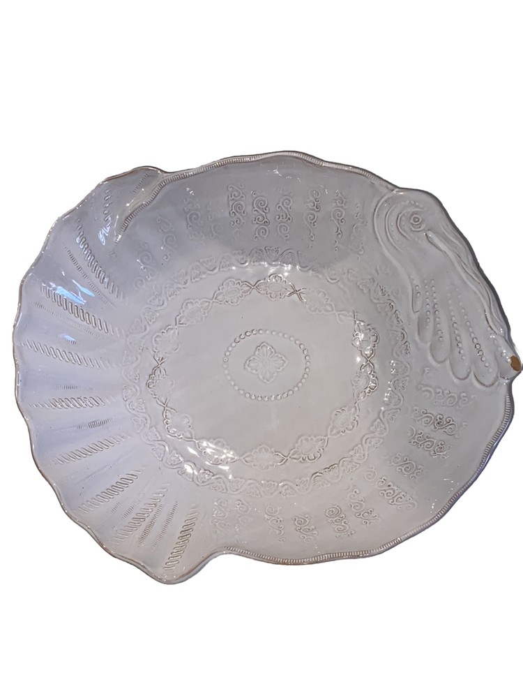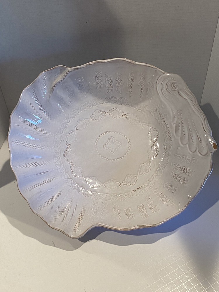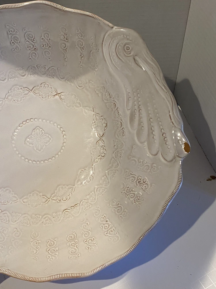 Vietri Stefano Roselli Embossed Turkey Shaped White Serving Bowl Remember: Vintage is never perfect. Each vintage item was owned and used before it was found and listed in this shop. Please see all photos as they are part of the description. There is 1 chip on the Turkey’s Snood.
