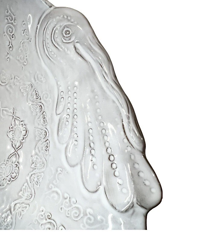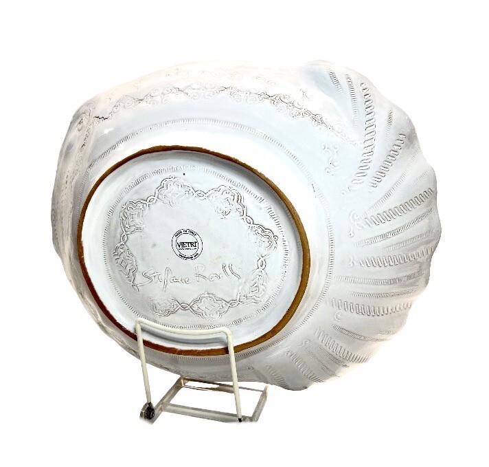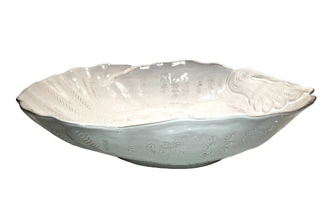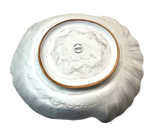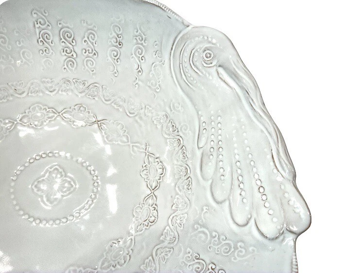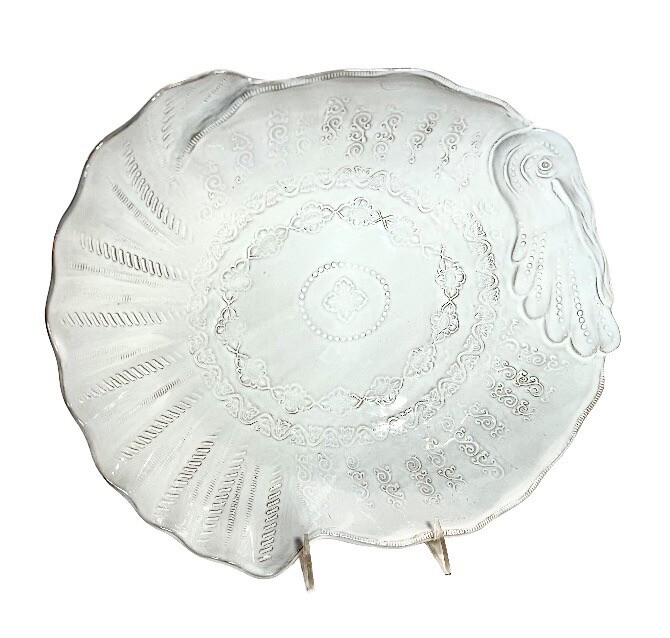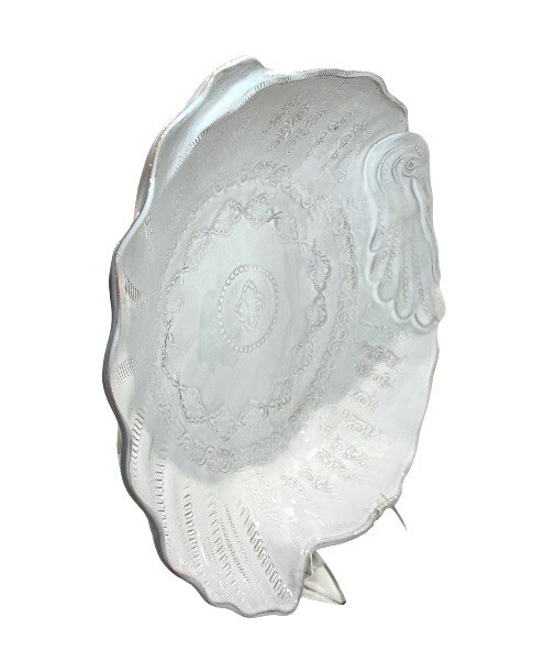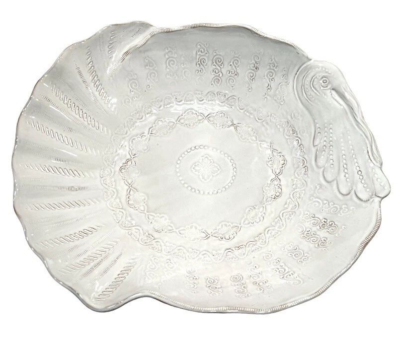 This beautiful ceramic serving bowl or deep platter by VIETRI is a limited edition item that will add a touch of rustic Tuscan style to your holiday table. With a unique abstract embossed surface design and a charming turkey shape, this piece is perfect for Thanksgiving, Christmas, and other autumn-themed occasions. Measuring 15.5 inches in length, 12.75 inches in width, and 3.75 inches in height, it is ideal for serving your favorite dishes to family and friends. Crafted by master artist Stefano Roselli in Italy, this earthenware piece is hand-painted and signed for authenticity. Offered in white glaze with an all-over impressed abstract design showing traces of red clay beneath to complement any table setting. Condition is new and unused. Cabinet piece used for display only.