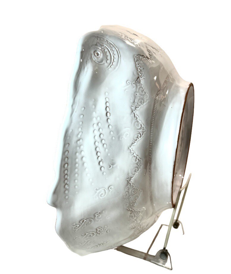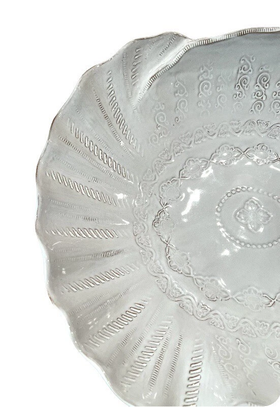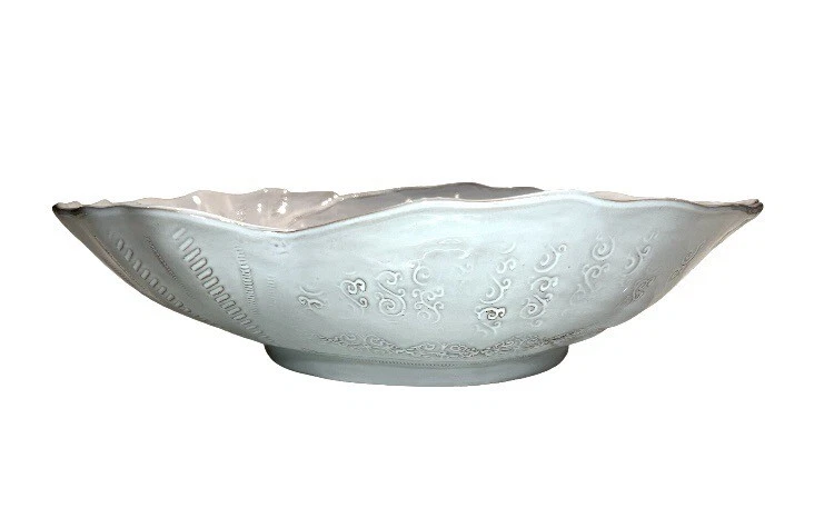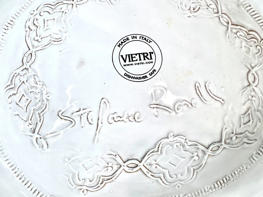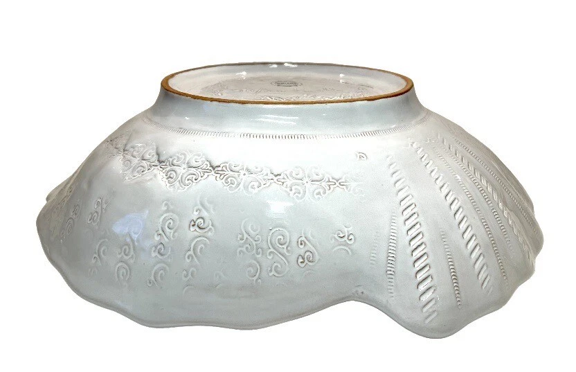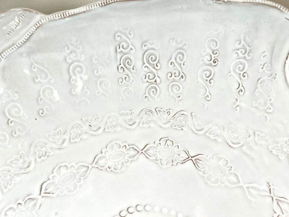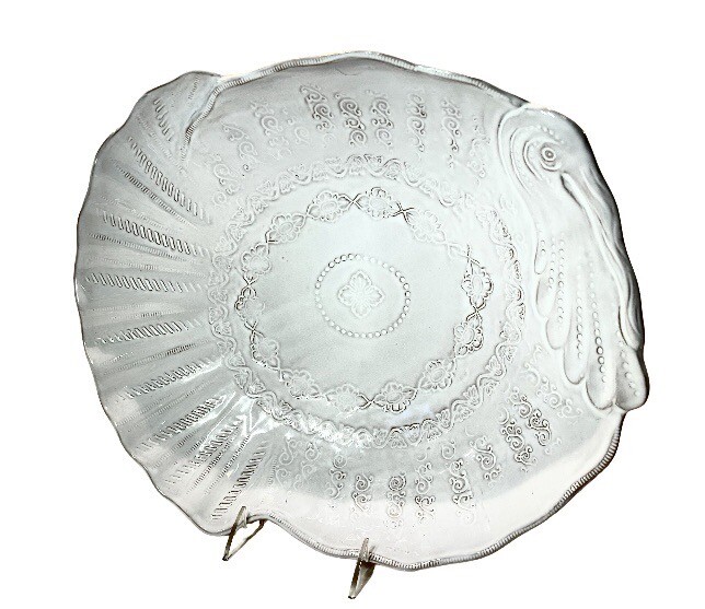 This beautiful ceramic serving bowl or deep platter by VIETRI is a limited edition item that will add a touch of rustic Tuscan style to your holiday table. With a unique abstract embossed surface design and a charming turkey shape, this piece is perfect for Thanksgiving, Christmas, and other autumn-themed occasions. Measuring 15.5 inches in length, 12.75 inches in width, and 3.75 inches in height, it is ideal for serving your favorite dishes to family and friends. Crafted by master artist Stefano Roselli in Italy, this earthenware piece is hand-painted and signed for authenticity. Offered in white glaze with an all-over impressed abstract design showing traces of red clay beneath to complement any table setting. Condition is new and unused. Cabinet piece used for display only.