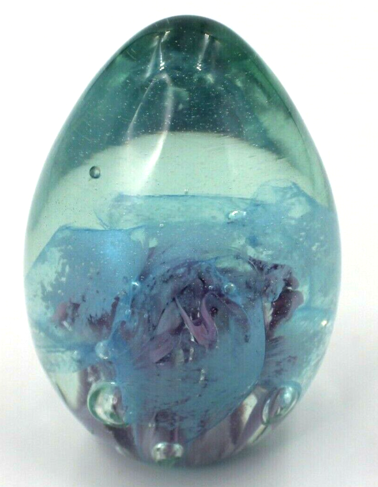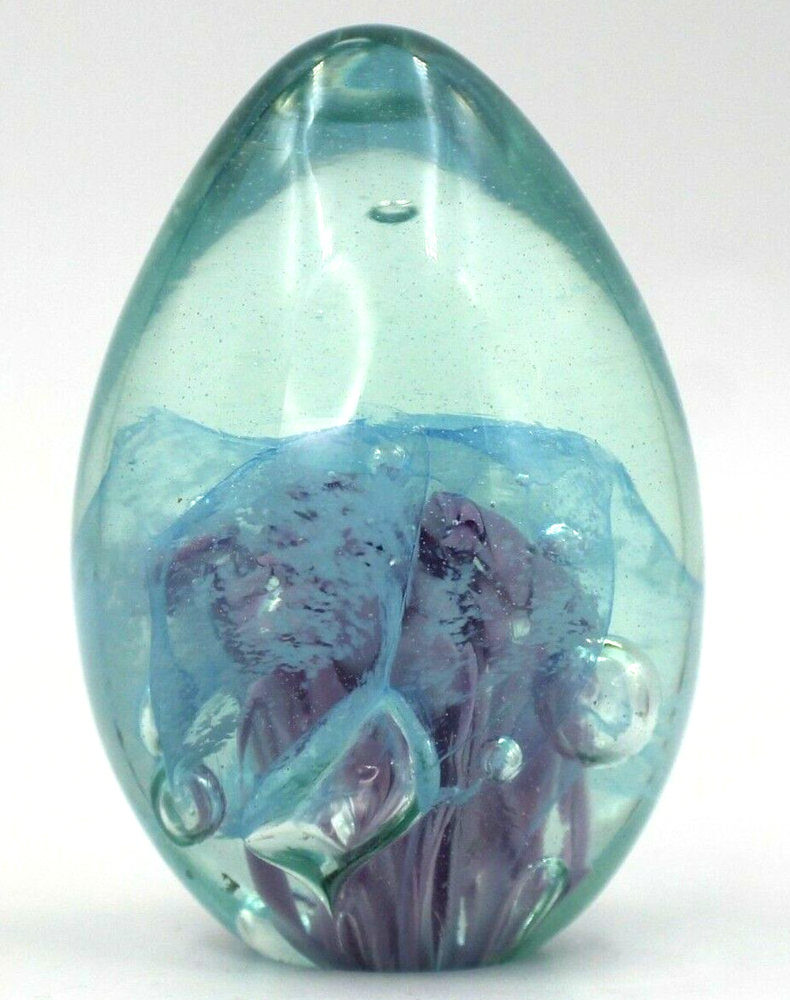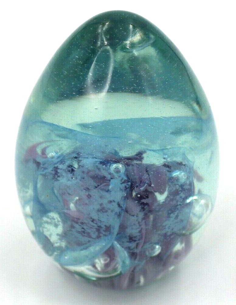 Very pretty combinations of blues/greens and purples . Created with ash from the 1980 eruption of Mt. St. Helens volcano. Paperweight measures 3.25" H x 2.5" in diameter....