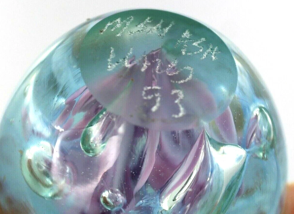 Very pretty combinations of blues/greens and purples . Created with ash from the 1980 eruption of Mt. St. Helens volcano. Paperweight measures 3.25" H x 2.5" in diameter.