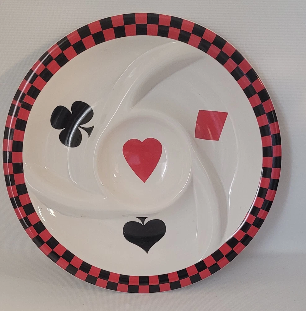 This vintage 12" diameter poker card suit vegetable chip dip platter from Alco Industries is a must-have for any collector or fan of the game. The round platter features a colorful design with the four classic poker card suits - diamonds, clubs, hearts, and spades - and is made of durable ceramic material with a glossy finish. Perfect for serving appetizers or dips, this large platter is sure to impress your guests and add a touch of fun to your table setting. Whether you're hosting a poker night or just looking for a unique addition to your dinnerware collection, this vintage platter is sure to meet all your needs.