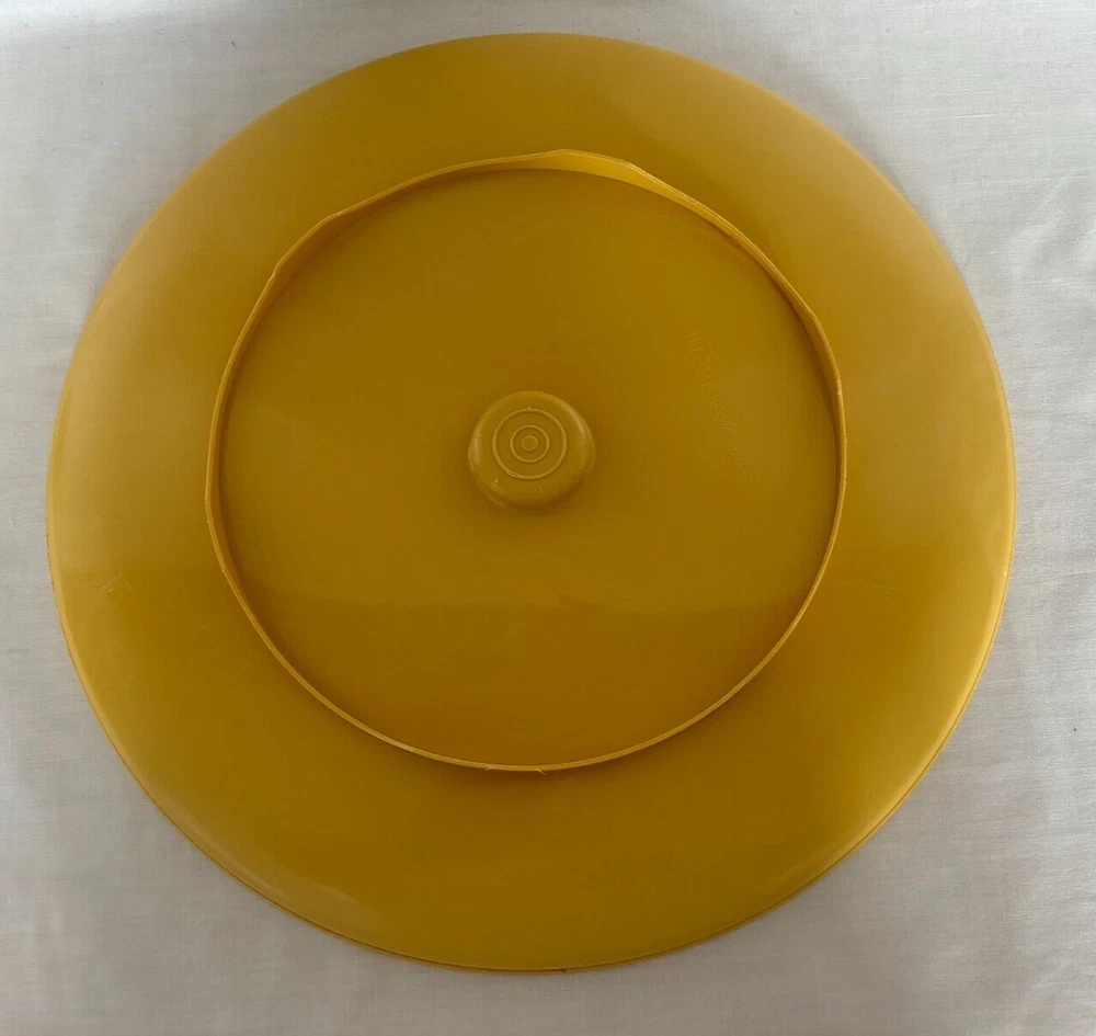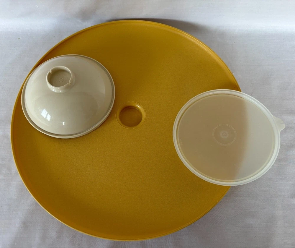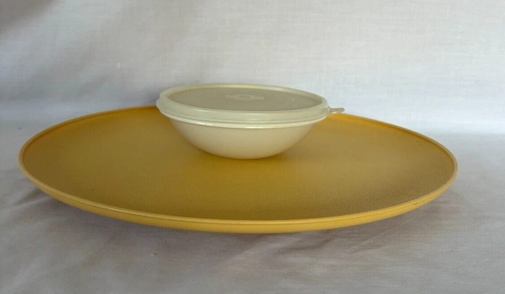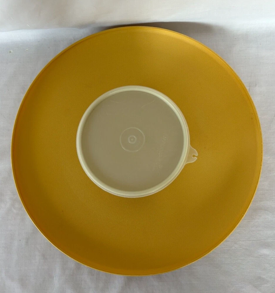 Vintage Tupperware 14-inch diameter tray with center lidded detachable bowl. Like New, no signs of use or wear. No scratches on either tray or bowl. Bowl is shiny, glossy with a tight fitting lid. Useful for chips and dip, relishes, veggies, pastries, cookies, candy etc. A very utilitarian tray in vintage harvest gold color. The bowl is white. See photos for item detail, condition, and measurements. Smoke free, pet free home. Ships U.S. Mail, Ground Advantage. U.S. Only