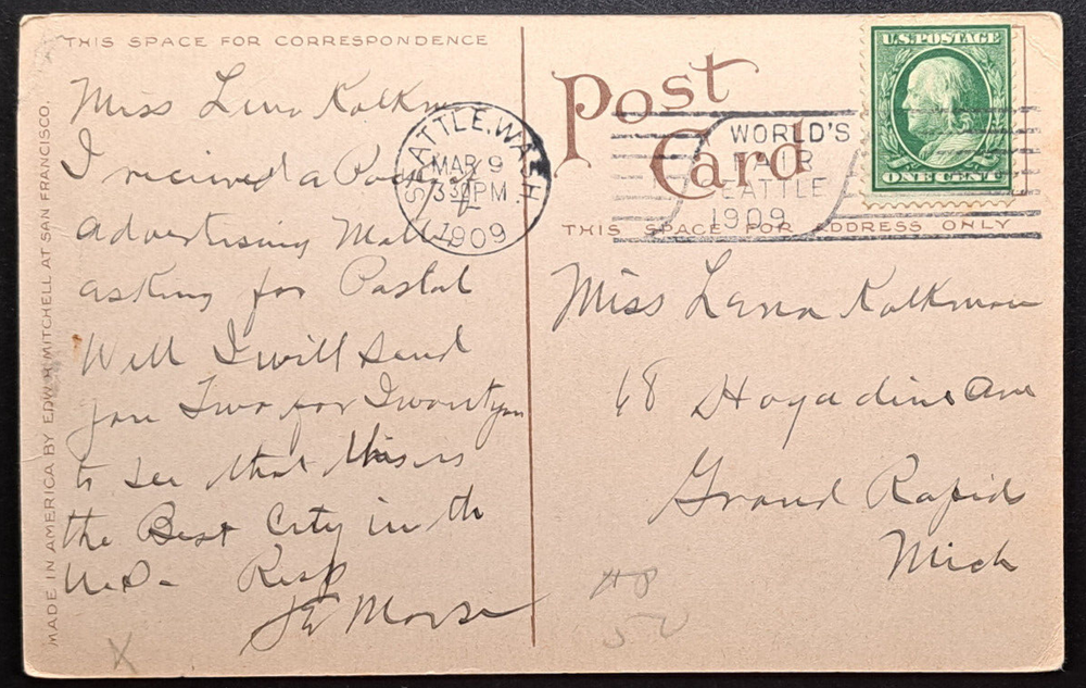 Post card exactly as described and photographed. Very reasonable price. Fast shipping. Well protected packaging. A great buying experience from a great seller! Thanks.