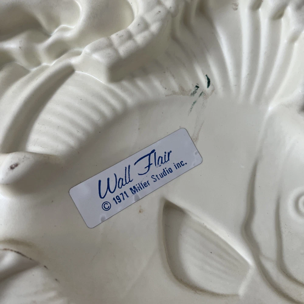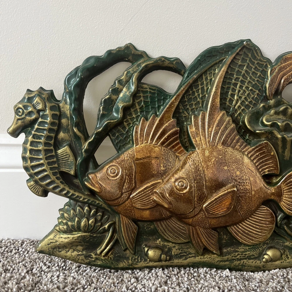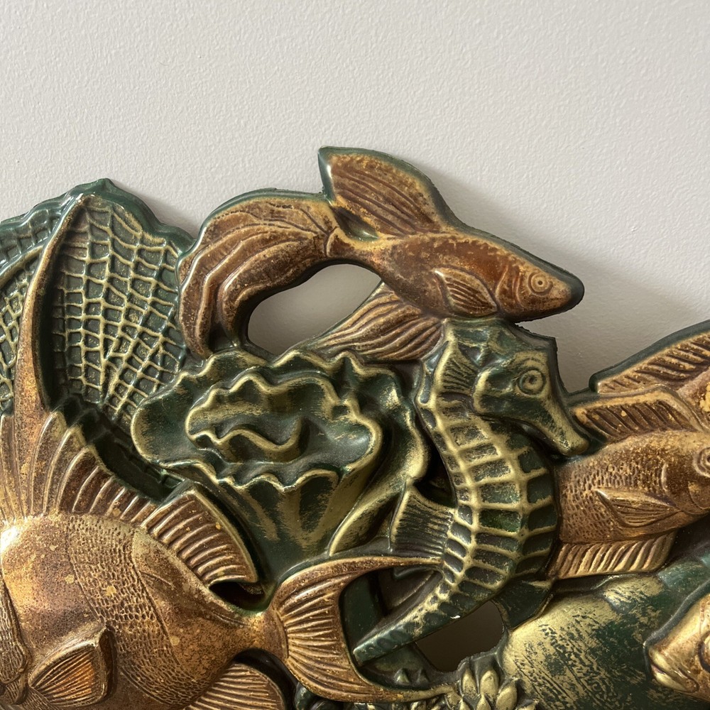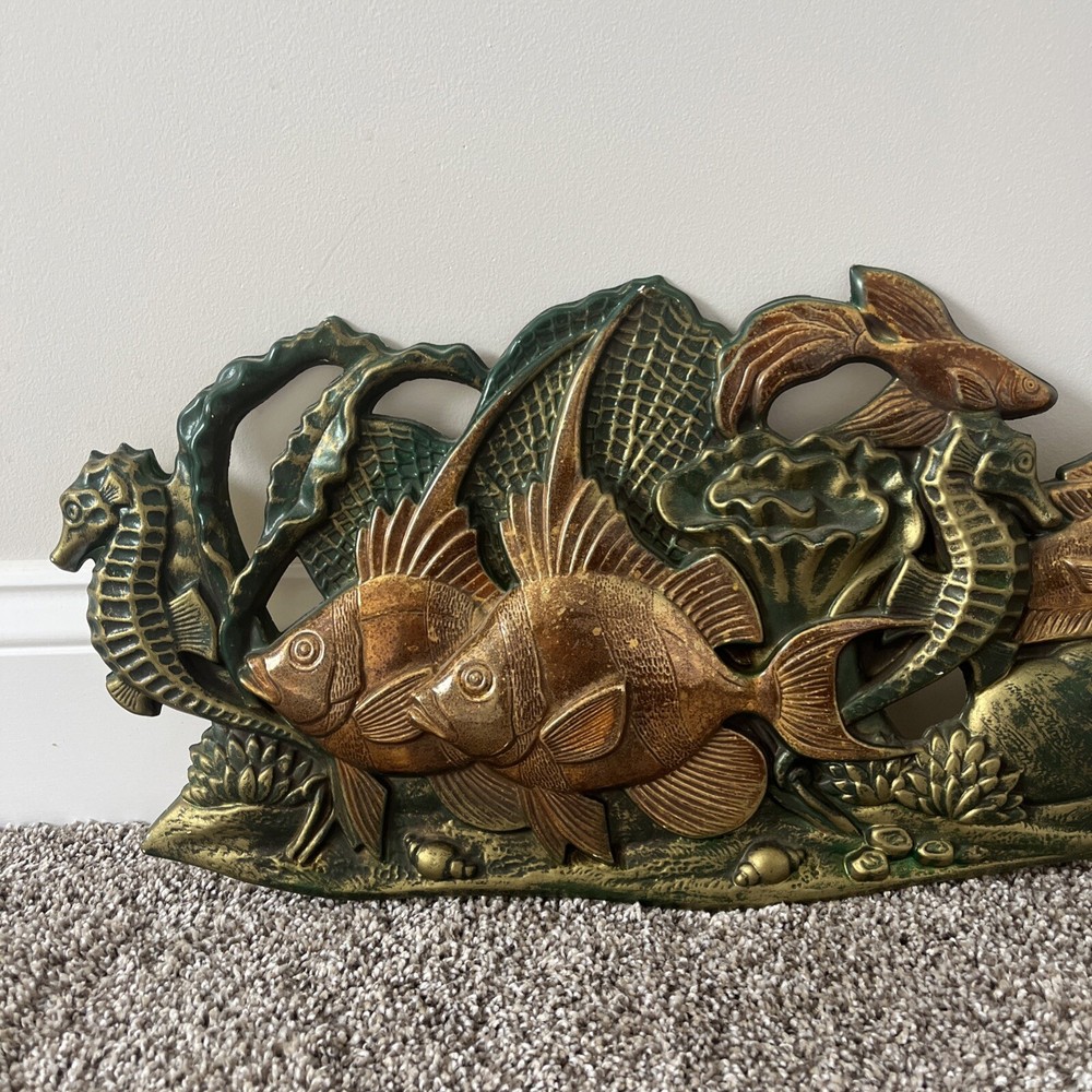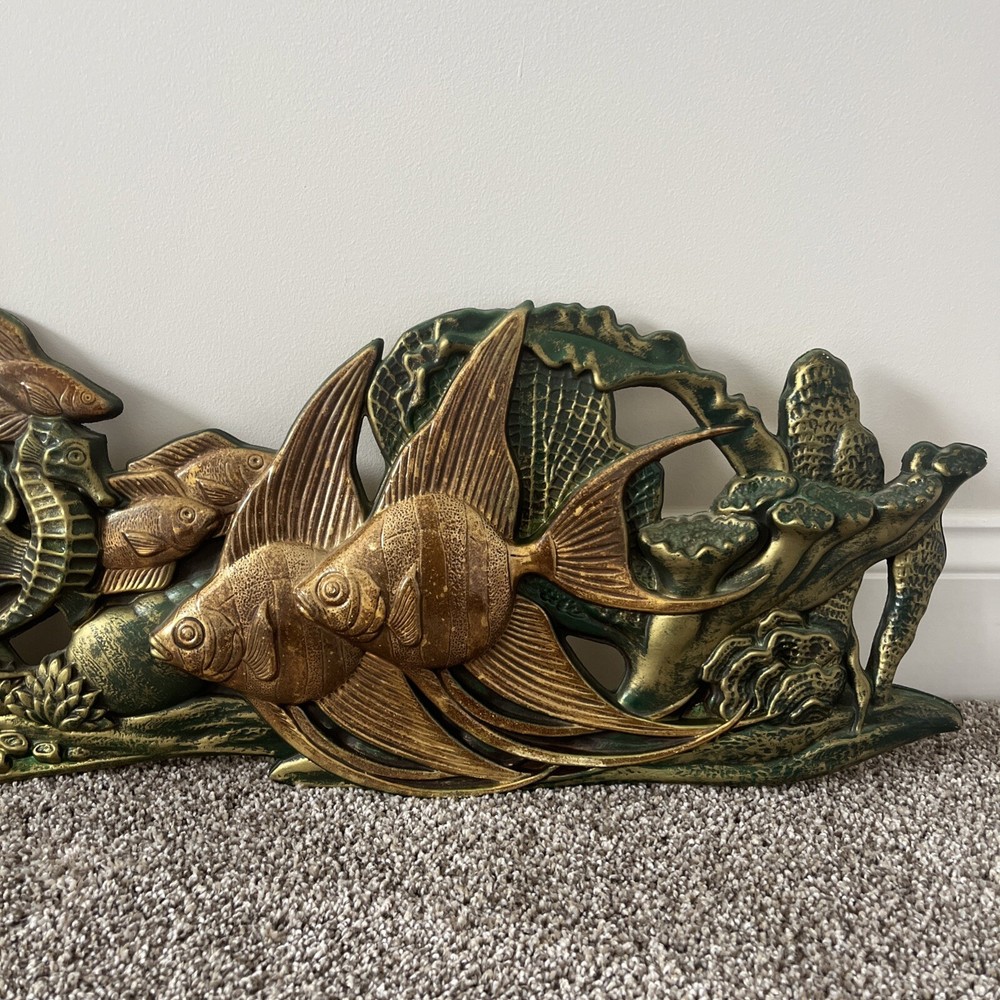 BEAUTIFUL & RARE PIECE! Only saw 2 similar pieces (internationally) when searched online. Vintage MCM 1971 “Wall Flair” by Miller Studio plastic tropical fish / ocean scene wall decor art piece! Made of lightweight plastic, this gorgeous piece features raised relief angel fish, seahorses, a betta fish, shells, coral, anemones, this piece has it all. Whole piece has a metallic overtone, main colors are copper, dark green and gold. Truly a must see piece! In good to very good preowned condition. No damage seen, a few minor scuff marks consistent with age that are not noticeable. Back does have some old partial pieces of foam padding / wall stops. Very large, measures approx 35”W x 10.5”H. Would make an amazing MCM focal point, show piece, conversation starter for you room or gallery wall!