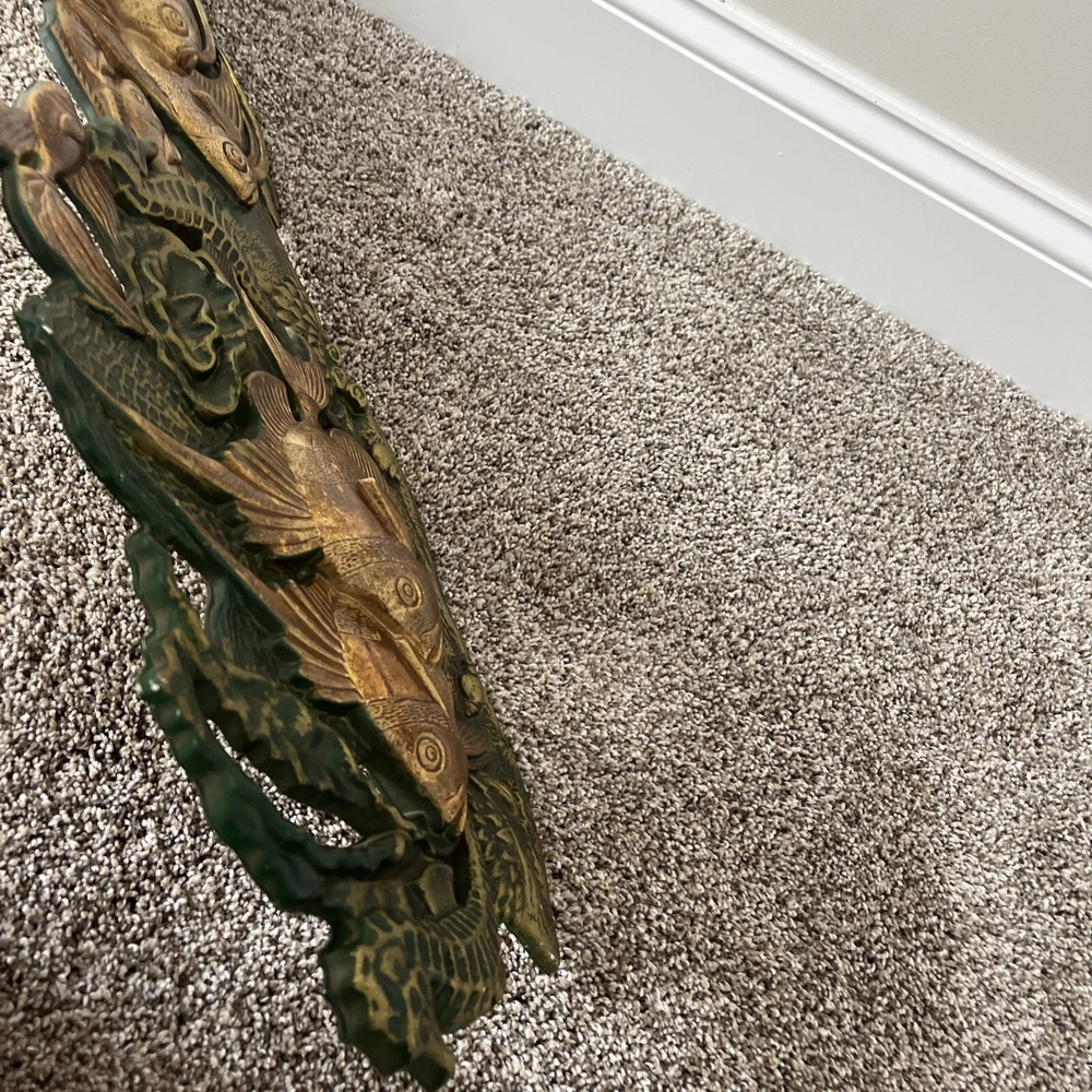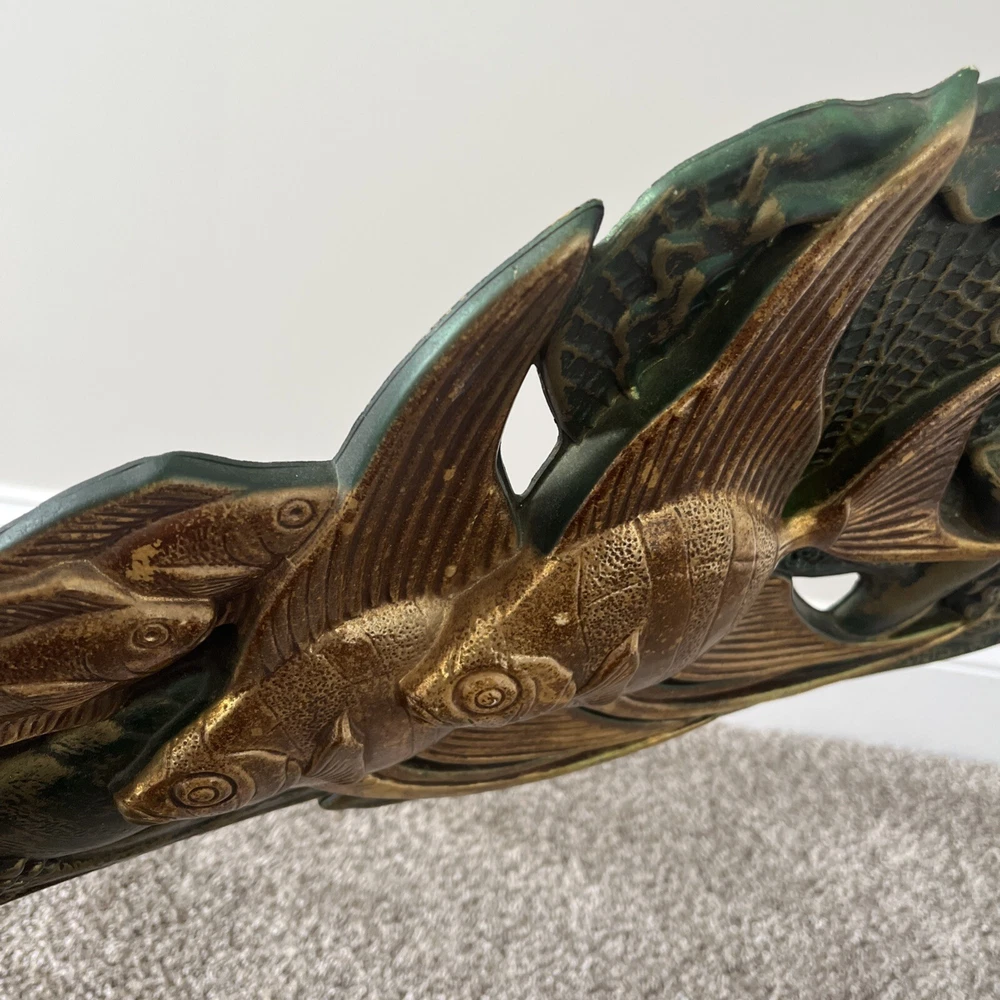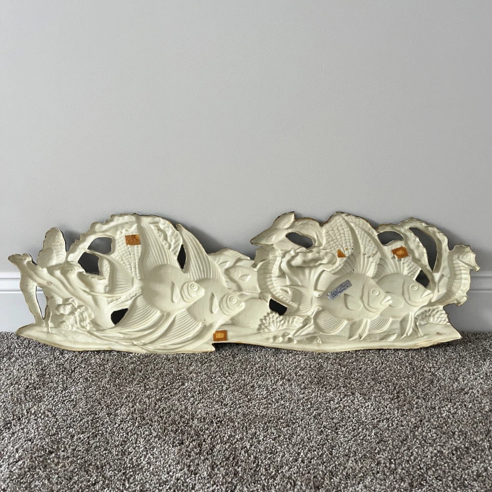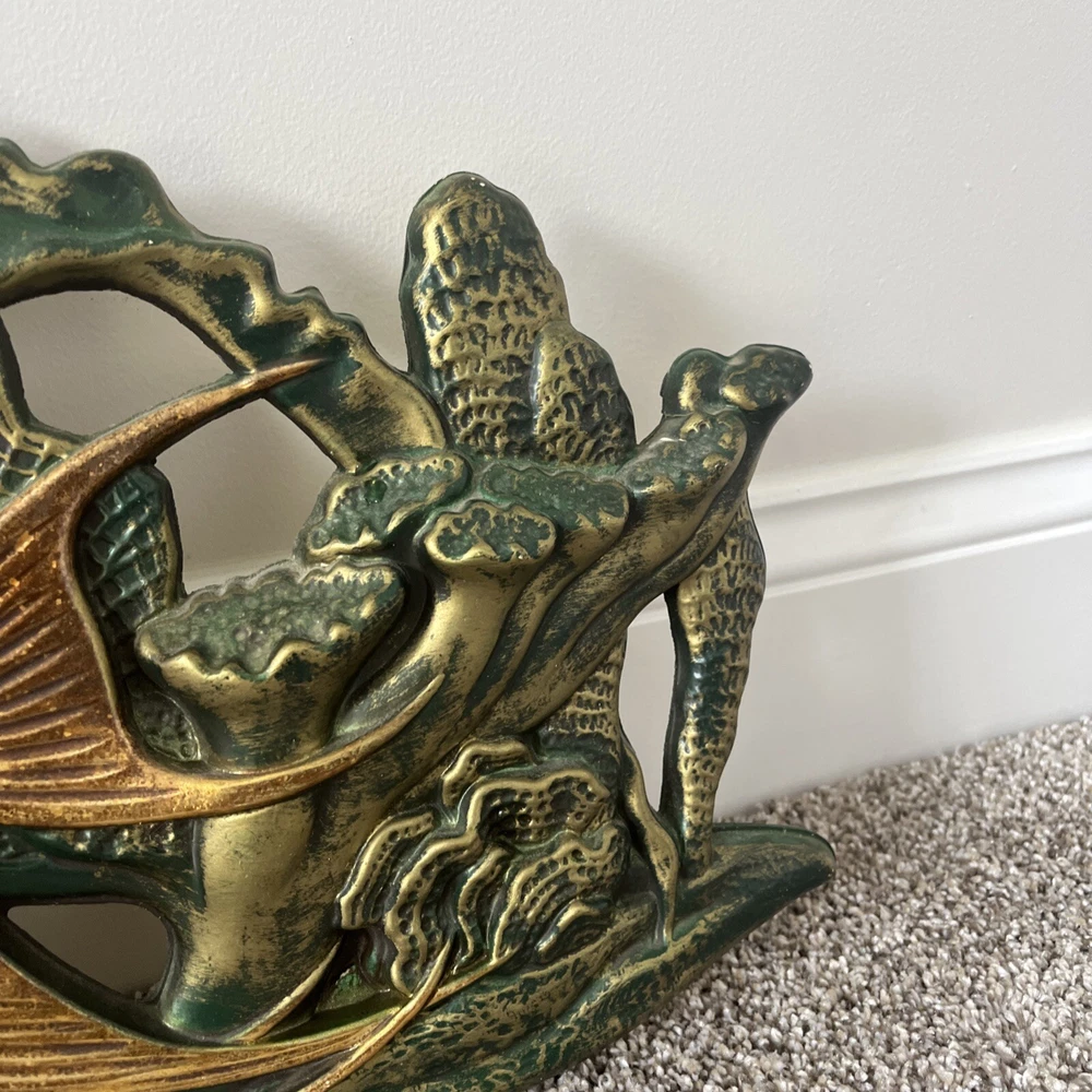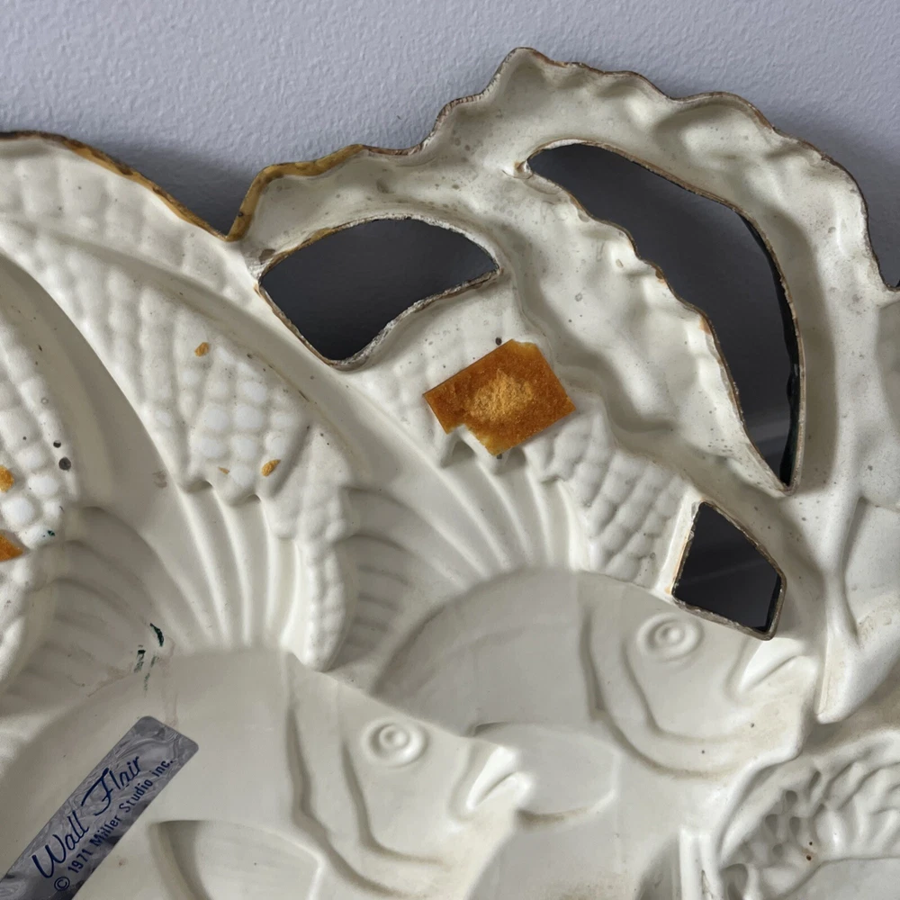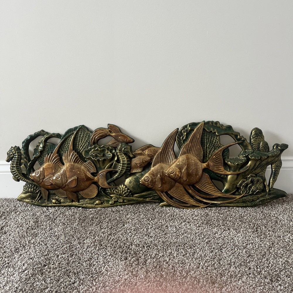 BEAUTIFUL & RARE PIECE! Only saw 2 similar pieces (internationally) when searched online. Vintage MCM 1971 “Wall Flair” by Miller Studio plastic tropical fish / ocean scene wall decor art piece! Made of lightweight plastic, this gorgeous piece features raised relief angel fish, seahorses, a betta fish, shells, coral, anemones, this piece has it all. Whole piece has a metallic overtone, main colors are copper, dark green and gold. Truly a must see piece! In good to very good preowned condition. No damage seen, a few minor scuff marks consistent with age that are not noticeable. Back does have some old partial pieces of foam padding / wall stops. Very large, measures approx 35”W x 10.5”H. Would make an amazing MCM focal point, show piece, conversation starter for you room or gallery wall!