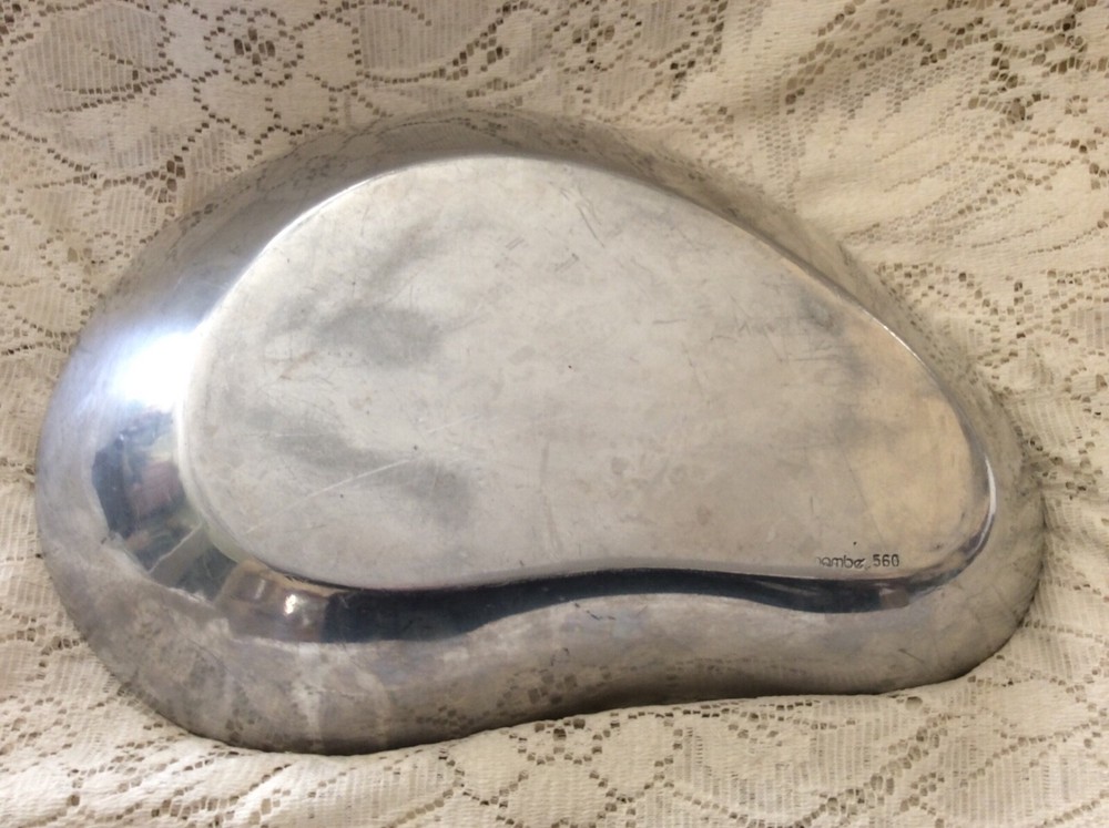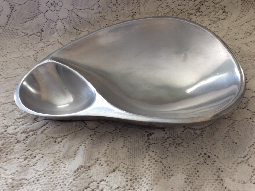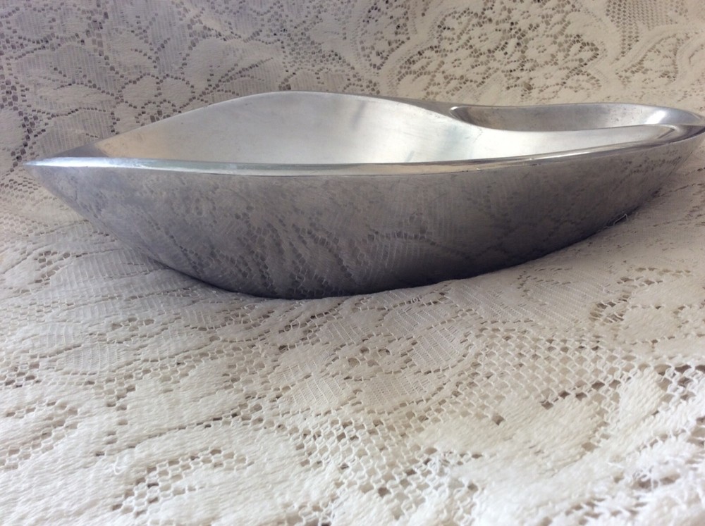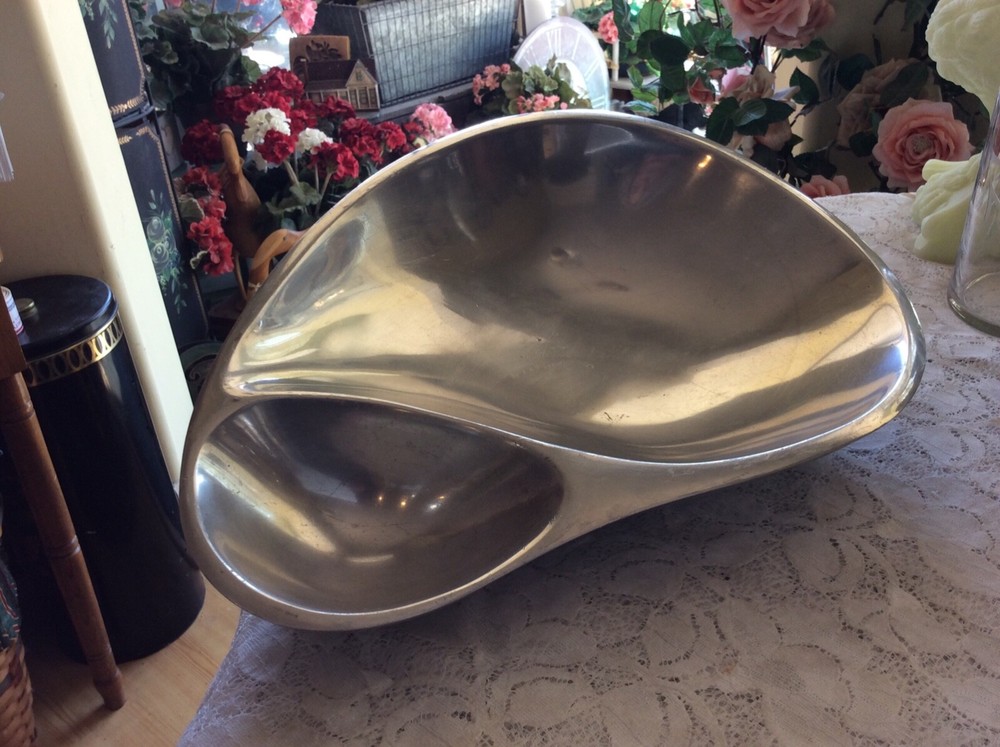 Add a touch of vintage charm to your dining table with this large serving bowl from Nambé. With a beautiful tear-drop shape and a shiny finish, this bowl is perfect for all occasions. The bowl measures 14 inches in diameter and 10 inches in width, making it a great choice for serving chips, dips, and other appetizers. Crafted from high-quality alloy metal, this original piece from the 1980s is a great addition to any mid-century modern collection. The solid pattern and silver color make it a versatile choice for any home décor. Whether you are hosting a party or just enjoying a casual meal with your family, this Nambé serving bowl is sure to impress.