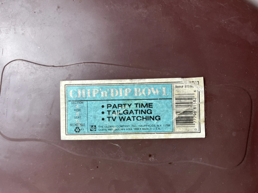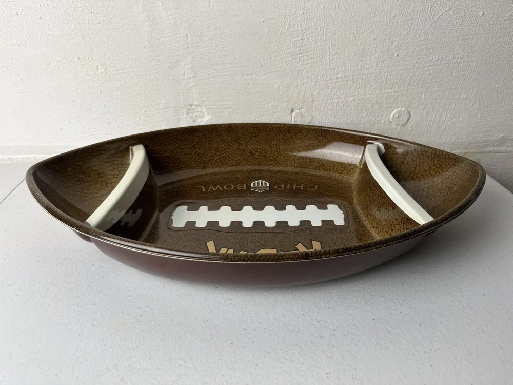 This Chip ‘N Dip bowl was purchased as a souvenir in 1991 for Super Bowl XXV. This was in Rochester, NY… the heart of Buffalo Bills territory. It was never used, so I guess you could say it’s new old stock. It does show some minor signs of age, but overall it’s in great condition. Sold as-is. See photos for more details. Thanks for looking!