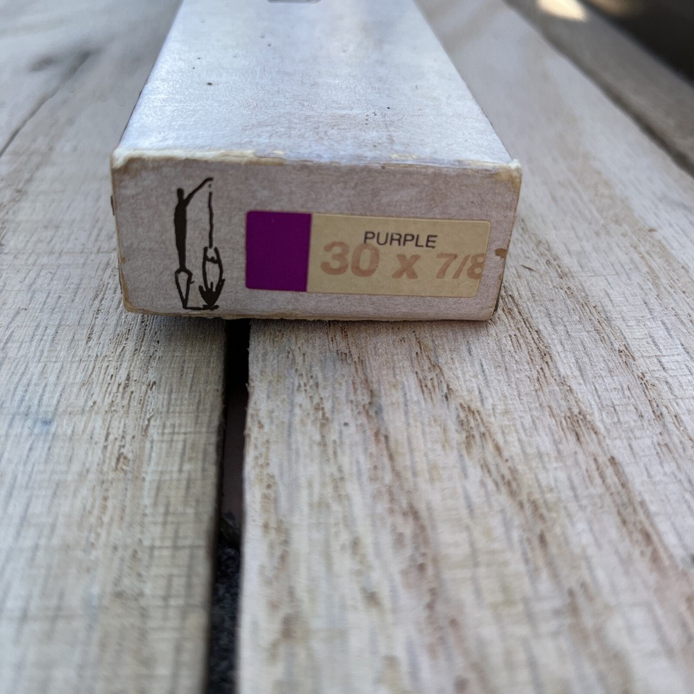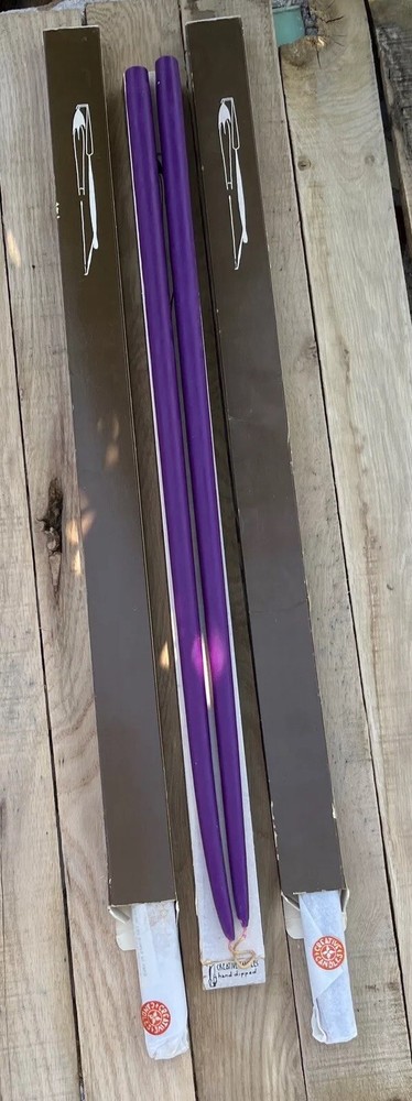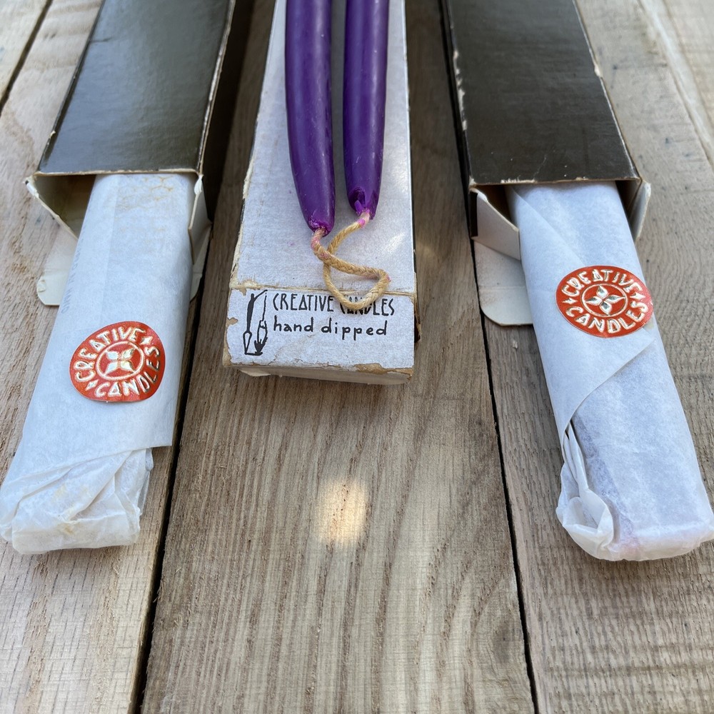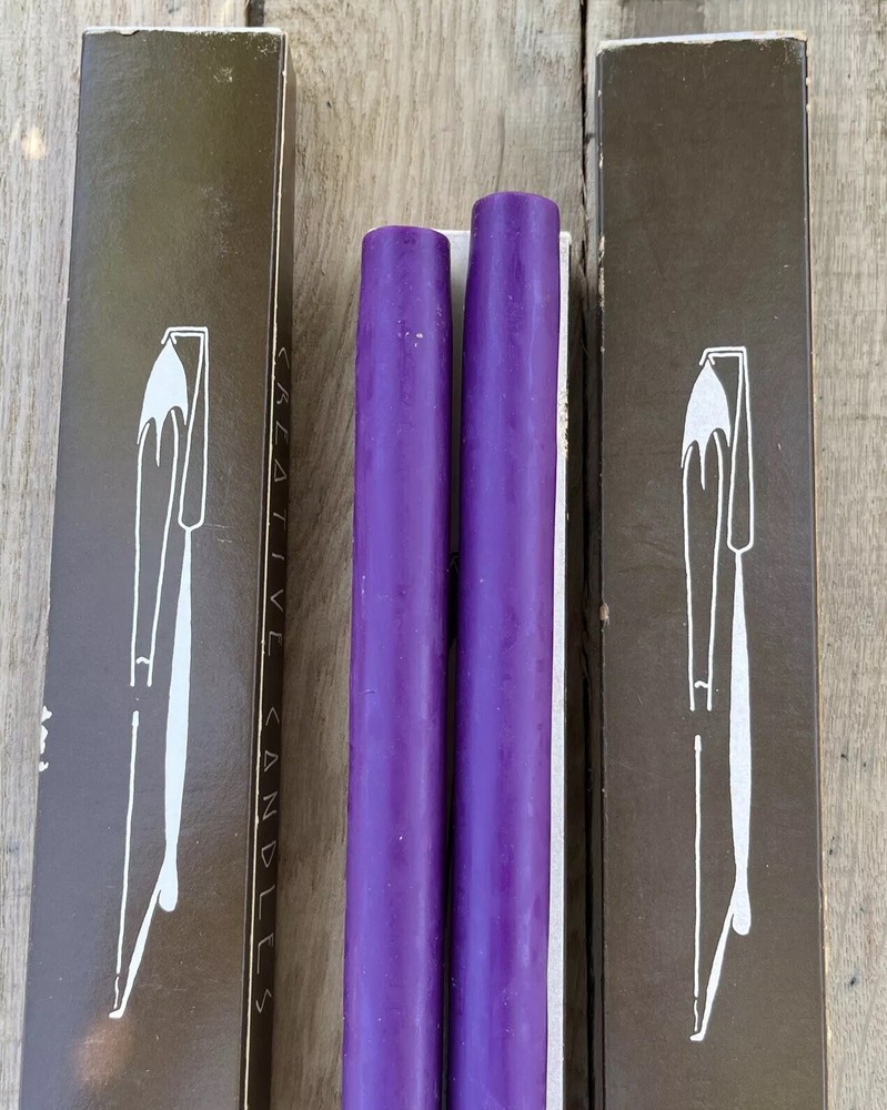 This listing is for a set of vintage 30" tall hand-dipped taper candles from the brand Creative Candles. The pack includes 6 purple candles in total, with each taper measuring 7/8" in width. These unscented candles are handmade in the United States and come in a pack of 3 pairs (6 candles in total). One of the packs is not wrapped with tissue the other 2 are untouched with the tissue. The candles are designed with a taper shape and have a classic look that adds a touch of elegance to any home decor. Personalization is not available for this product.