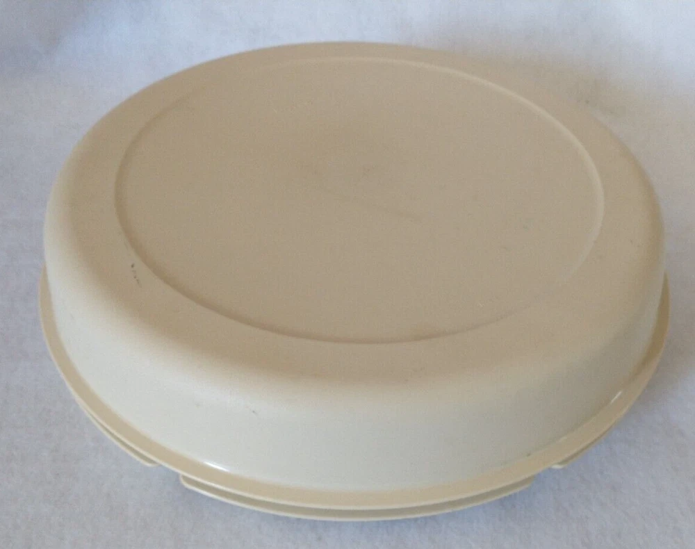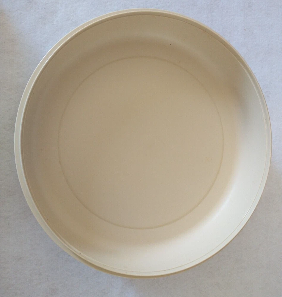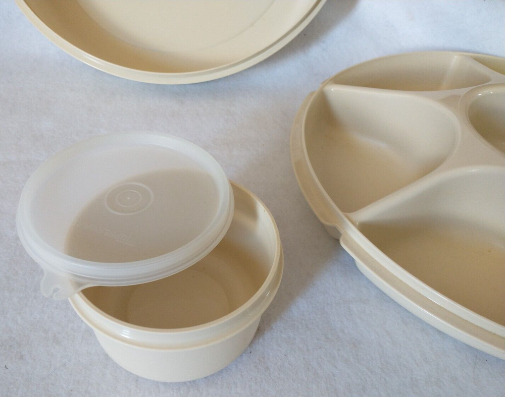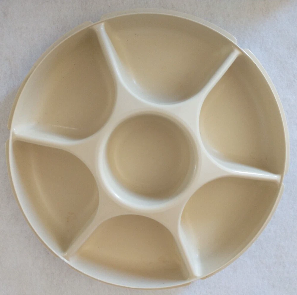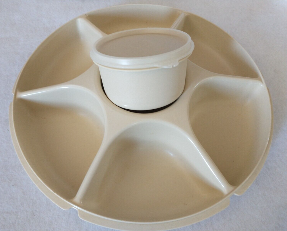 Tupperware Divided Serving Tray With Lid Center Dip Bowl With Lid 4 Pieces (Tray, Dip Bowl, Lid, and Cover) 6 compartments for fruits, veggies, etc. 1 center compartment for dip bowl Vintage Beige Pre-owned