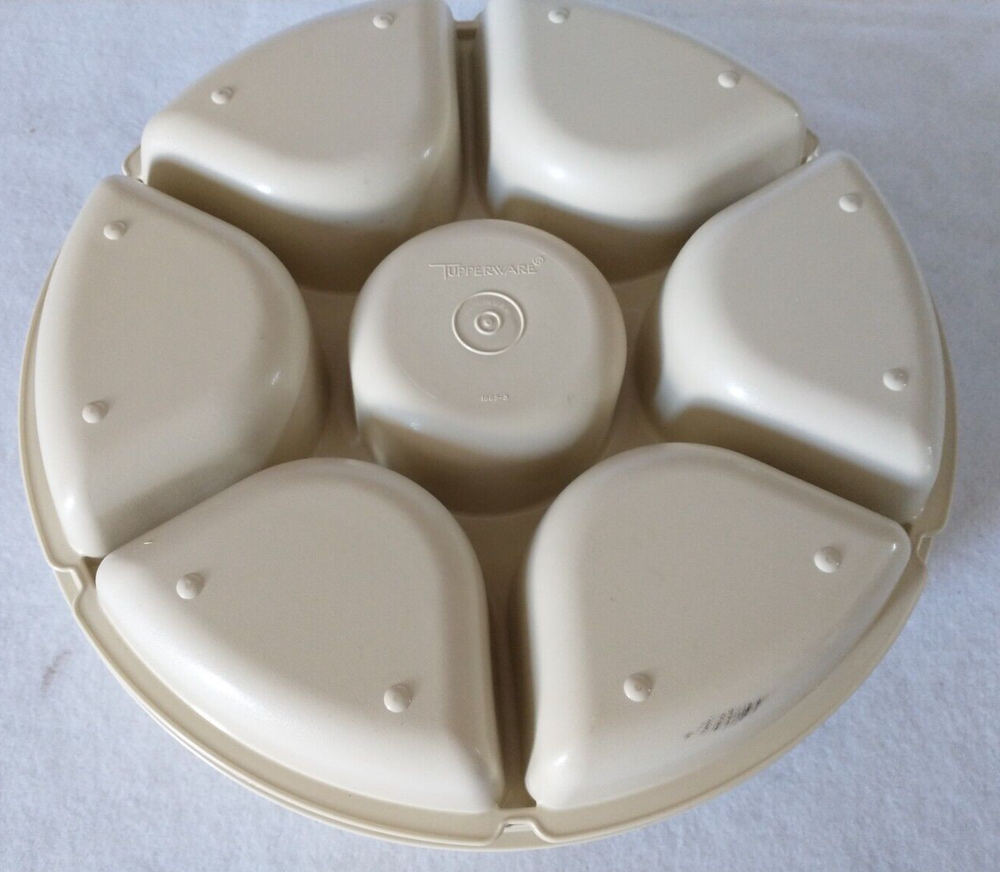Tupperware Divided Serving Tray With Lid Center Dip Bowl With Lid 4 Pieces (Tray, Dip Bowl, Lid, and Cover) 6 compartments for fruits, veggies, etc. 1 center compartment for dip bowl Vintage Beige Pre...