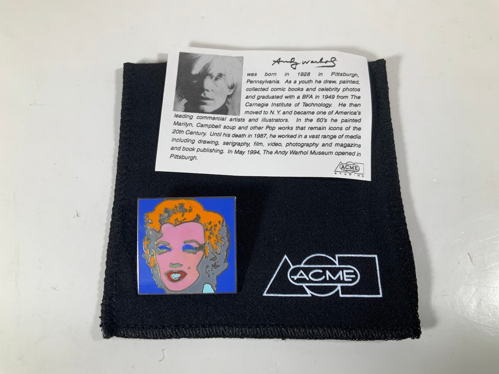 Vintage ACME Studio ANDY WARHOL "Marilyn" Brooch NEW Rare Vintage pin which is part of a collection of pins by Andy Warhol. This one was licensed by the High Museum of Art. Made in the 1990s. Never been worn, in excellent condition but the back shows its age as shown. Comes in an original black ACME flannel pouch. About ACME Studio Started in 1985, ACME Studio is an international product design company, producing and marketing writing instruments, and other design objects. Its products are the result of cooperation with the world’s leading architects, designers, artists, foundations, estates and institutions. ACME Studio has a habit of producing limited editions and/or discontinuing products and destroying the molds – this causes items to become very unique and collectible. Check out our eBay storefront for more ACME Studio products! https://www.ebay.com/str/designmafiastore WE COMBINE SHIPPING! Upon payment we will pack a multiple item order to determine actual shipping cost so that we can then 'rebate' the appropriate combined shipping amount from the purchase payment in reasonable time. Any requests from buyer requiring any special packing and/or boxing, product packaging, or anything relating to combined shipping may incur an additional handling fee. Buyer will be notified in advance.