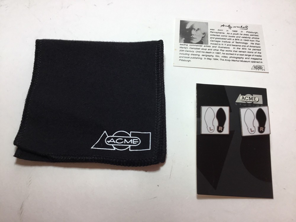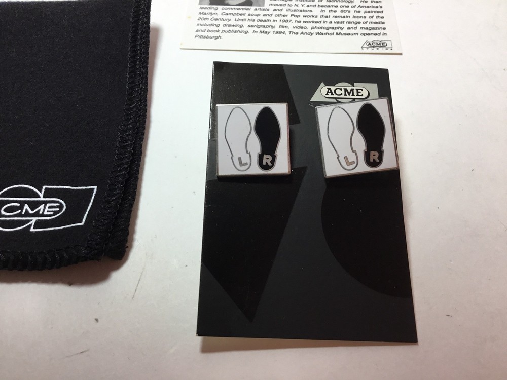 Vintage Andy Warhol "Dance Diagram" Earrings NEW This piece was originally licensed by The Andy Warhol Foundation for the Visual Arts. Old new stock. Never used still in its original packaging. Comes in a black ACME flannel pouch. All sales final. ABOUT THE ARTIST Andy Warhol (August 6, 1928 – February 22, 1987) was an American artist who was a leading figure in the visual art movement known as pop art. His works explore the relationship between artistic expression, celebrity culture and advertisement that flourished by the 1960s. After a successful career as a commercial illustrator, Warhol became a renowned and sometimes controversial artist. The Andy Warhol Museum in his native city, Pittsburgh, Pennsylvania, holds an extensive permanent collection of art and archives. It is the largest museum in the United States dedicated to a single artist. About ACME Studio Started in 1985, ACME Studio is an international product design company, producing and marketing writing instruments, and other design objects. Its products are the result of cooperation with the world’s leading architects, designers, artists, foundations, estates and institutions. ACME Studio has a habit of producing limited editions and/or discontinuing products and destroying the molds – this causes items to become very unique and collectible. Check out our eBay storefront for more : http://stores.ebay.com/designmafiastore/ WE COMBINE SHIPPING Any requests from buyer requiring any special packing and/or boxing, product packaging, or anything relating to combined shipping may incur an additional handling fee. Buyer will be notified in advance.