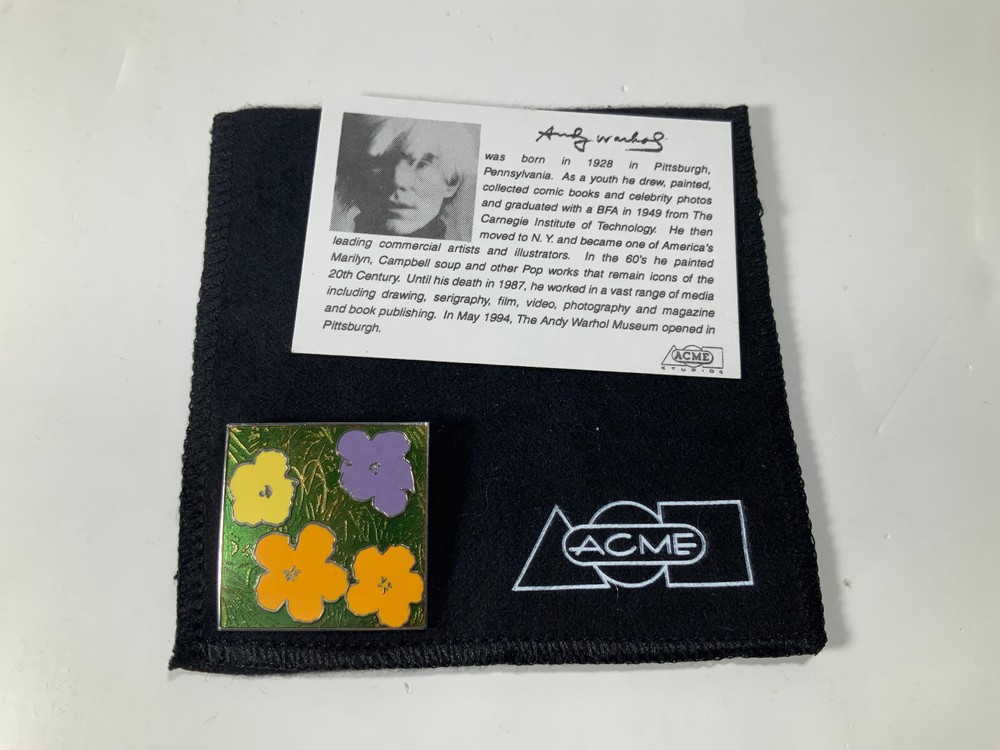 Vintage ACME Studio ANDY WARHOL "Flowers 2" Cloisonné Enamel Brooch RARE Rare Vintage pin which is part of a collection of jewelry by Andy Warhol. This one is even more rare with an alternate color palette for the flowers. This one was licensed by the Andy Warhol Foundation of the visual Arts. Made in the 1990s. Never been worn, in excellent condition. Comes in a black ACME flannel pouch. About ACME Studio Started in 1985, ACME Studio is an international product design company, producing and marketing writing instruments, and other design objects. Its products are the result of cooperation with the world’s leading architects, designers, artists, foundations, estates and institutions. ACME Studio has a habit of producing limited editions and/or discontinuing products and destroying the molds – this causes items to become very unique and collectible. Check out our eBay storefront for more ACME Studio products! https://www.ebay.com/str/designmafiastore WE COMBINE SHIPPING! Upon payment we will pack a multiple item order to determine actual shipping cost so that we can then 'rebate' the appropriate combined shipping amount from the purchase payment in reasonable time. Any requests from buyer requiring any special packing and/or boxing, product packaging, or anything relating to combined shipping may incur an additional handling fee. Buyer will be notified in advance.