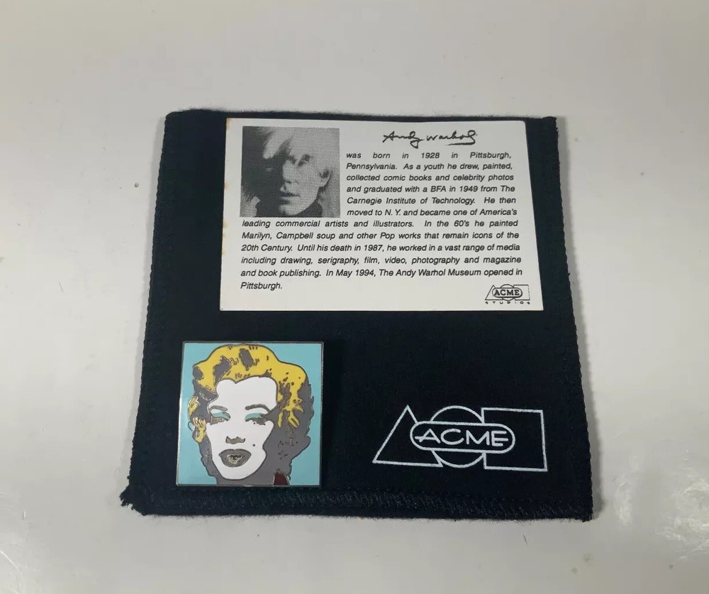 Vintage ACME Studio ANDY WARHOL "Marilyn Light Blue" Cloisonné Enamel Brooch Rare Vintage brooch which is part of a collection of jewelry by Andy Warhol. Made in the 1990s licensed by The ANDY WARHOL Foundation for the Visual Arts. Never been worn, in excellent condition, but the back shows its age. Comes in an original black ACME flannel pouch. About ACME Studio Started in 1985, ACME Studio is an international product design company, producing and marketing writing instruments, and other design objects. Its products are the result of cooperation with the world’s leading architects, designers, artists, foundations, estates and institutions. ACME Studio has a habit of producing limited editions and/or discontinuing products and destroying the molds – this causes items to become very unique and collectible. Check out our eBay storefront for more ACME Studio products! https://www.ebay.com/str/designmafiastore WE COMBINE SHIPPING! Upon payment we will pack a multiple item order to determine actual shipping cost so that we can then 'rebate' the appropriate combined shipping amount from the purchase payment in reasonable time. Any requests from buyer requiring any special packing and/or boxing, product packaging, or anything relating to combined shipping may incur an additional handling fee. Buyer will be notified in advance.