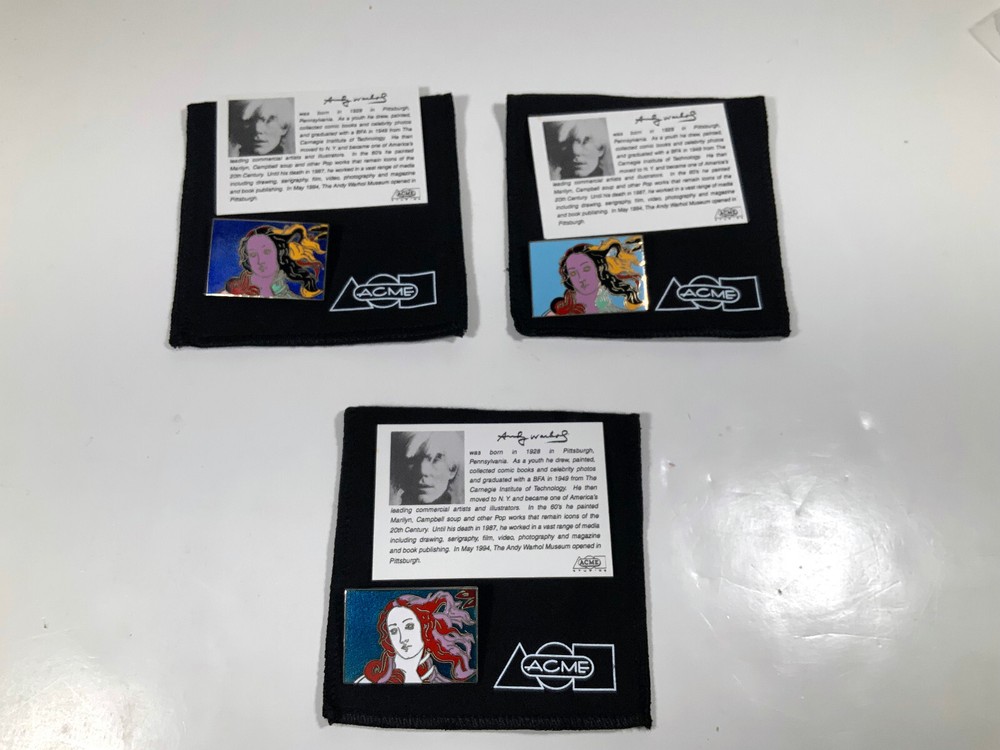 Vintage ACME Studio ANDY WARHOL "Venus" 3 pc. Enamel Brooch Set Incredibly rare set of 3 Cloisonné enamel brooches of Andy Warhol’s “Venus”. Produced in the 1990s under a license from the Andy Warhol Foundation for the Visual Arts . In NEW never used condition, but show tarnish from their age, as shown, which could be removable, but we prefer to leave things as we find them. Each one comes in its original flannel pouch and Artist bio card. About ACME Studio Started in 1985, ACME Studio is an international product design company, producing and marketing writing instruments, and other design objects. Its products are the result of cooperation with the world’s leading architects, designers, artists, foundations, estates and institutions. ACME Studio has a habit of producing limited editions and/or discontinuing products and destroying the molds – this causes items to become very unique and collectible. Check out our eBay storefront for more ACME Studio products! https://www.ebay.com/str/designmafiastore WE COMBINE SHIPPING! Upon payment we will pack a multiple item order to determine actual shipping cost so that we can then 'rebate' the appropriate combined shipping amount from the purchase payment in reasonable time. Any requests from buyer requiring any special packing and/or boxing, product packaging, or anything relating to combined shipping may incur an additional handling fee. Buyer will be notified in advance.