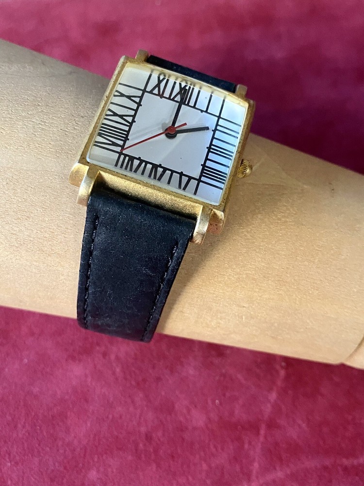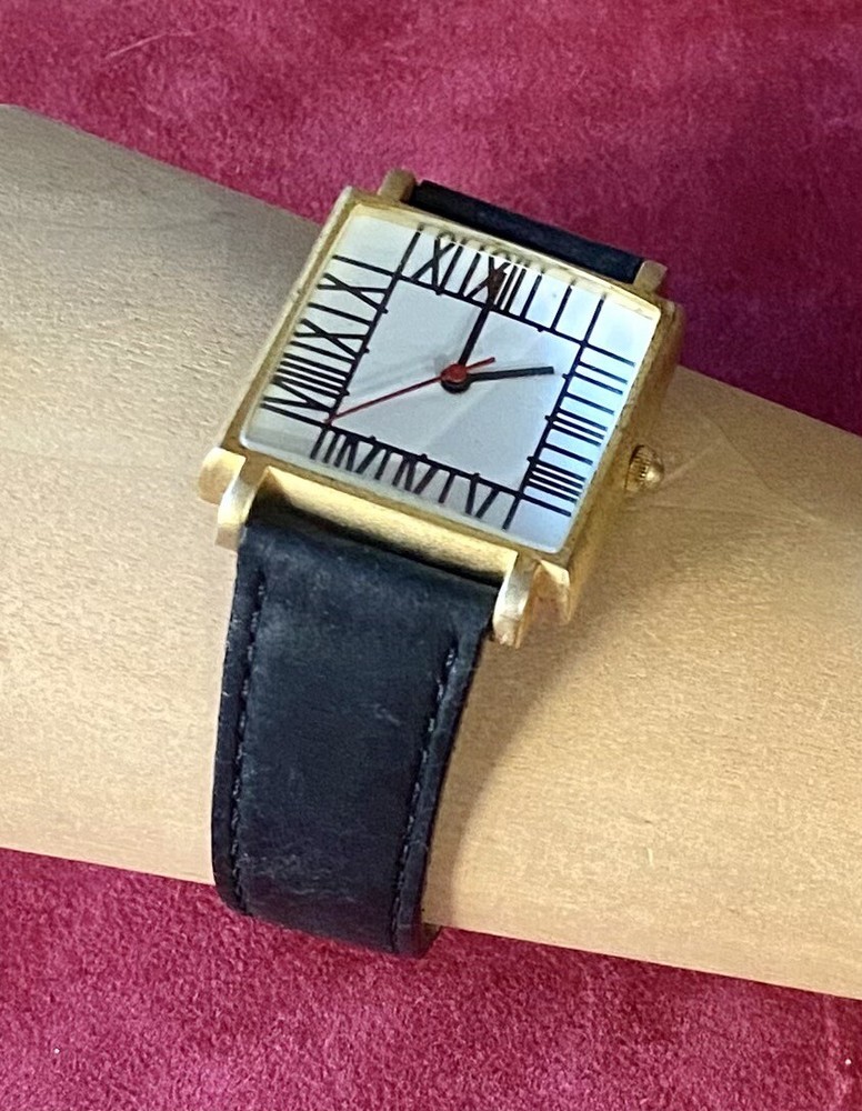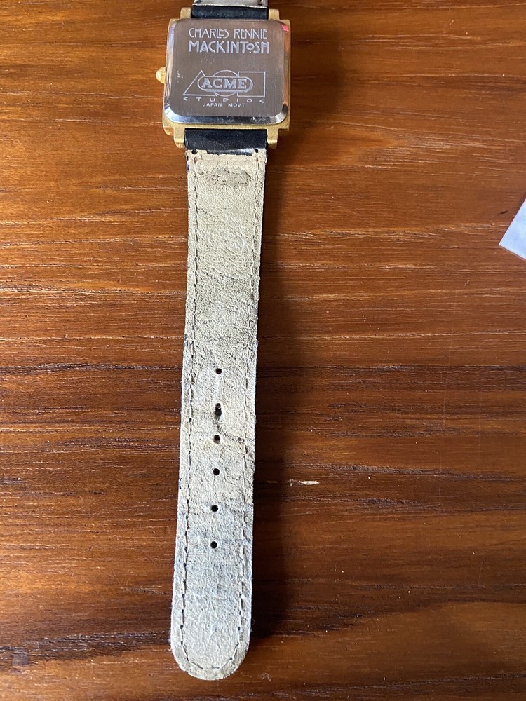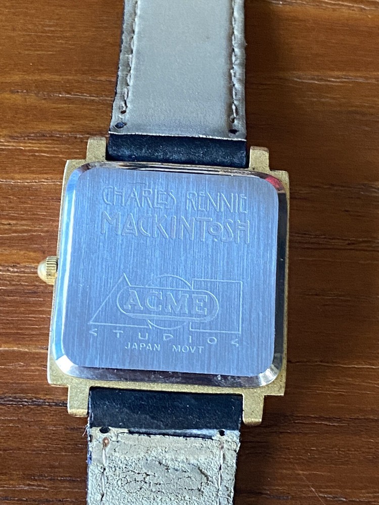 Add a touch of vintage sophistication to your wrist with the ACME Studio CHARLES RENNIE MACKINTOSH Wrist Watch "Mackintosh I". The square-shaped gold case features a matte finish and showcases a white or black dial with Roman numerals and a seconds hand. The watch is handmade with a limited edition design and is equipped with a quartz movement for precise timekeeping. The black leather band with a buckle closure adds a classic touch to the overall design. This unisex vintage watch from the 1990s is a great addition to any watch collection. It comes with its original box and packaging, making it a perfect gift for any watch enthusiast. The watch features mineral crystal and has an unknown level of water resistance. With its timeless style, it is suitable for any occasion and is sure to impress. Fun vintage watch! needs battery. shows some wear to the band and gold finish, see photos! glass is in great shape! AS IS.