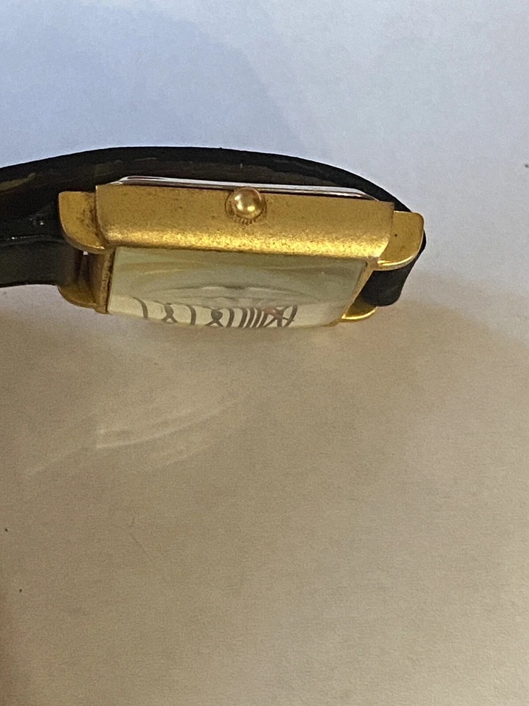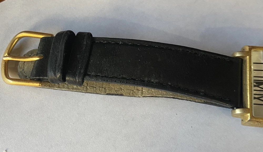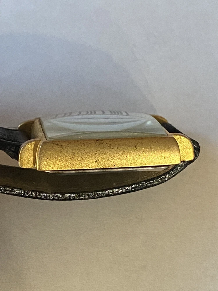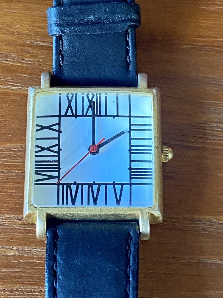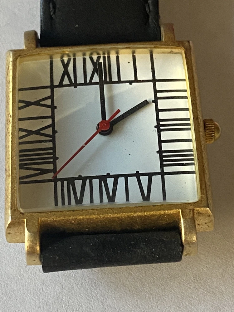 Add a touch of vintage sophistication to your wrist with the ACME Studio CHARLES RENNIE MACKINTOSH Wrist Watch "Mackintosh I". The square-shaped gold case features a matte finish and showcases a white or black dial with Roman numerals and a seconds hand. The watch is handmade with a limited edition design and is equipped with a quartz movement for precise timekeeping. The black leather band with a buckle closure adds a classic touch to the overall design. This unisex vintage watch from the 1990s is a great addition to any watch collection. It comes with its original box and packaging, making it a perfect gift for any watch enthusiast. The watch features mineral crystal and has an unknown level of water resistance. With its timeless style, it is suitable for any occasion and is sure to impress. Fun vintage watch! needs battery. shows some wear to the band and gold finish, see photos! glass is in great shape! AS IS.