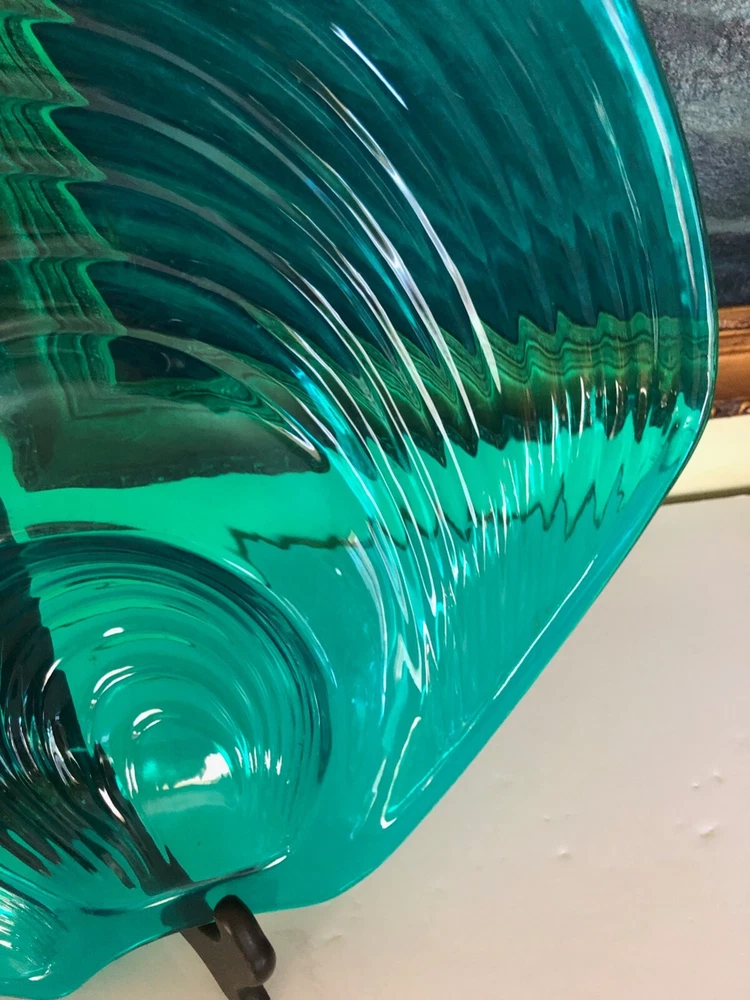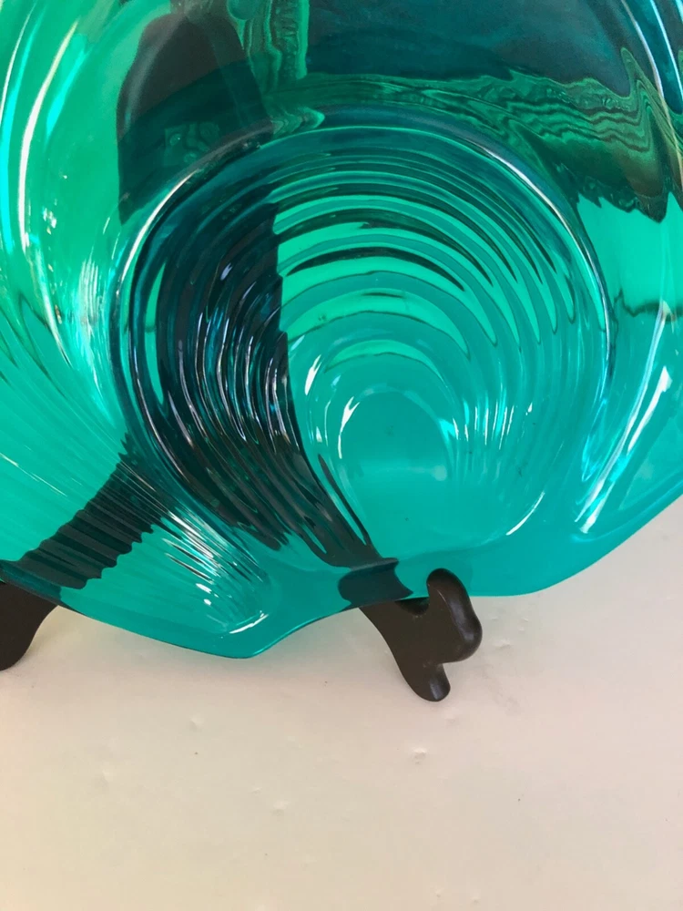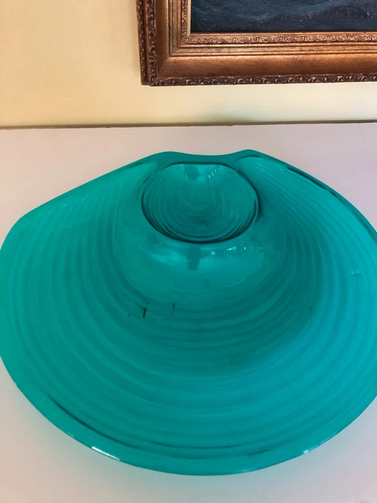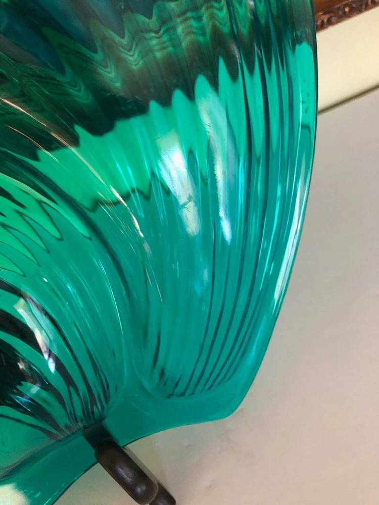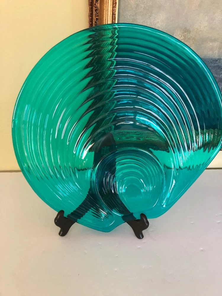 VINTAGE RIBBED ACRYLIC/LUCITE /PLASTIC SHELL CHIP AND DIP DISH VERY STURDY MORE TEAL GREEN THAN BLUE APPROX. 14 1/4" TALL - 15" AT THE WIDEST POINT UNMARKED - TRAY IS GOOD AND PRETTY BUT HAS SCRATCHES TO THE BOTTOM