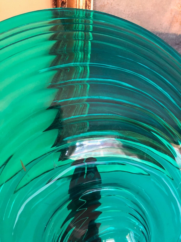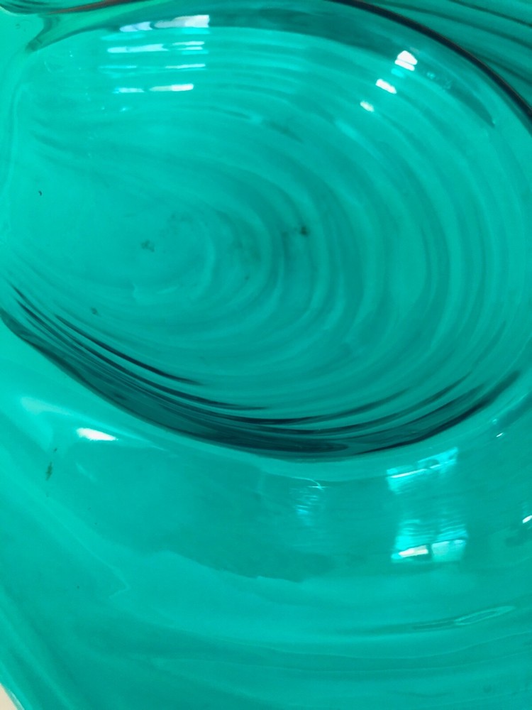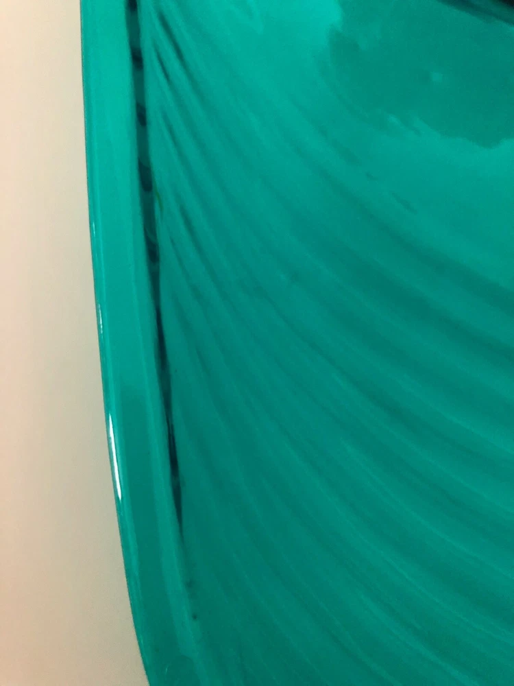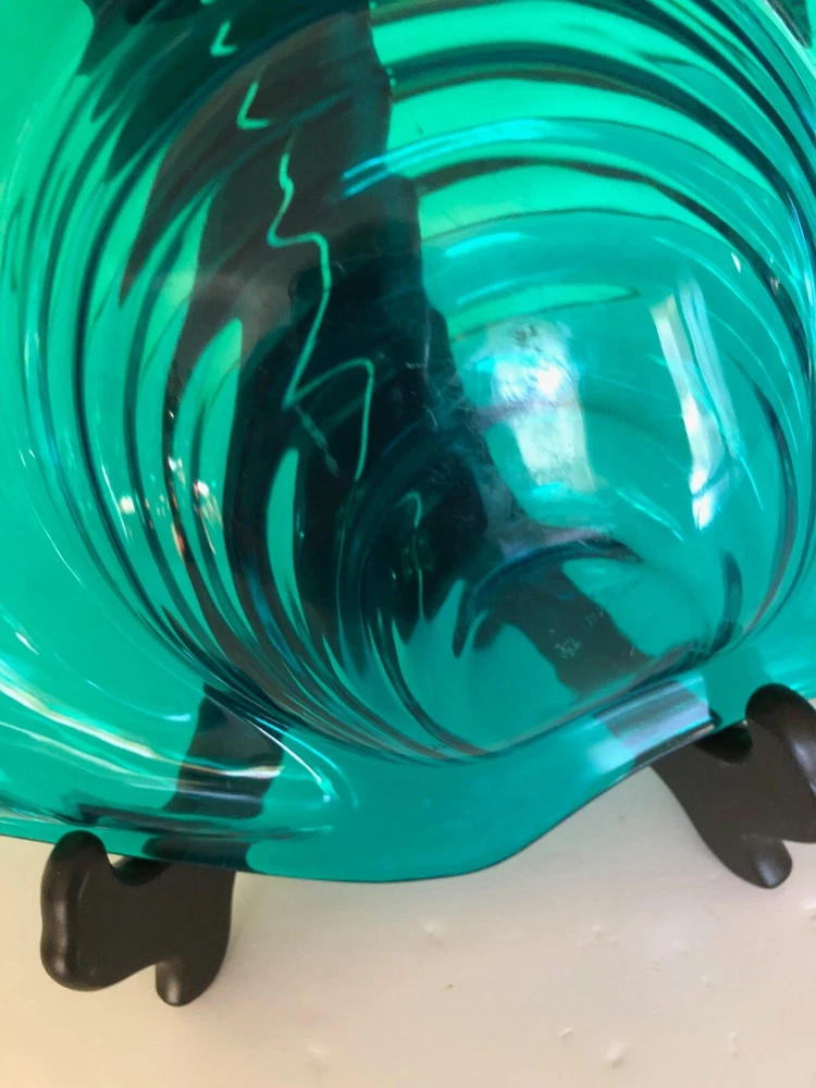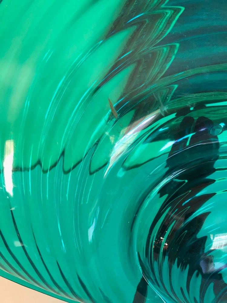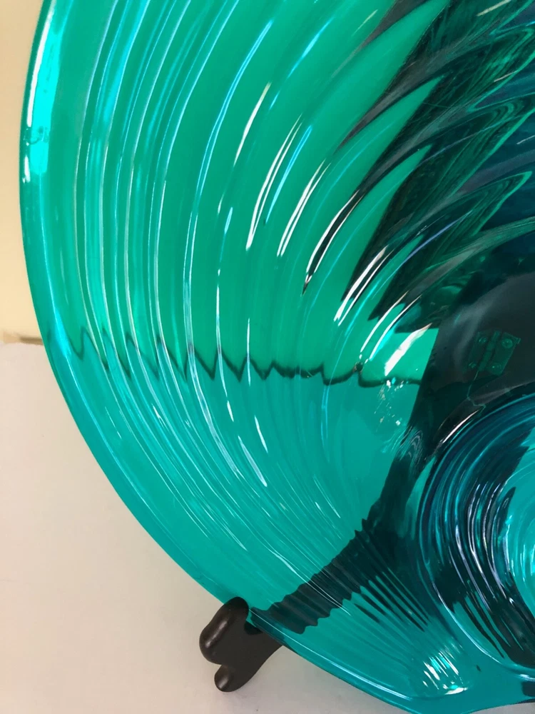 VINTAGE RIBBED ACRYLIC/LUCITE /PLASTIC SHELL CHIP AND DIP DISH VERY STURDY MORE TEAL GREEN THAN BLUE APPROX. 14 1/4" TALL - 15" AT THE WIDEST POINT UNMARKED - TRAY IS GOOD AND PRETTY BUT HAS SCRATCHES TO THE BOTTOM
