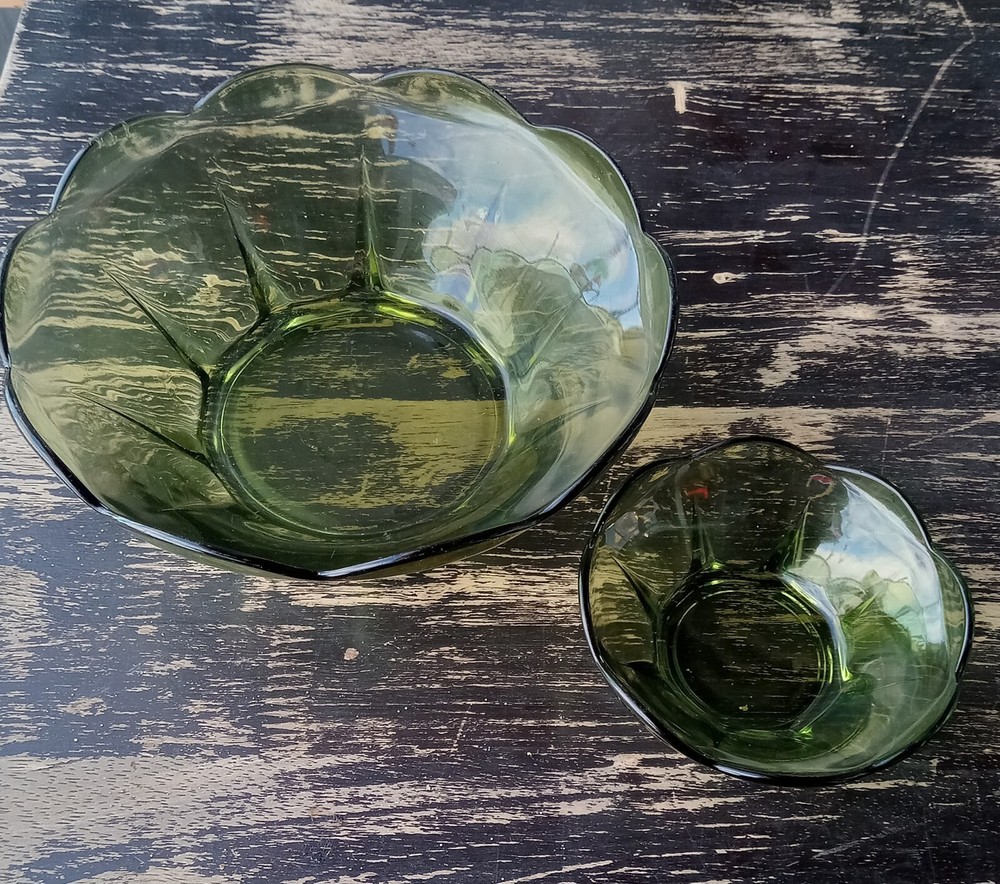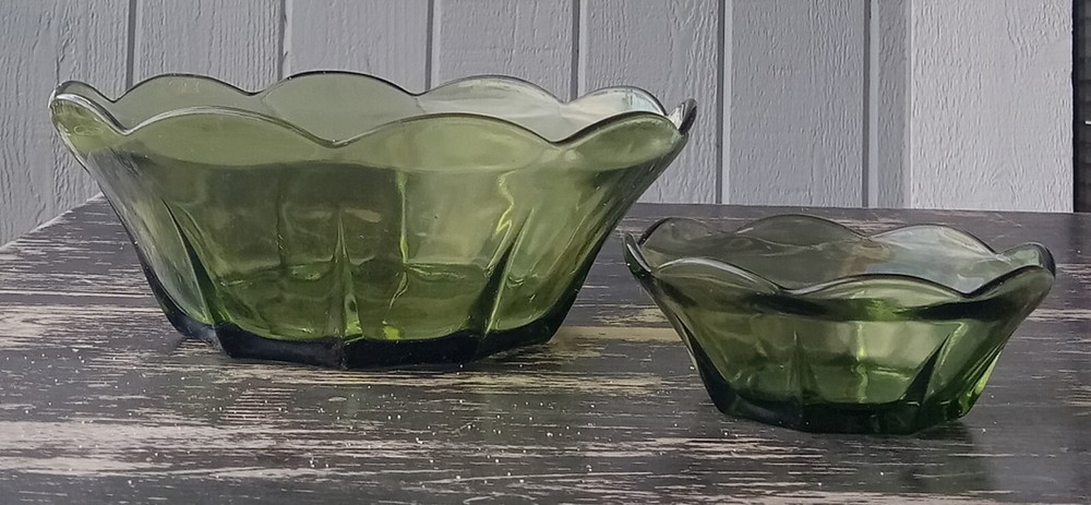 This vintage Anchor Hocking bowl set is perfect for serving chips and dip at your next party. The set includes both large and small bowls made of avocado green glass. The brand, Anchor Hocking, is known for its quality glassware and this set is no exception. The bowls feature a retro pattern that will add a touch of nostalgia to your kitchen decor. The set is perfect for those who appreciate vintage items or those who simply want a unique addition to their serveware collection. The bowls are in great shape and will be a great addition to any home. Don't miss out on this opportunity to own a piece of retro history. Large bowl 3 x 8 x 8in Small Bowl 1.75 x 4.5 x 4.5in
