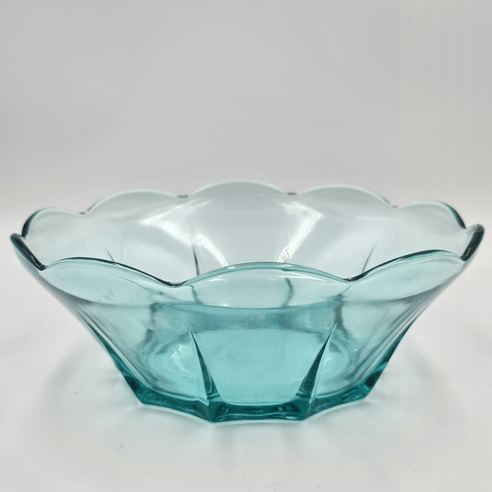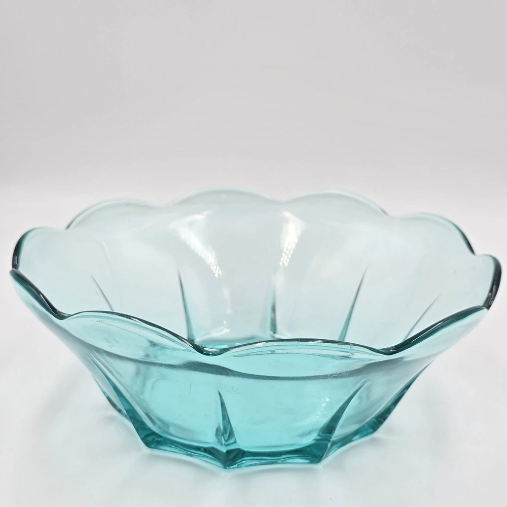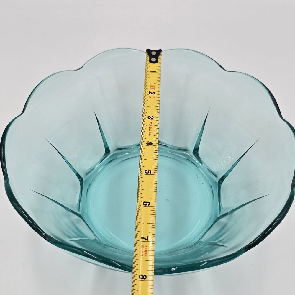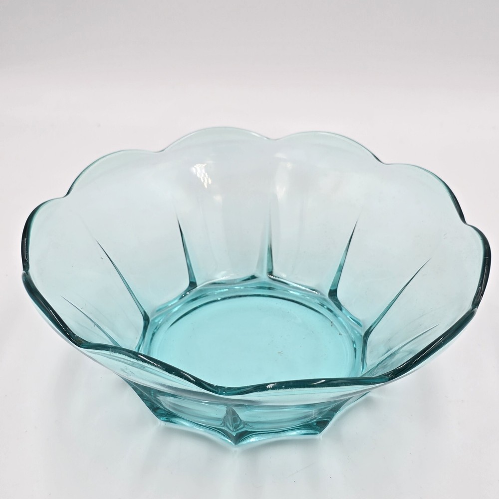 This vintage Anchor Hocking Swedish Modern aquamarine chip and dip set features a large bowl perfect for serving your favorite snacks. The beautiful aquamarine blue color adds a touch of elegance to any table setting, and the dipping bowls included in the set make it easy to serve a variety of dips and sauces. The set is made of high-quality glass, ensuring it will last for years to come. Perfect for entertaining or everyday use, this set is a must-have for any home. LARGE BOWL ONLY