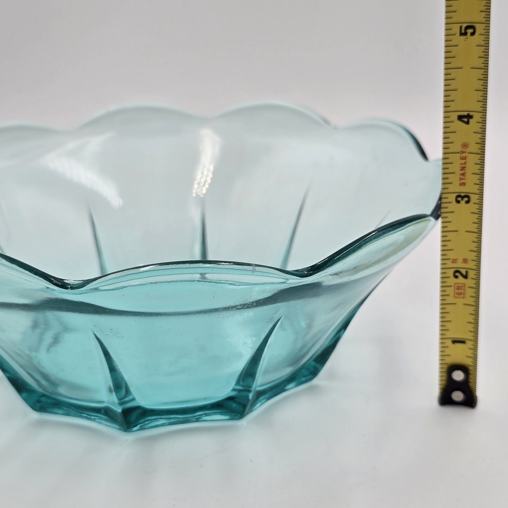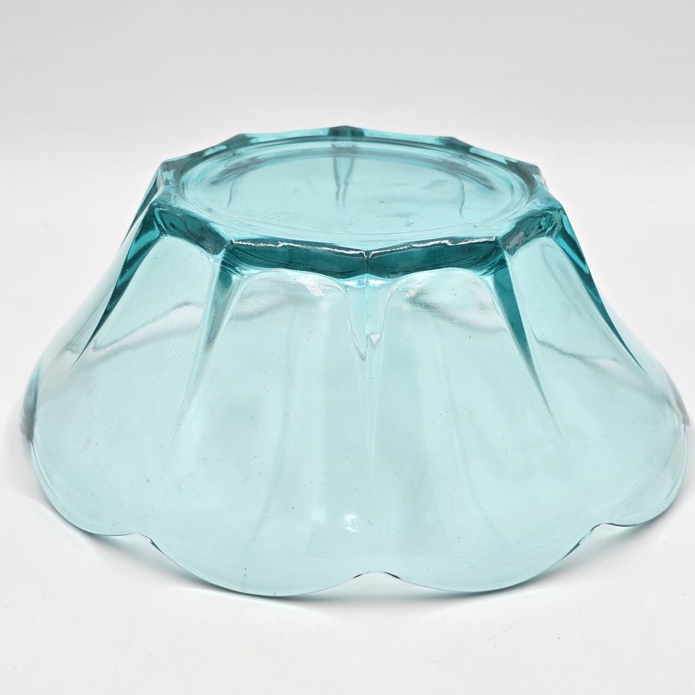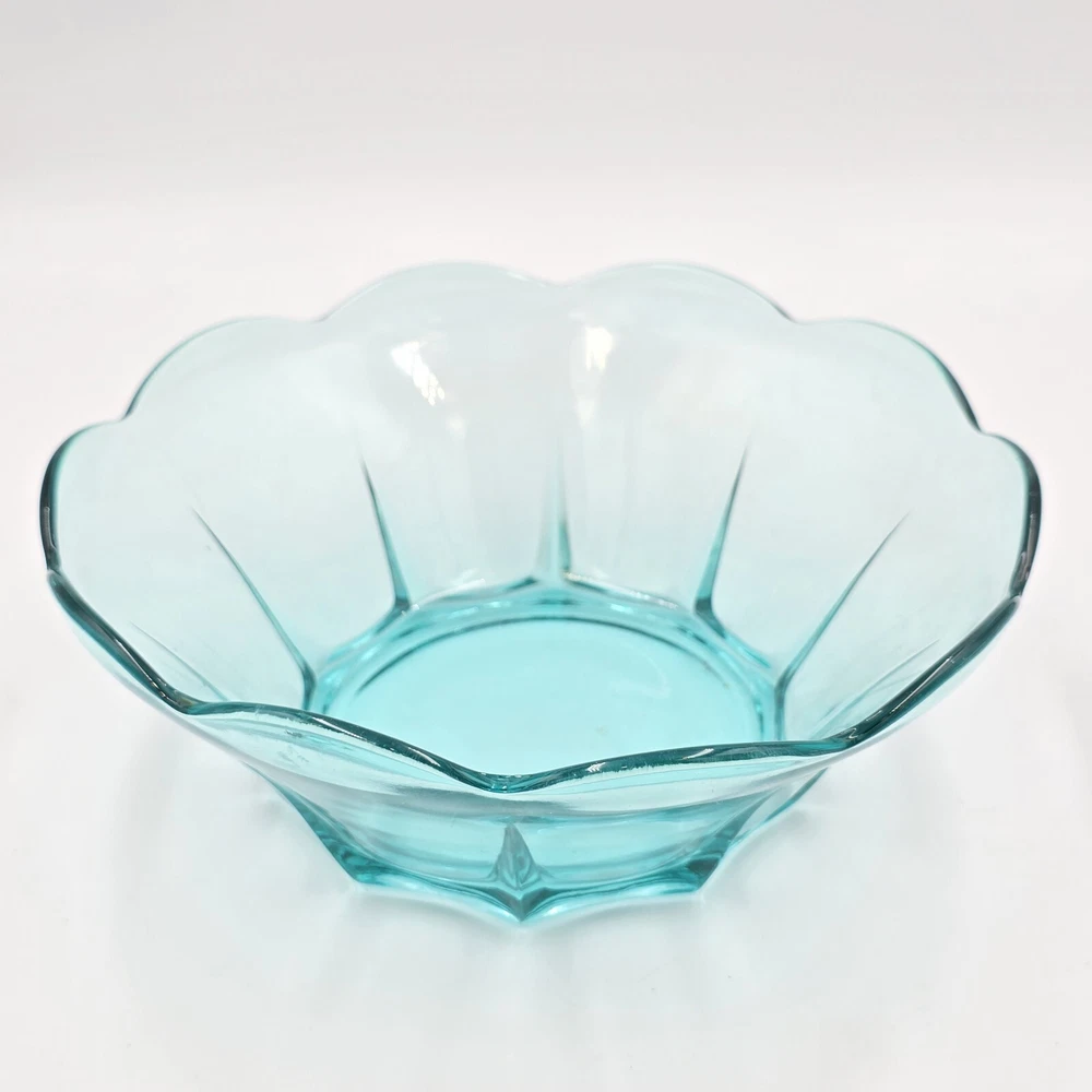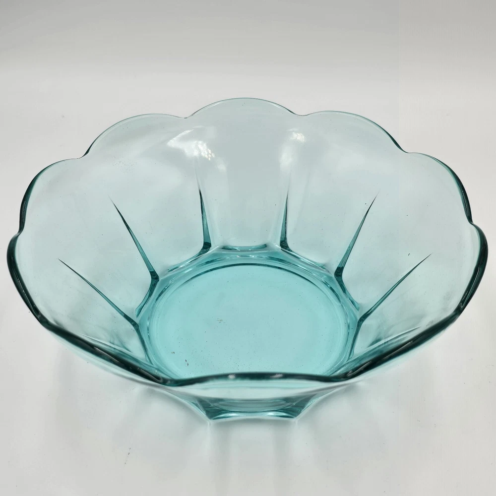 This vintage Anchor Hocking Swedish Modern aquamarine chip and dip set features a large bowl perfect for serving your favorite snacks. The beautiful aquamarine blue color adds a touch of elegance to any table setting, and the dipping bowls included in the set make it easy to serve a variety of dips and sauces. The set is made of high-quality glass, ensuring it will last for years to come. Perfect for entertaining or everyday use, this set is a must-have for any home. LARGE BOWL ONLY