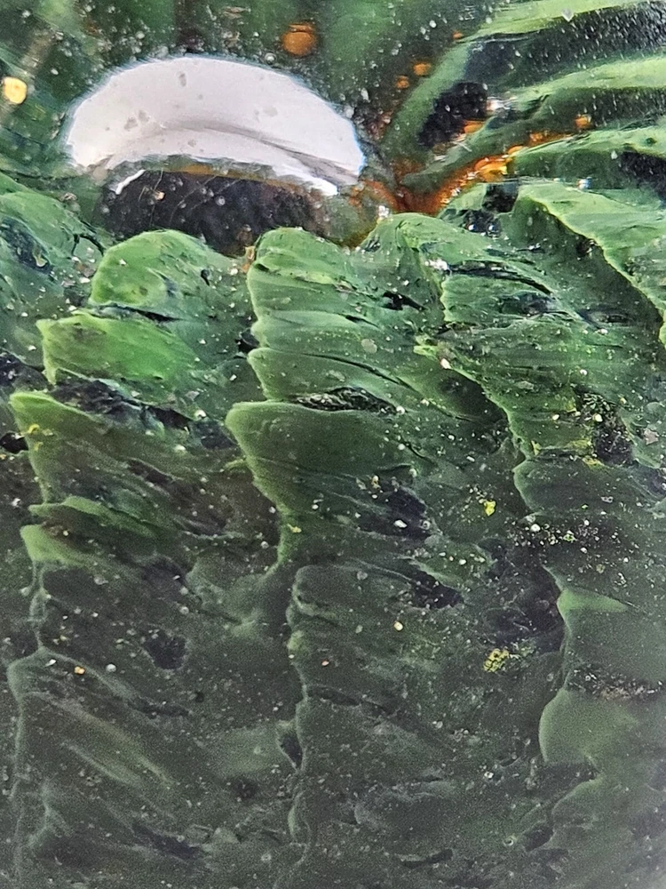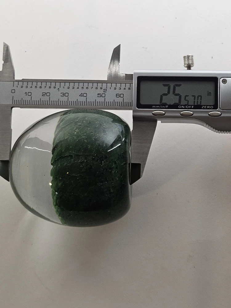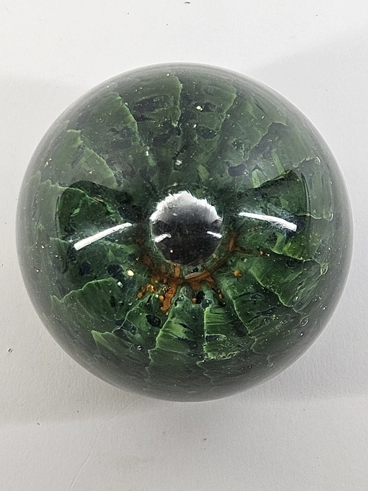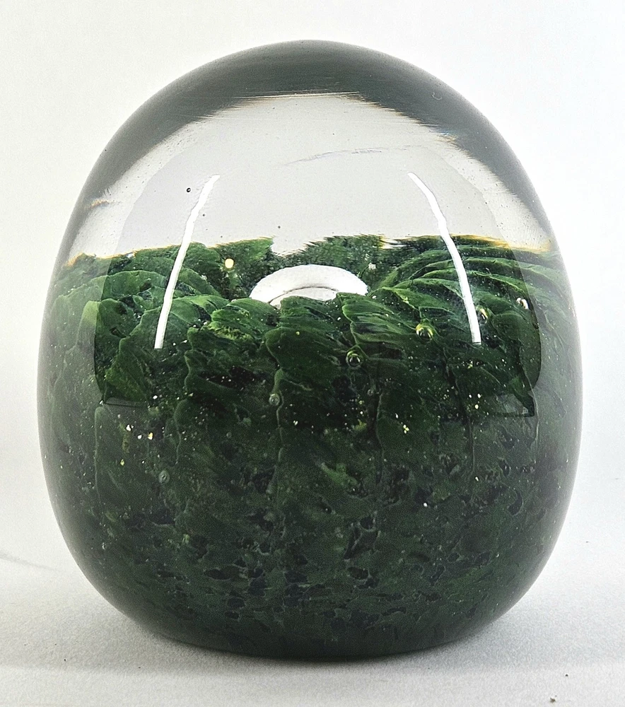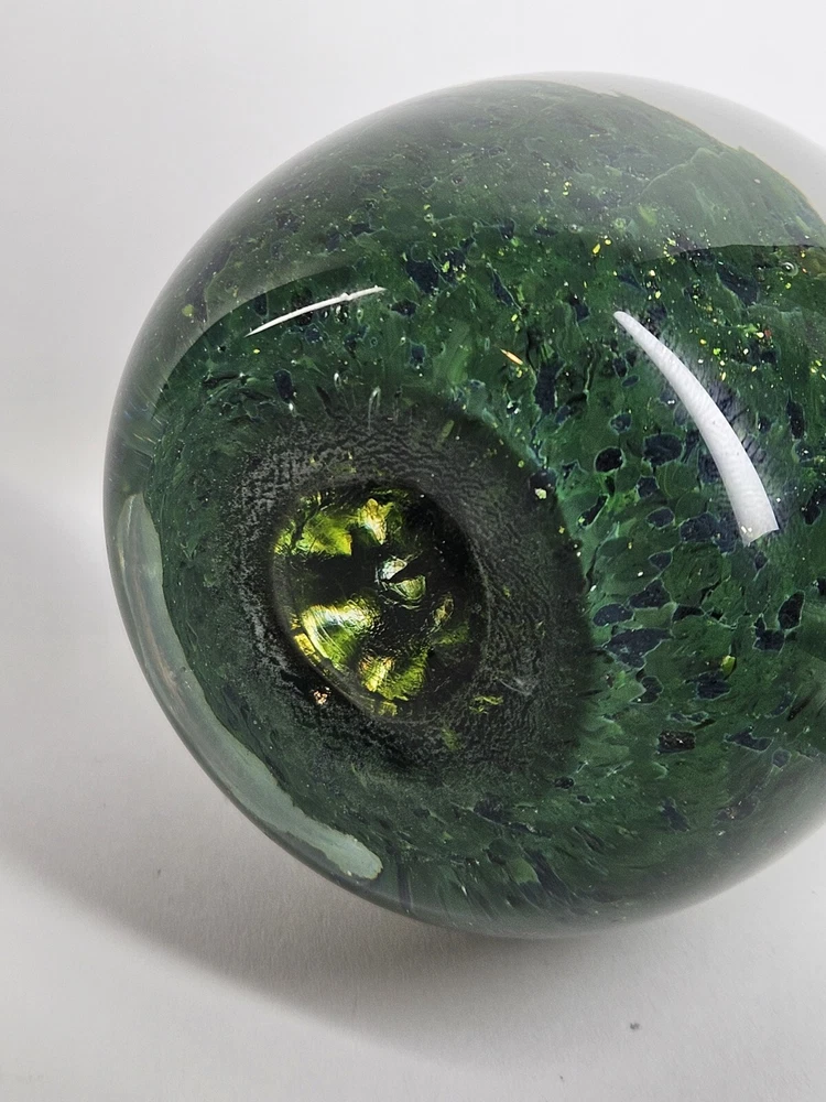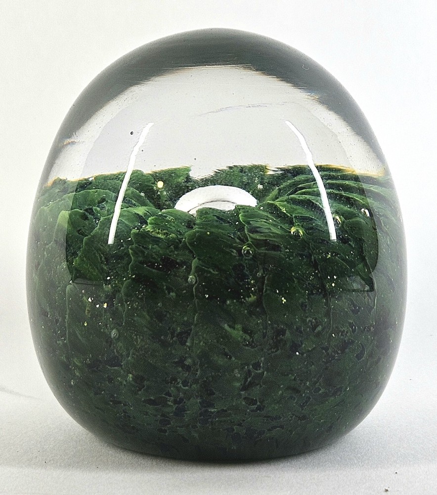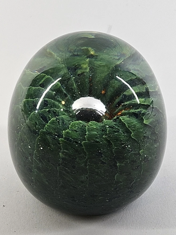 This vintage paperweight is a unique addition to any collection. With an oval egg shape and sparkling green swirl, it is sure to catch the eye. The air bubble inside the glass adds a touch of elegance and the unmarked brand adds to the mystery. Its production style is art glass and it was studio crafted, making it a one-of-a-kind piece. The abstract theme and contemporary style make it a beautiful decorative item for any room. Its era and country/region of manufacture are unknown, adding to the intrigue of this vintage paperweight. Excellent overall condition. 2.5" in height and 2.4" in diameter.