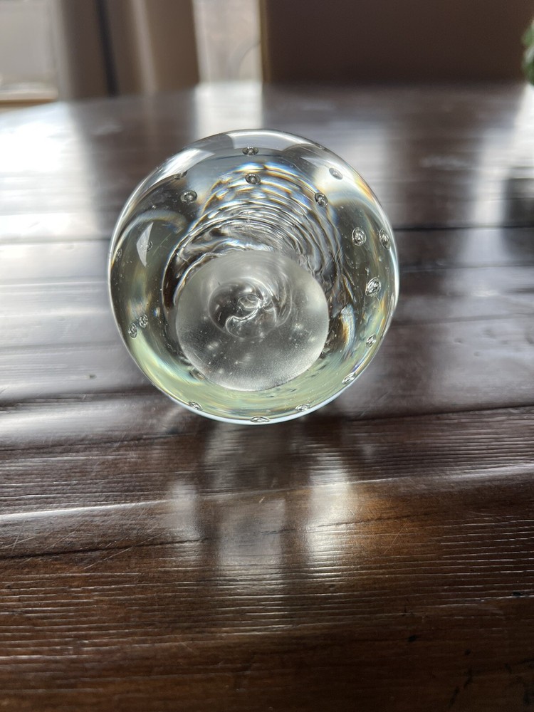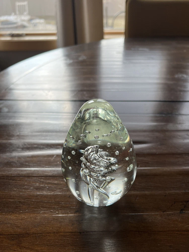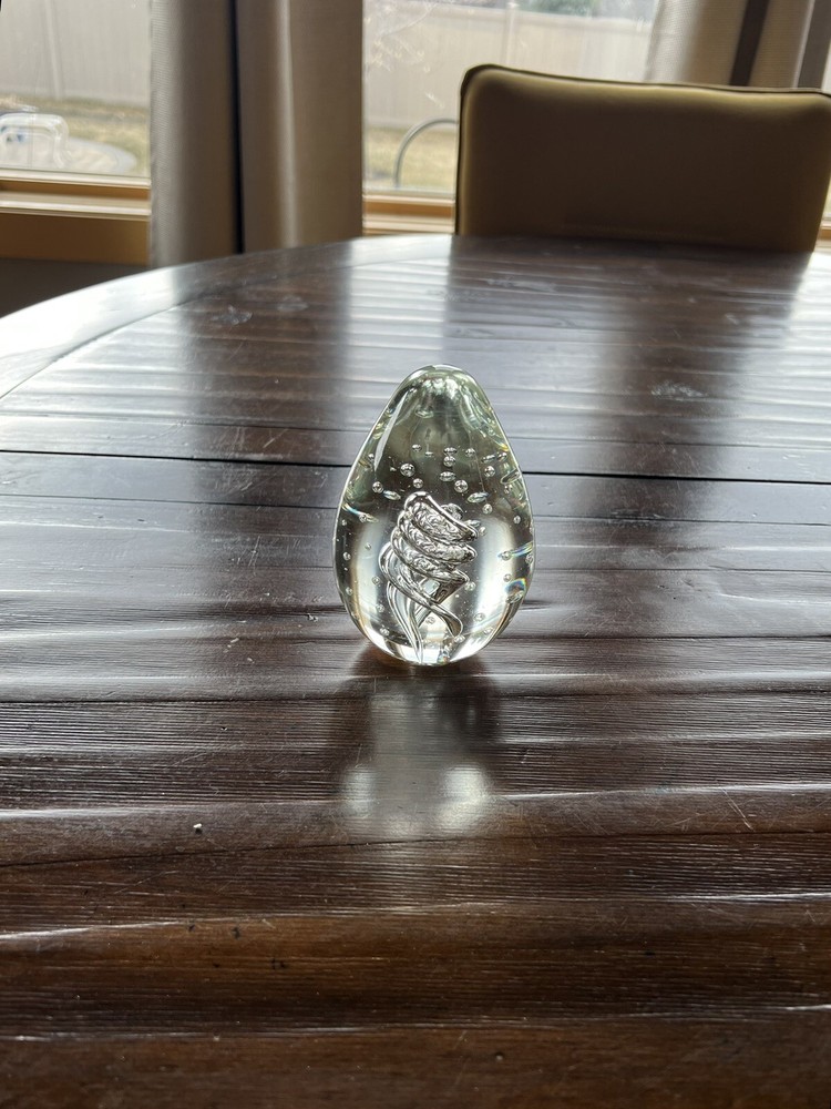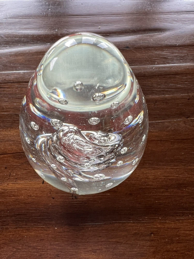 Vintage Art Studio Glass Egg-Shaped Spiral Clear Glass Paperweight. Controlled bubbles. Art piece. Measurements: 5” Tall and 3.5” at its widest point....