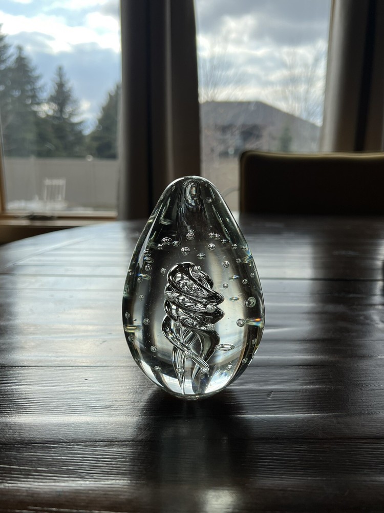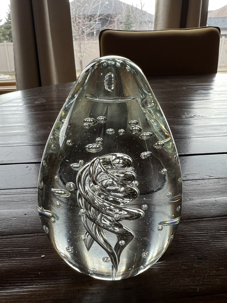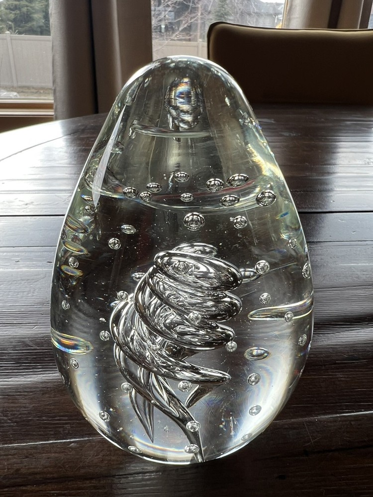 Vintage Art Studio Glass Egg-Shaped Spiral Clear Glass Paperweight. Controlled bubbles. Art piece. Measurements: 5” Tall and 3.5” at its widest point.
