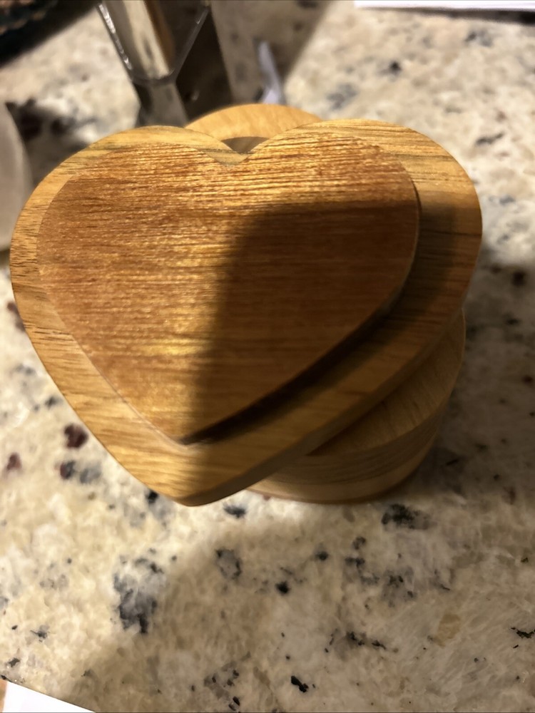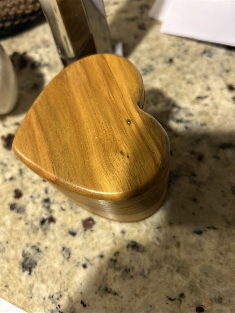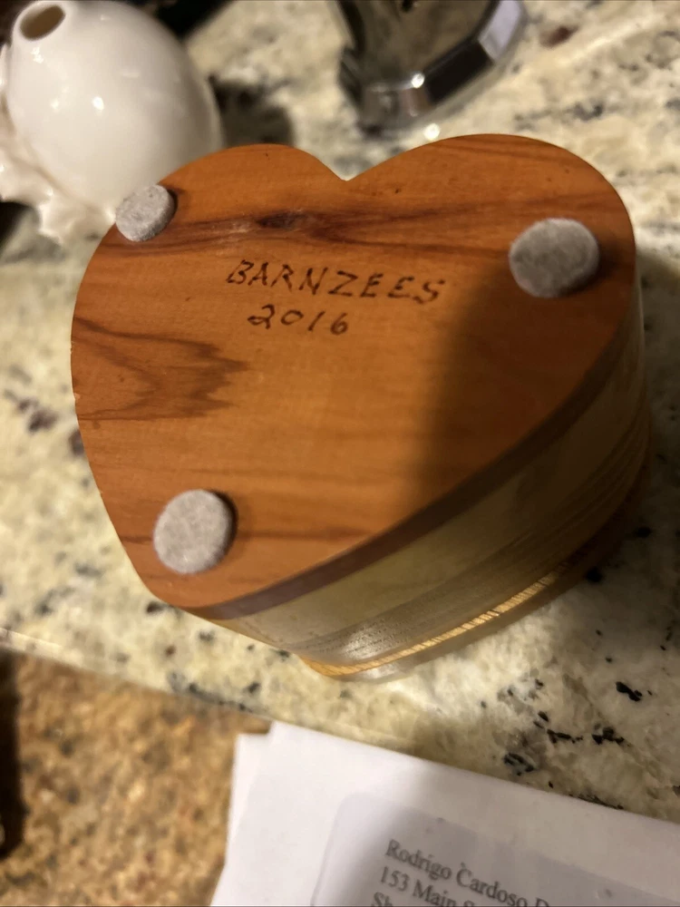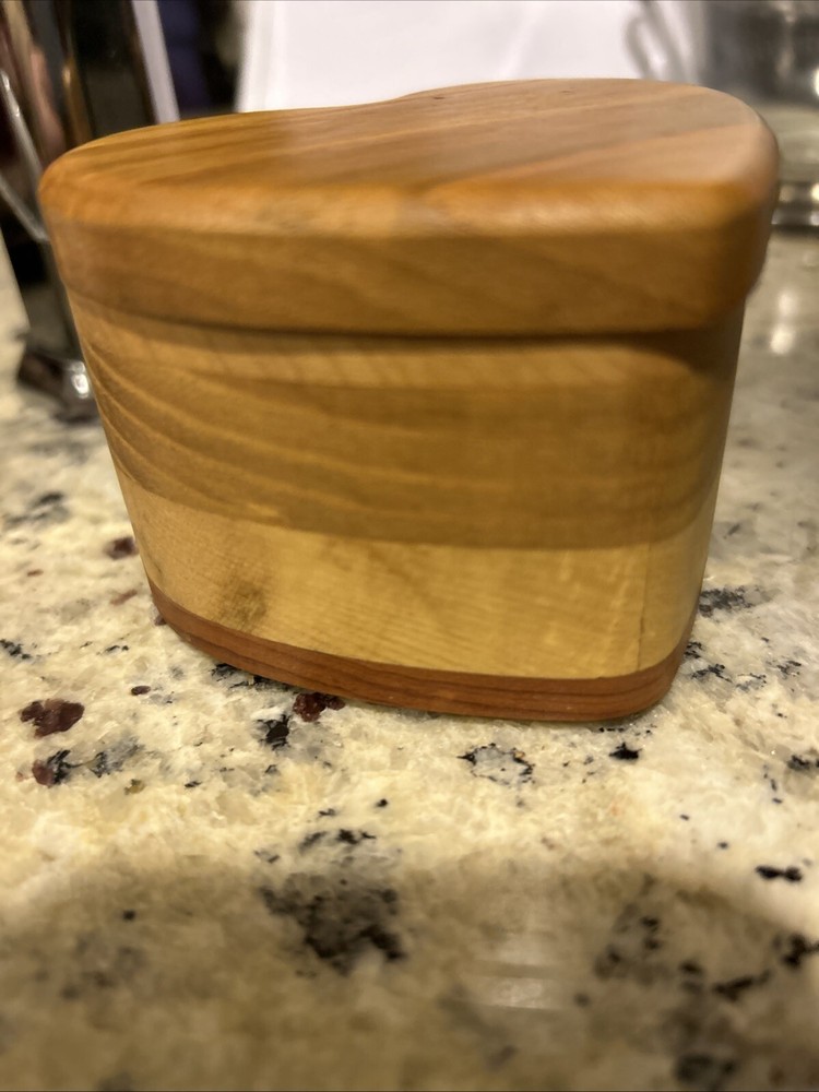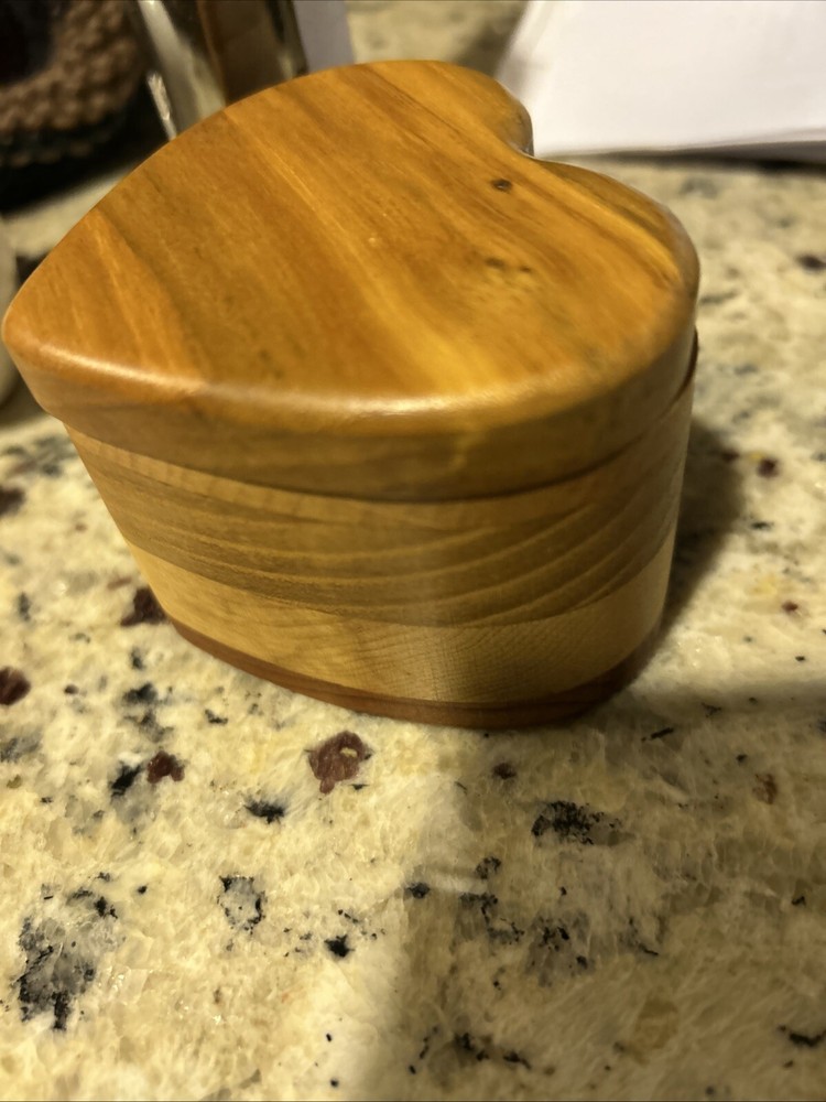 This vintage Art Studio trinket box by Barnzees Woodcraft features a heart-shaped design measuring 3x2.5 inches. Crafted from natural grain wood with a contemporary style, this small trinket box is hand made in the United States using Adirondack wood. The matte poly finish gives it a sleek look, making it a perfect decorative piece for any art-themed collection or as a unique gift symbolizing love.