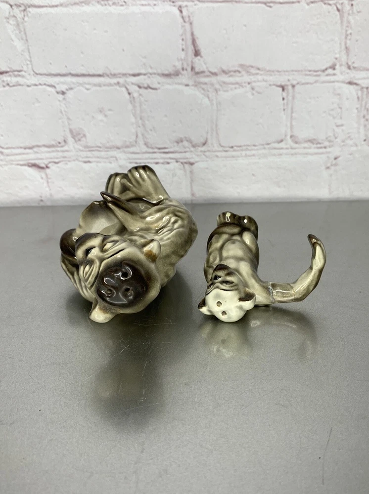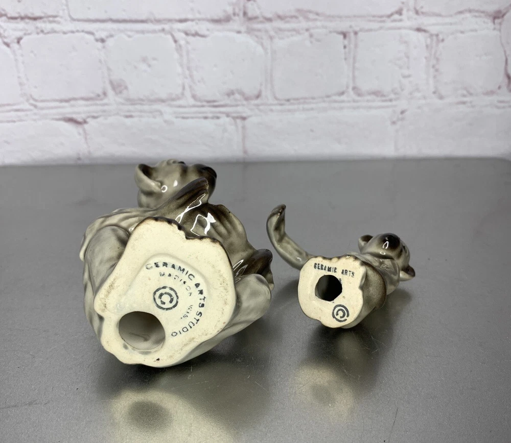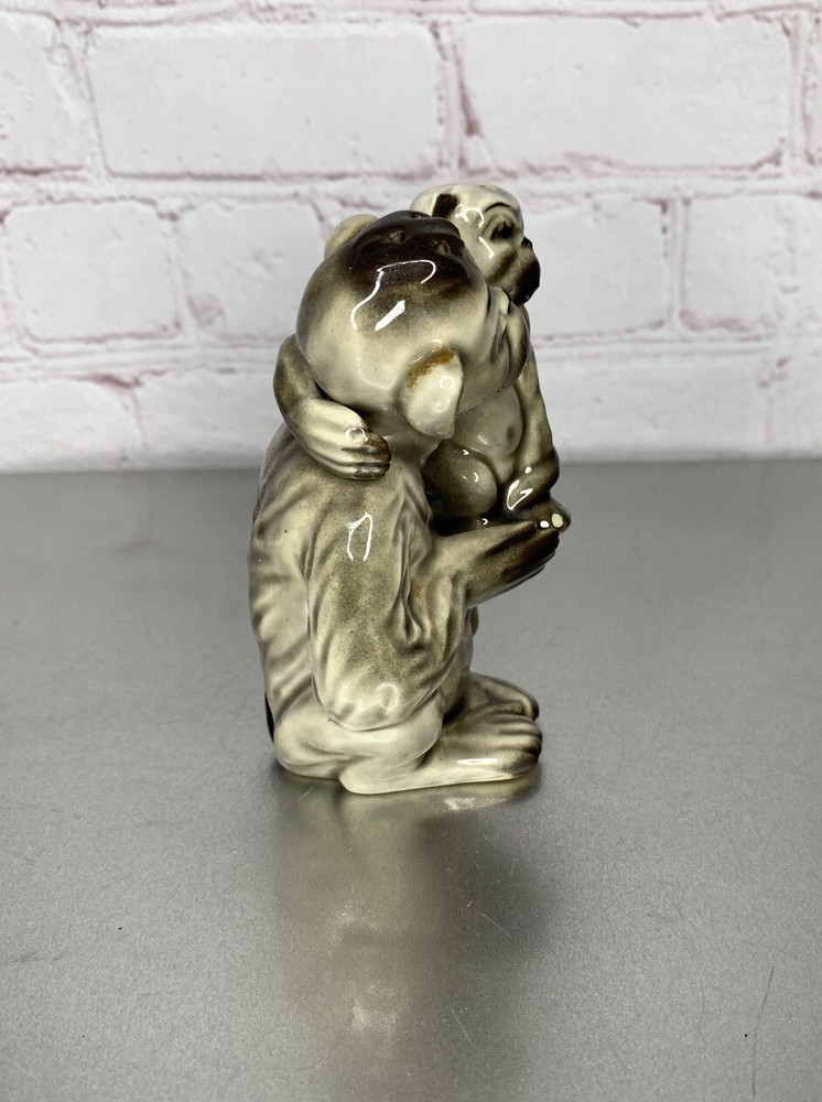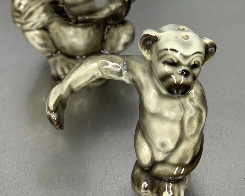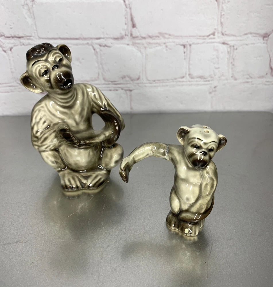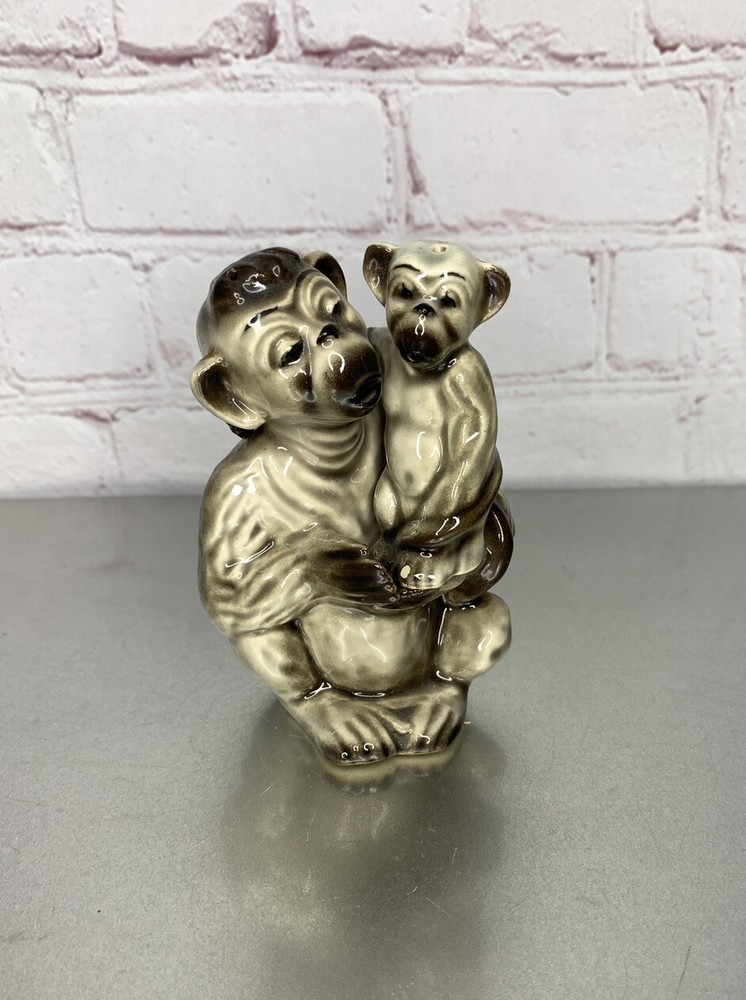 Vintage Art Studio Monkey & Baby Salt & Pepper Shakers USA Good Vintage Condition- Never Used. Displayed Only. No plugs. Original cork plugs deteriorated and were discarded. Please Note-Baby monkeys arm broke and my aunt used some very strong glue to attach arm together. The glue she used back in the day is so strong that the arm is going absolutely nowhere. Unfortunately, she glued arm on slightly crooked. You can’t notice the arm unless you’re looking for it and the shakers nest together without issue. Perfect collectible set to display. Price has been reduced due to imperfection. Please see pics for visual details Approx 4”h x 3”w