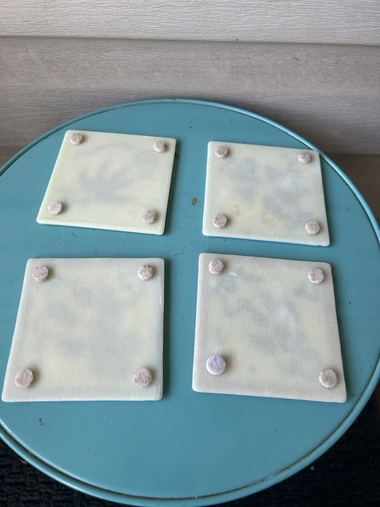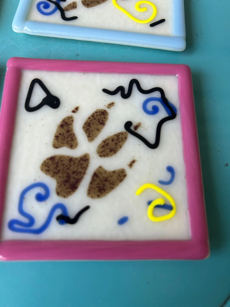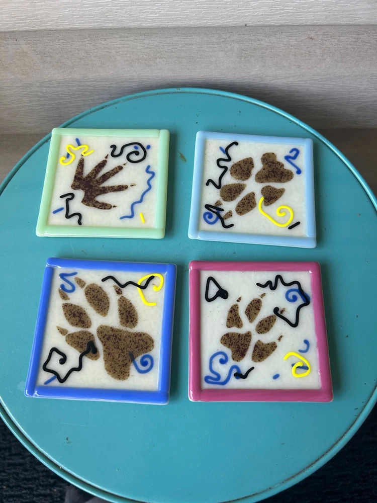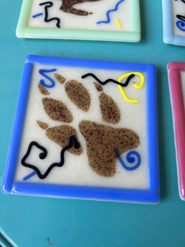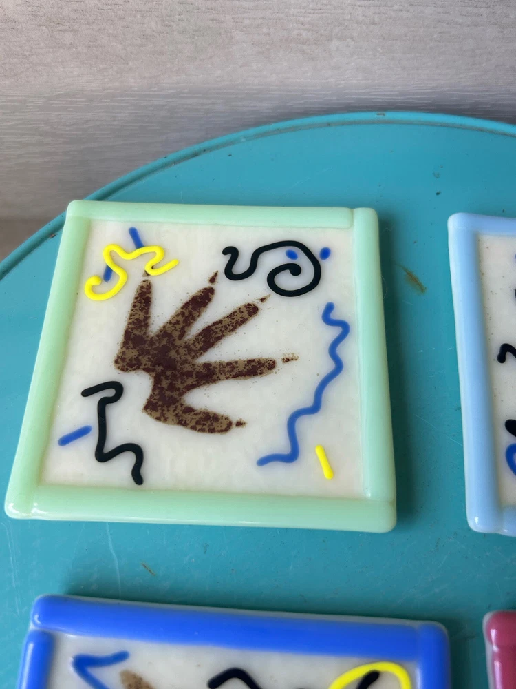 Vintage 1998 Astral Glass Studio Abstract Fused Glass Coasters-Set of 4. Approx. 3 1/2”x 3 1/2”. Each signed Astral Glass Studio on the back. No apparent chips or cracks. Some light scratches as commo...