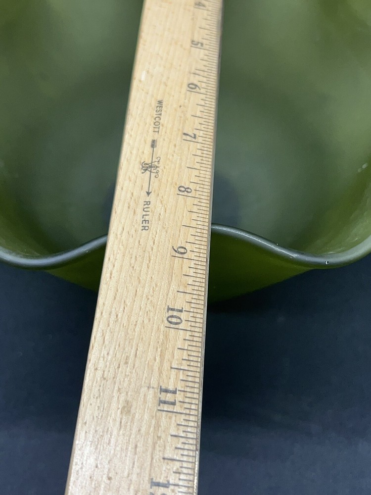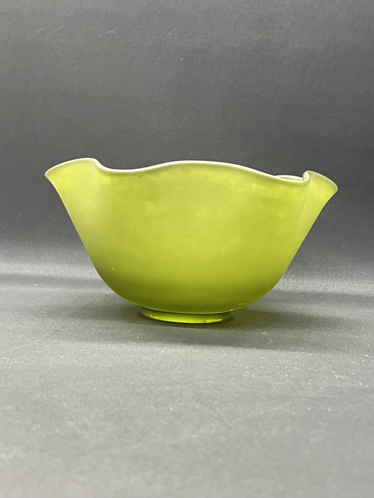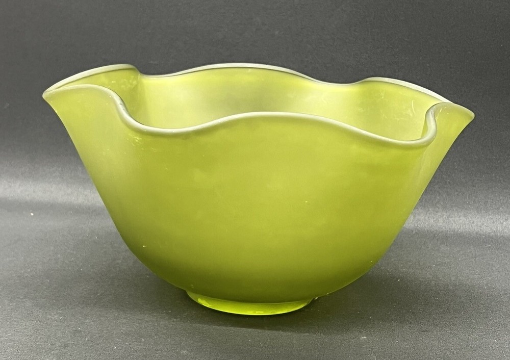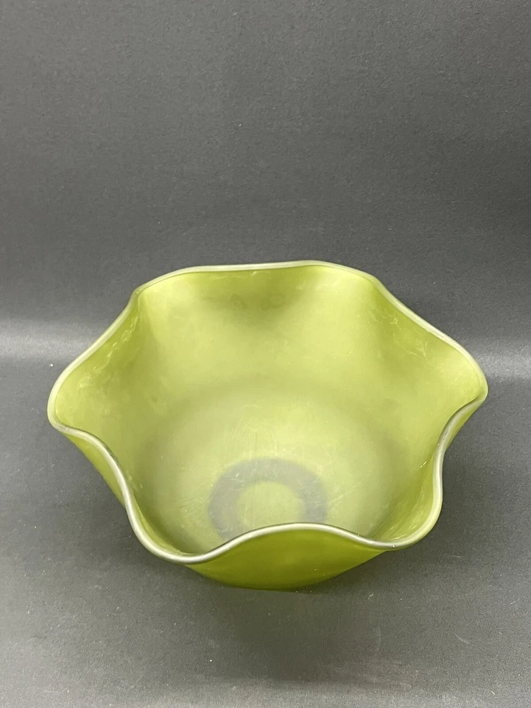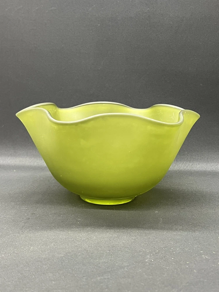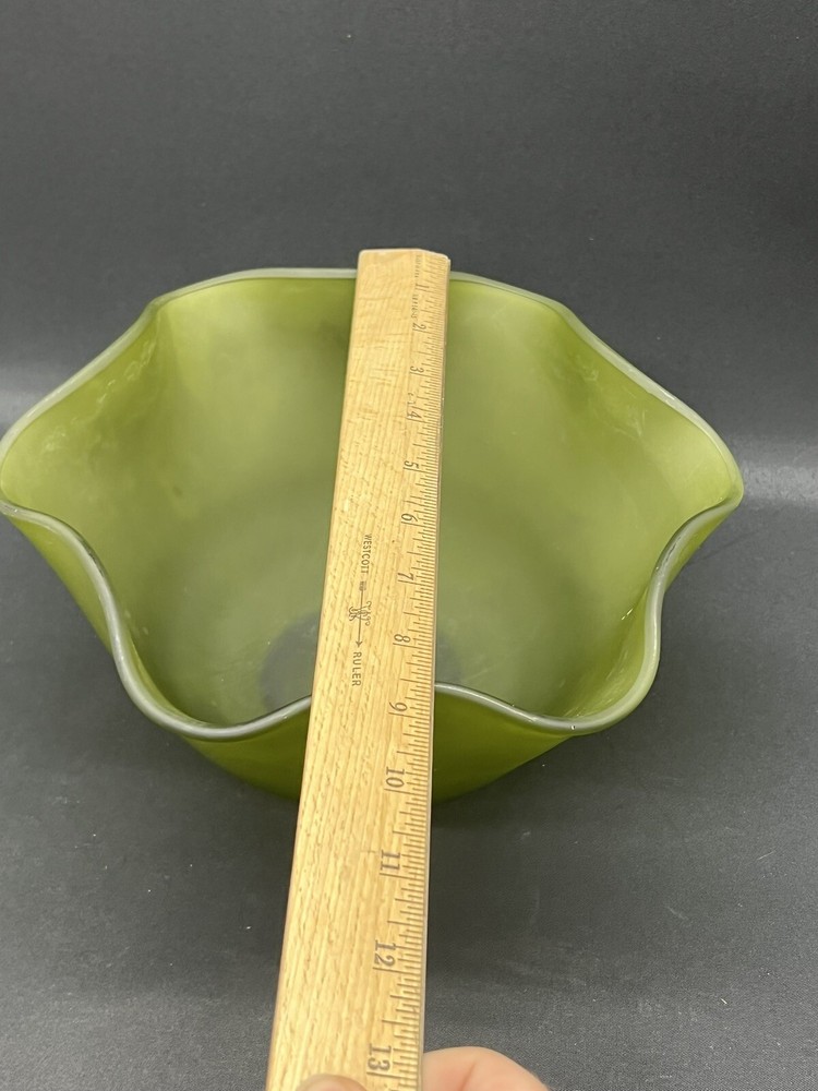 This beautiful vintage bowl from Indiana Glass features a lovely green satin finish with a ruffled edge. The round shape and flower themed design make it a perfect addition to any Mid-Century Modern collection. The bowl measures 8.75 inches in diameter and 5.5 inches in height, and comes with a dipping bowl for added convenience. Crafted with fused glass production technique, this original piece is perfect for decorative purposes or for serving your favorite dishes. The Indiana Glass brand is known for its high-quality craftsmanship and attention to detail, making this bowl a true gem. Add some vintage charm to your home with this stunning piece!