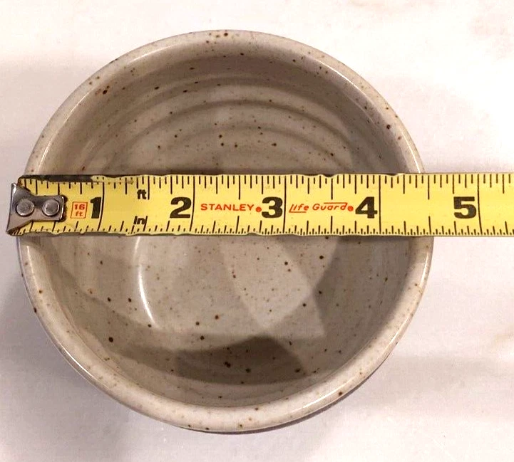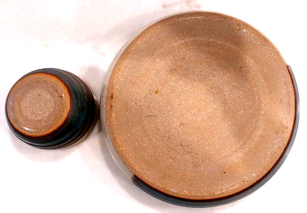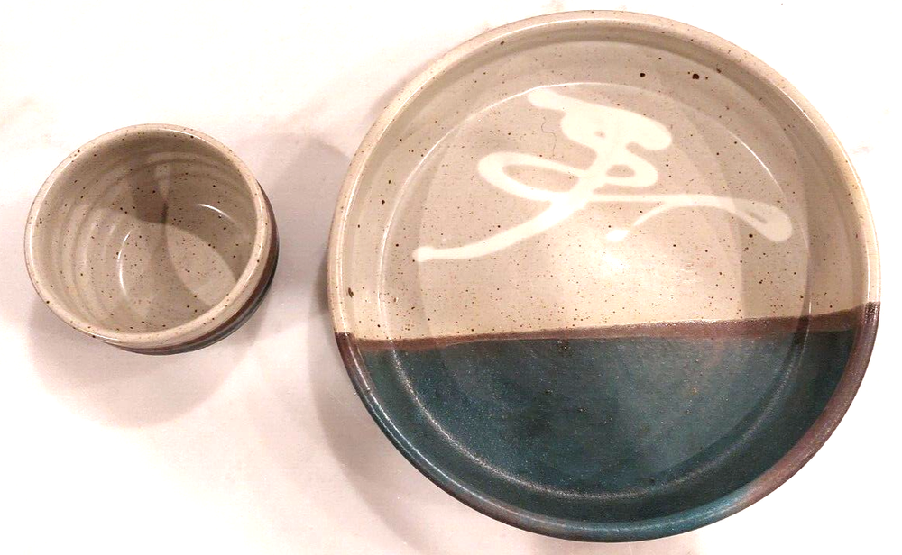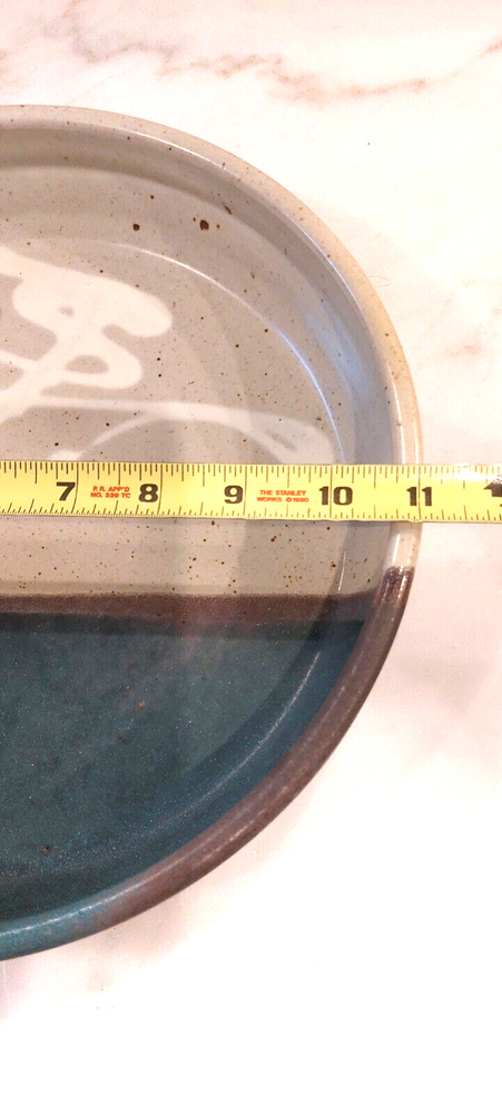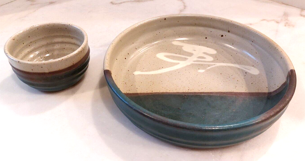 This is a large handmade pottery serving bowl with a vintage design. It is specifically a chip and dip serving bowl, and it comes with dipping bowls. The production technique used is pottery, and the material is clay. Its brand is known for handcrafted items, making it unique and artistic.