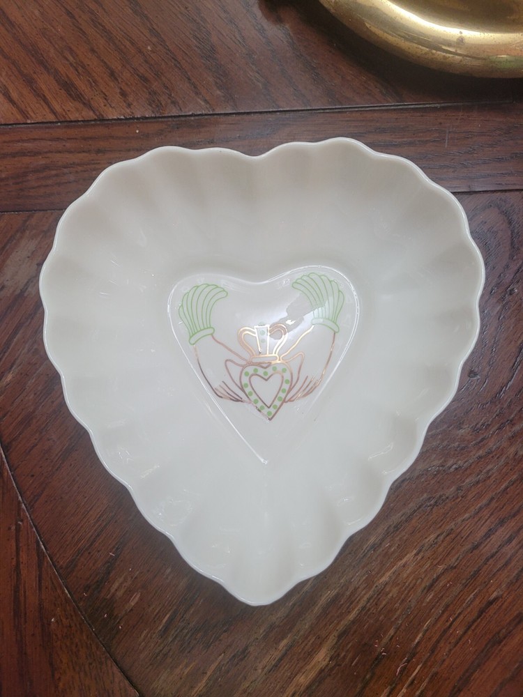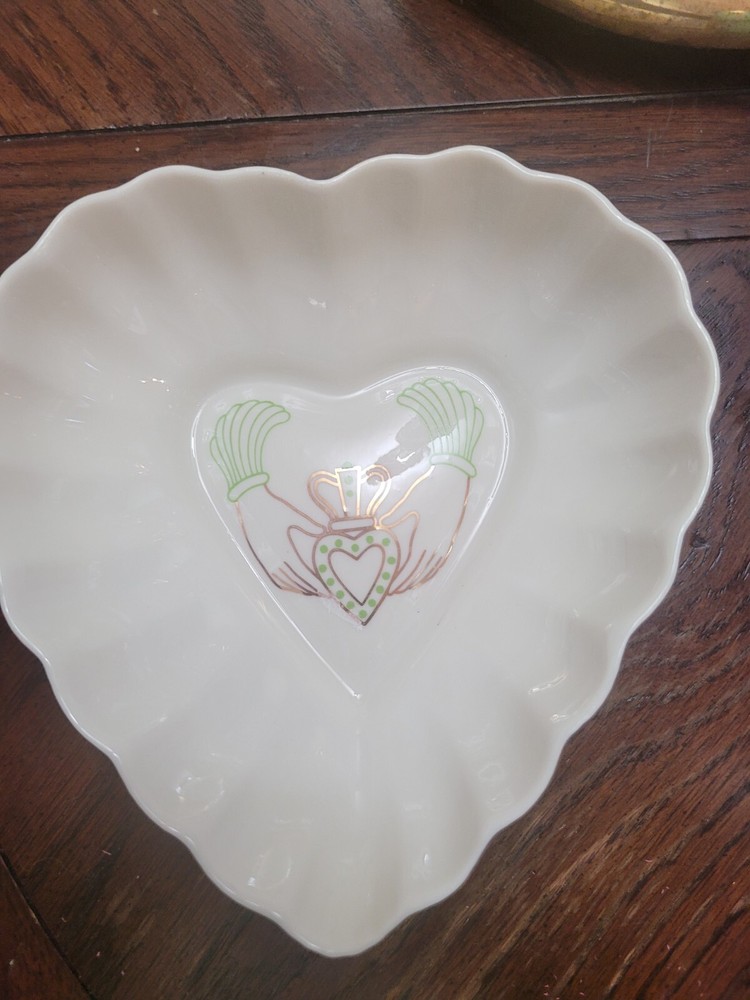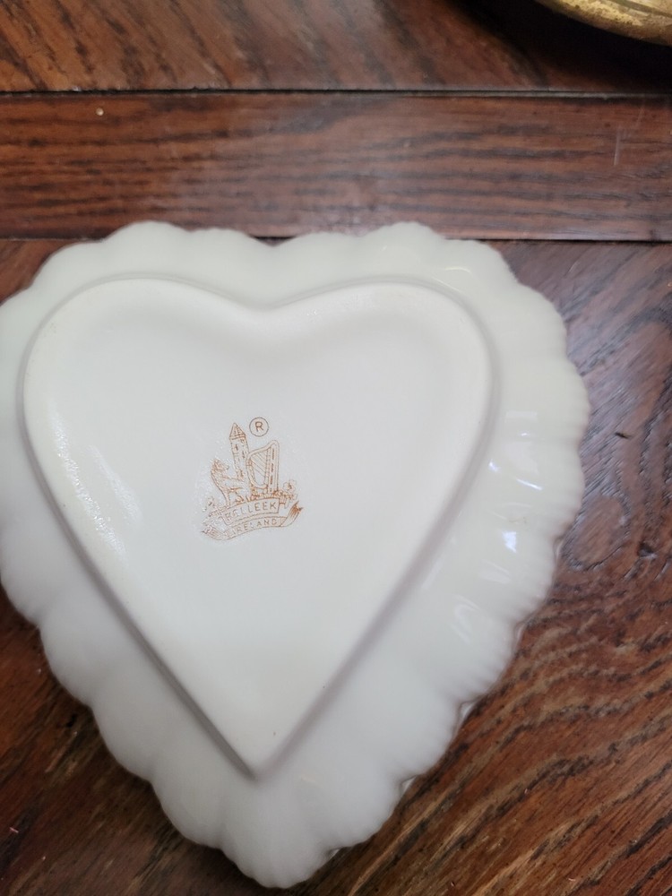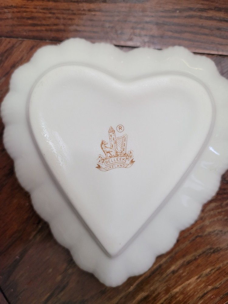 This Belleek Parian China heart-shaped bowl adds a touch of elegance to any decor. Made in Ireland, this vintage piece features a glossy finish and is handcrafted with art pottery techniques. The multicolor design and contemporary style make it a perfect decorative item for any home. The bowl is from the late 20th century and is an original production of Belleek. It is a licensed reproduction of a studio-crafted piece and has a printed backstamp. The material used is porcelain and the production style is art pottery. This trinket dish has a unique design that makes it stand out and is perfect for holding small items.