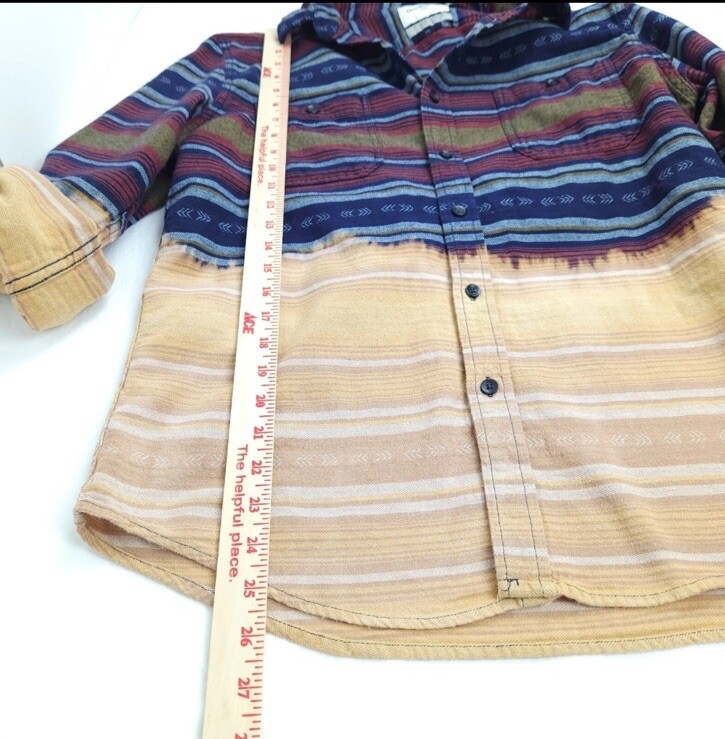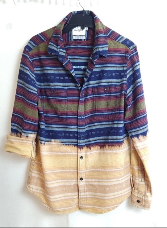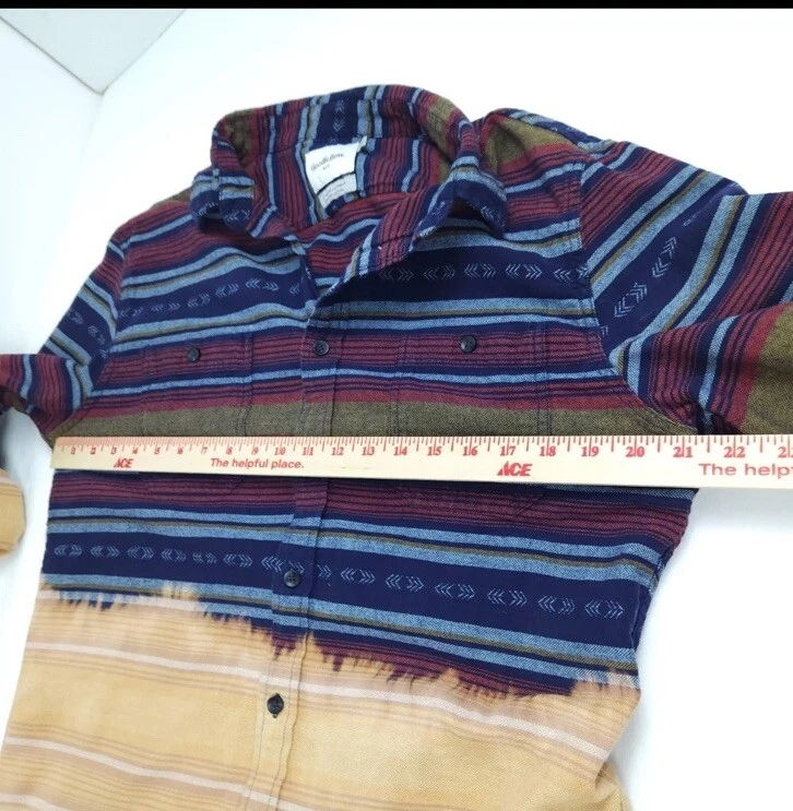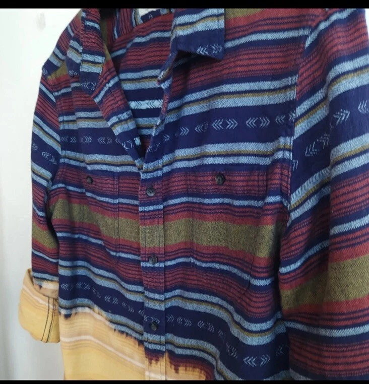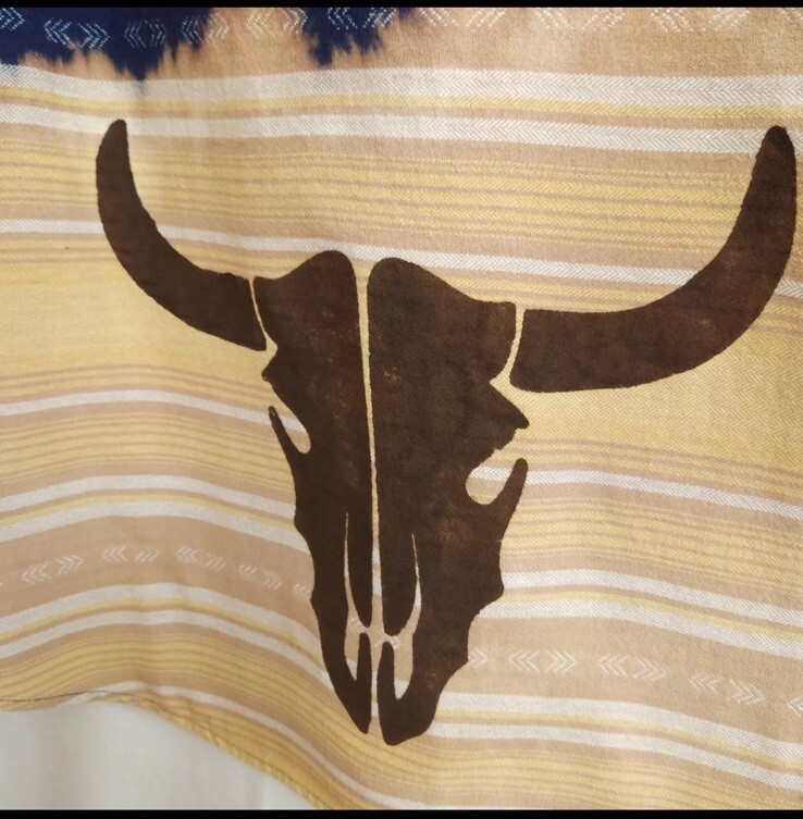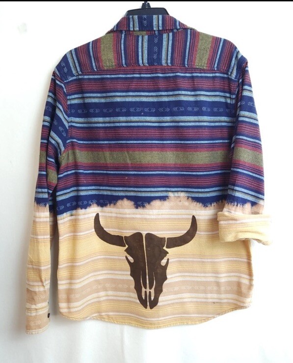This vintage Western shirt features a unique design with a longhorn painted on it. The shirt is made of 100% cotton flannel and has long sleeves with a collared neckline and spread collar style. It has a button-up closure and is machine washable for easy care. The shirt is perfect for casual occasions and comes in a size L for unisex adults. The shirt has accents of bleached dye which give it a one-of-a-kind look. The theme of the shirt is Western, and it is suitable for wear in fall, winter, and spring.