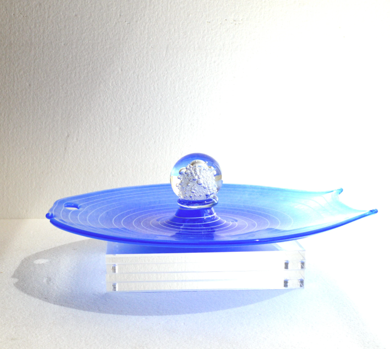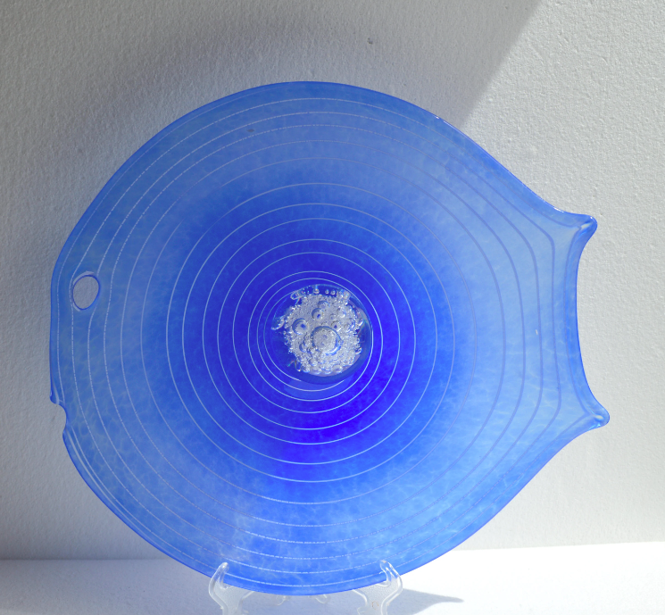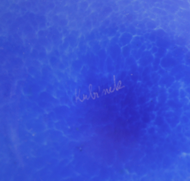 Fish shaped, blue art glass serving plate with handle in the centre. Perfect for serving sweets, sandwiches, snacks, cakes, etc. Decorative art glass centre piece. Signed hand made studio glass in excellent vintage condition with no faults. Thick blue glass platter in the shape of a fish with white glass swirls and clear glass handle with air bubbles inside. The plate is hand signed "Kubinek" on the base. Approx. measurements 350 x 310 x 100 mm 13 3/4 x 12 1/4 x 4 in Weight: 1700 g unpacked All parcels will be shipped with tracking. Domestic shipping with Sendle or Australia Post. International shipping with Australia Post. When shipping charges will be lower than estimated, I will refund the excess. Although I don't offer returns, please contact me with any issues / complains / comments ASAP after receiving your parcel.