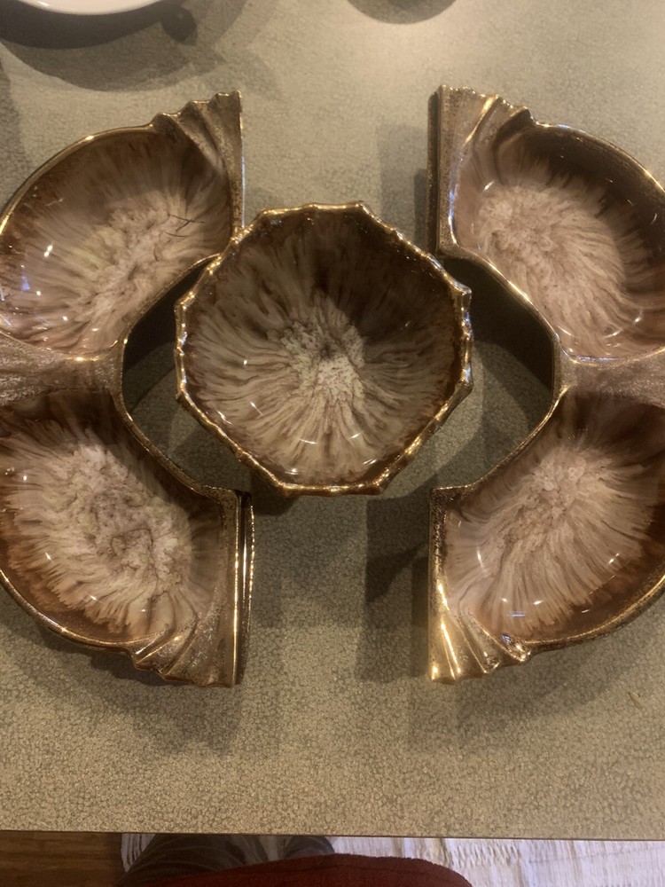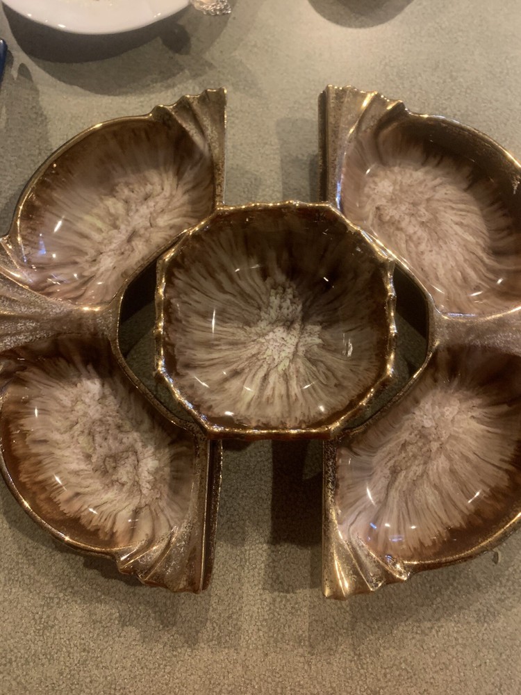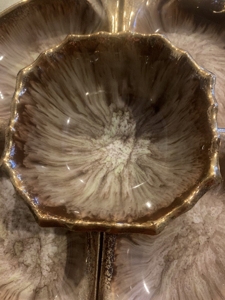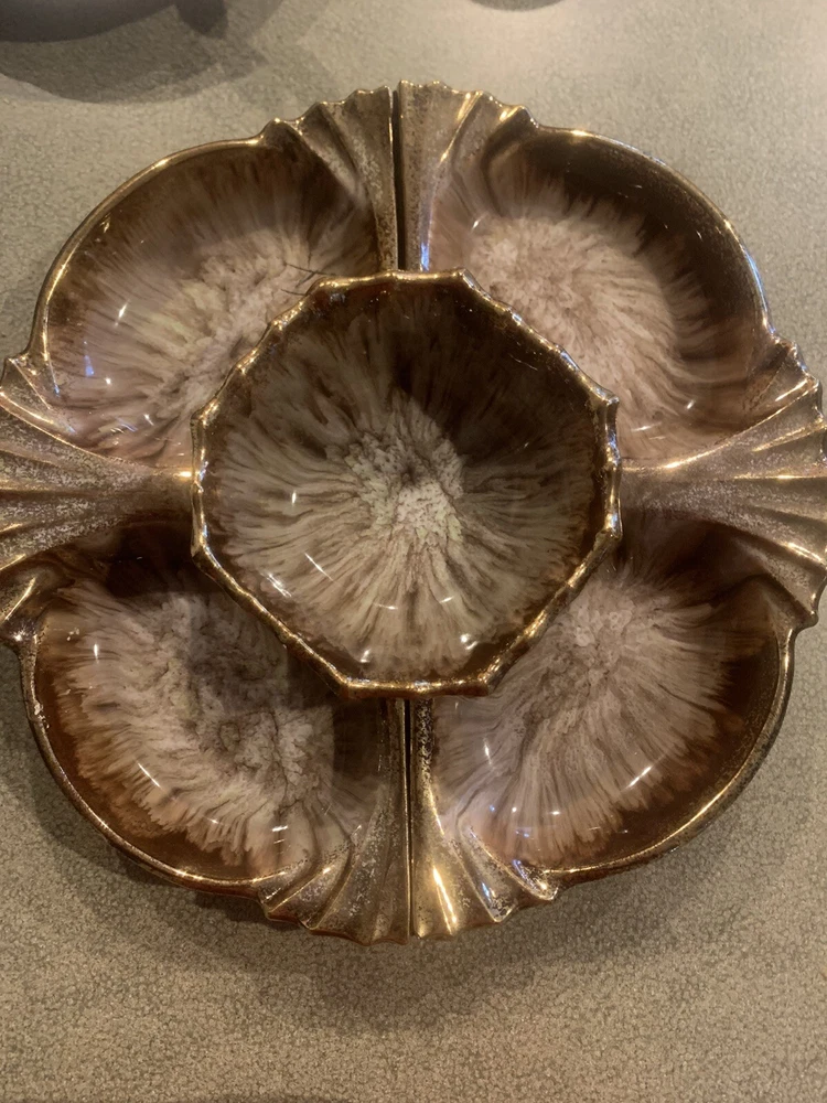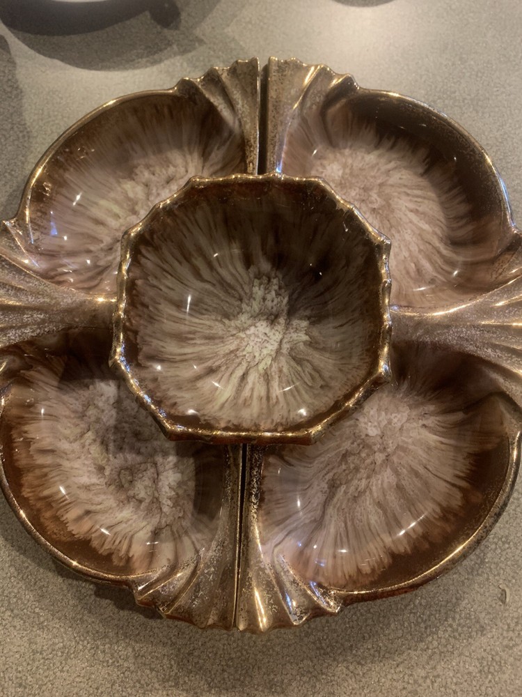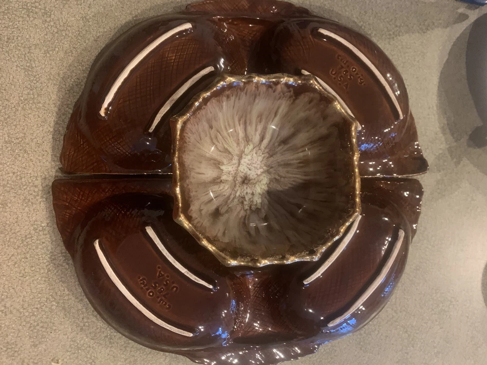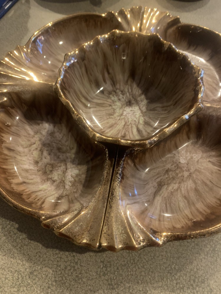 Vintage Cal Orig USA #285 Pottery Large Shrimp Chip Dip Veggies Design Gold Trim. It’s 3 Pieces. Great vintage style and perfect for a veggie tray. I loved that it is not 4 little dishes but only 2 on the round and one dish in the Middle for your sauce or dip.
