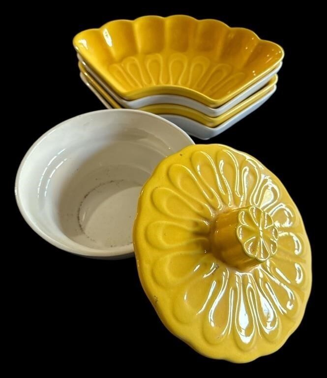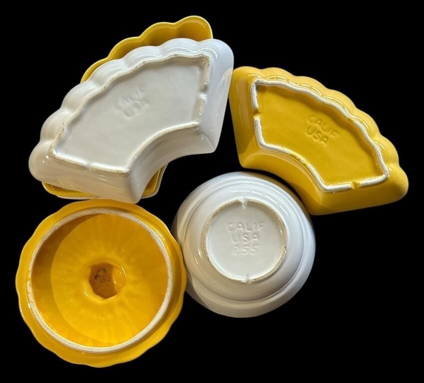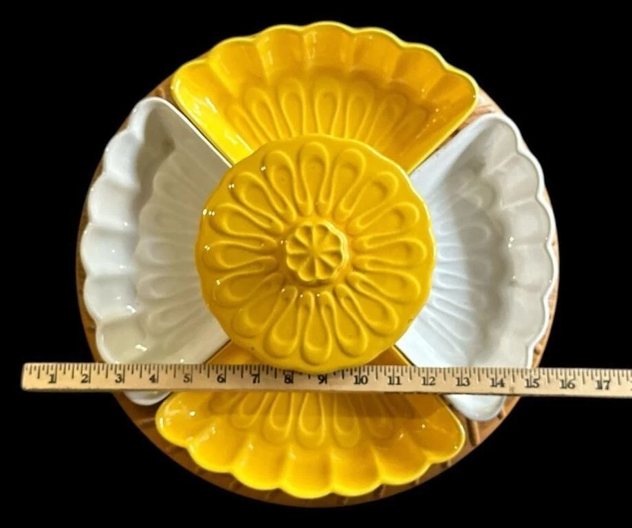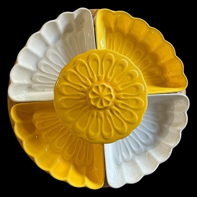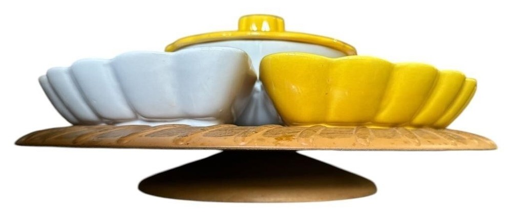 This vintage California Pottery large rotating chip and dip set is a colorful addition to any party or gathering. The set includes a large bowl and four smaller dipping bowls on a rotating base, all adorned with a fun motif. The ceramic material and pottery production technique make these bowls unique and perfect for any vintage lover. The set is in great shape and is sure to impress guests. Don't miss out on this rare find from California. Only one chip bowl has a tiny hairline crack (refer to photo last photo). Thank you for looking.