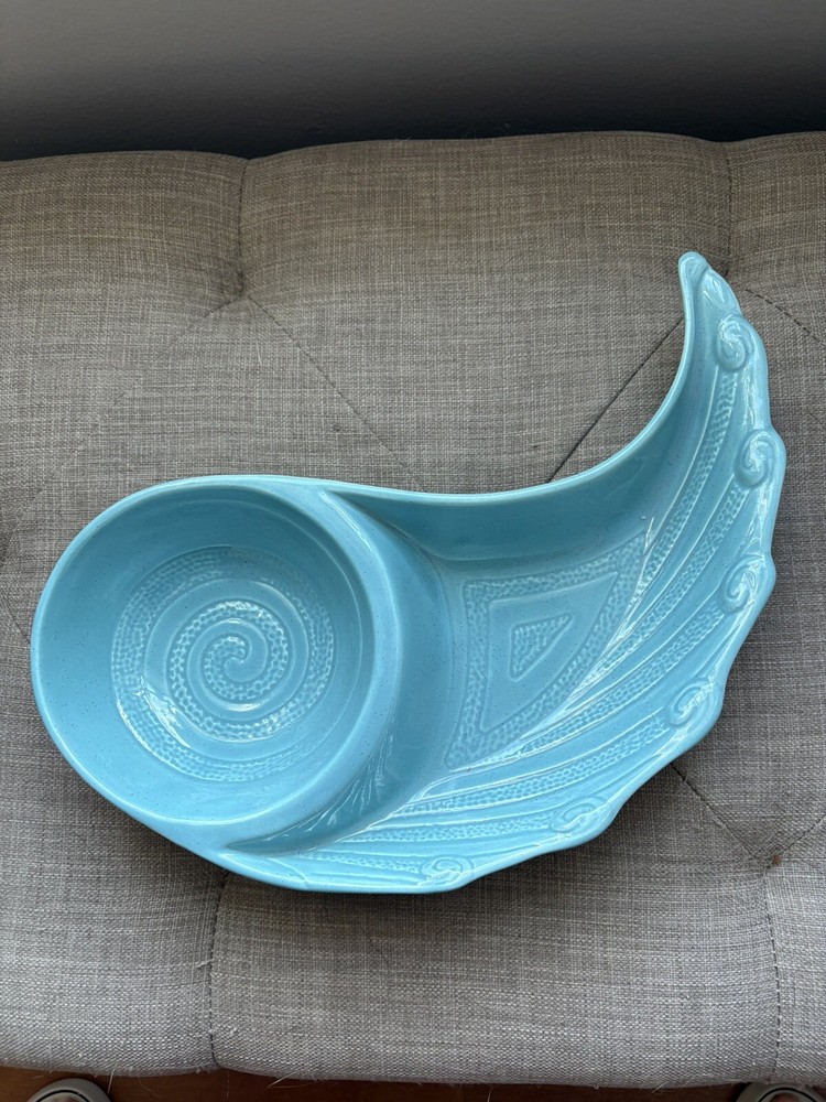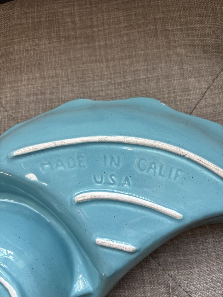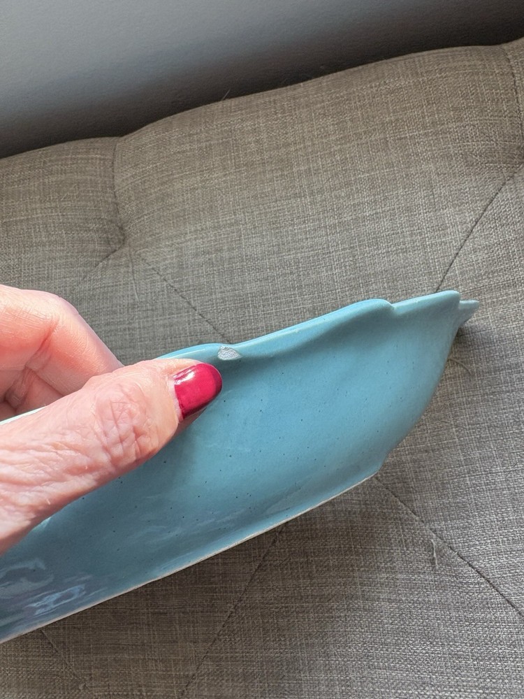 Absolutely love this retro platter! The vibrant turquoise color and unique wing-shaped design make it a standout piece. Perfect for entertaining—holds chips and dip stylishly, and the tiny chip is barely noticeable. Great condition for its age, adds a fun vintage touch to any gathering. Highly recommend!