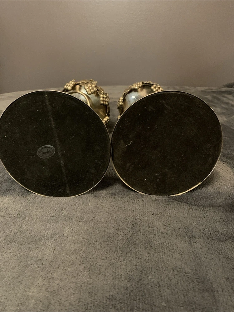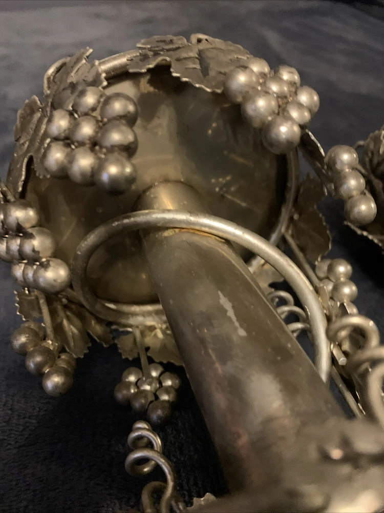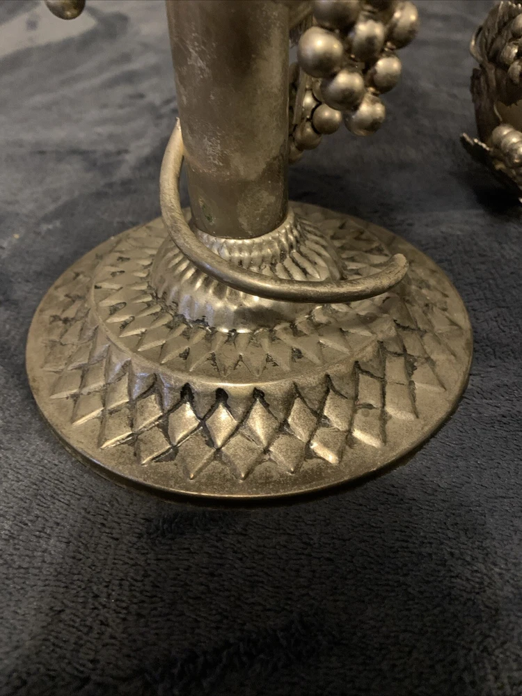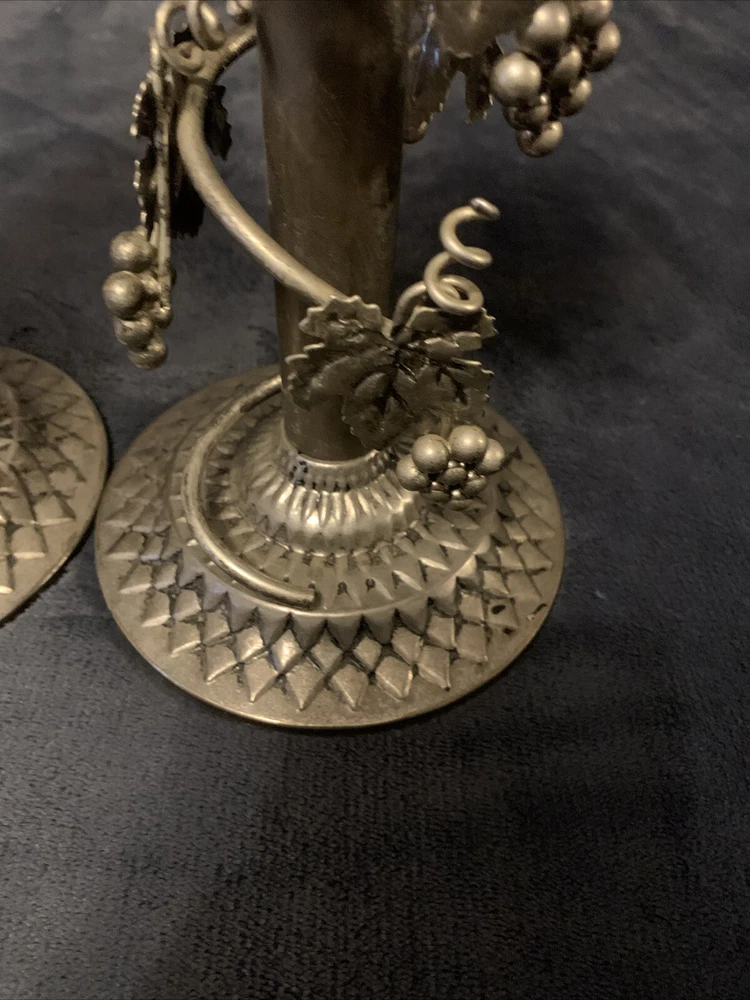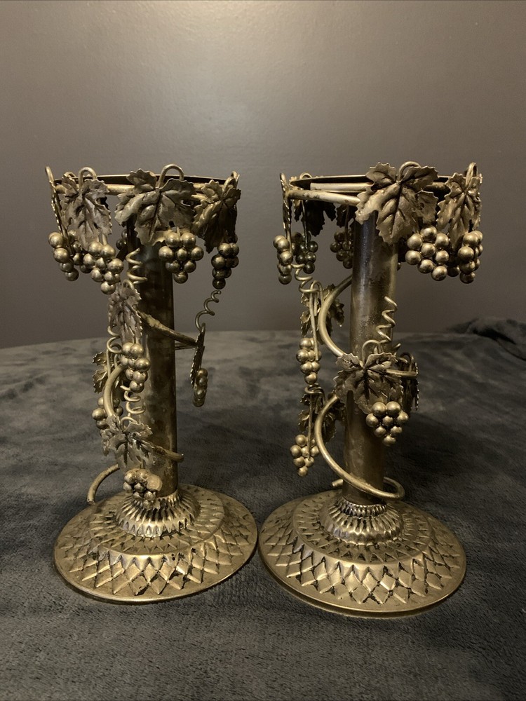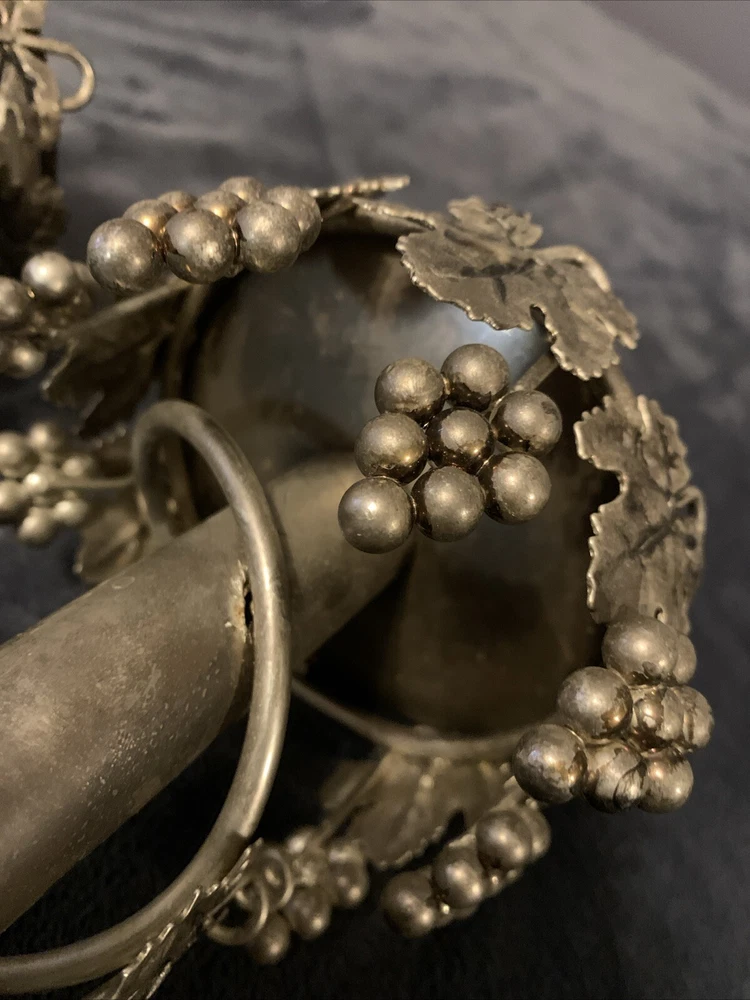 Add a touch of elegance to your home decor with this stunning set of two vintage candle holders from Studio Silversmith. These asymmetrical candle holders feature a beautiful pattern of grapes and leaves, perfect for any occasion and suitable for all types of candles. The silver-plated finish gives them a luxurious look, and they can be easily hung from a window or placed on any furniture for added ambiance. Measuring 9.5 inches in length and height, and 5 inches in width, these candle holders are the perfect size for any room. The Mediterranean style and candle theme make them a great addition to any collection, and they weigh 2.8lbs which ensures they are sturdy and durable. Get this set of two candle holders to add a touch of sophistication to your home decor today! Please see photos for any imperfections you may see. Please reach out with any questions or for more info/photos.