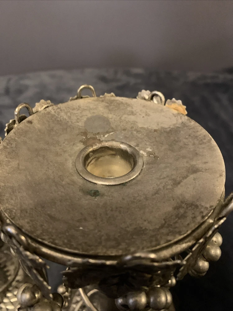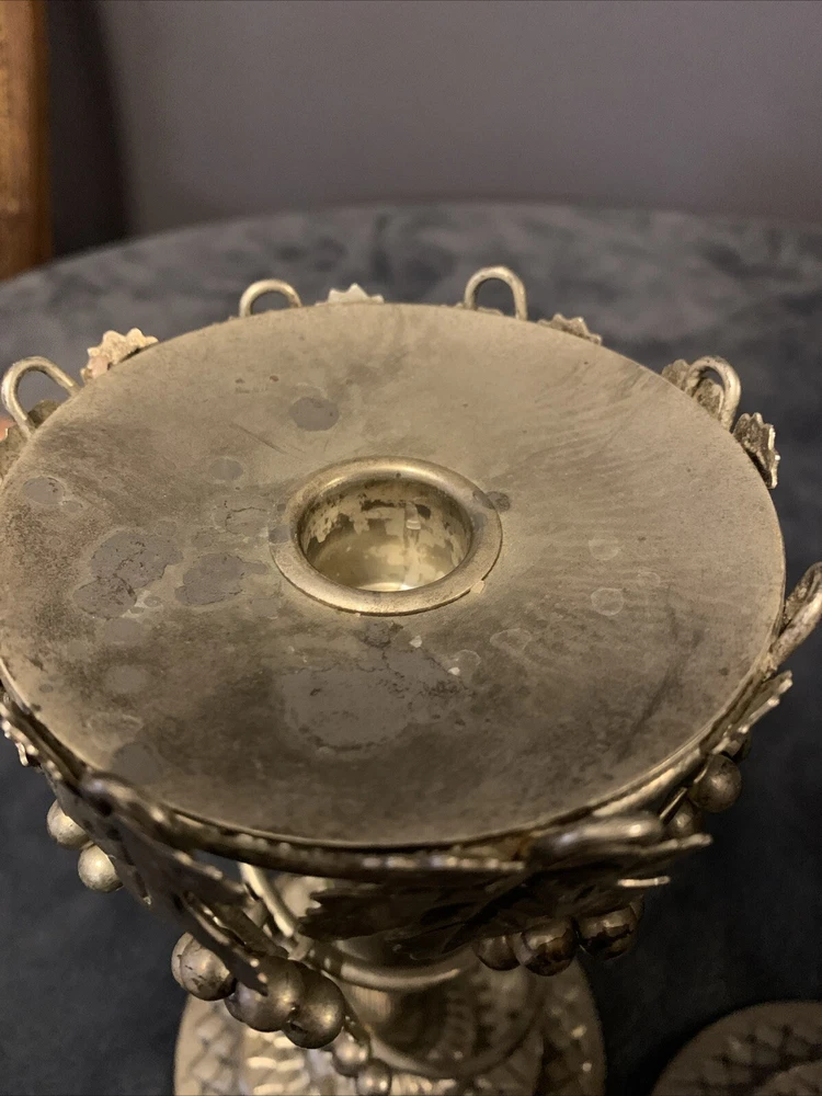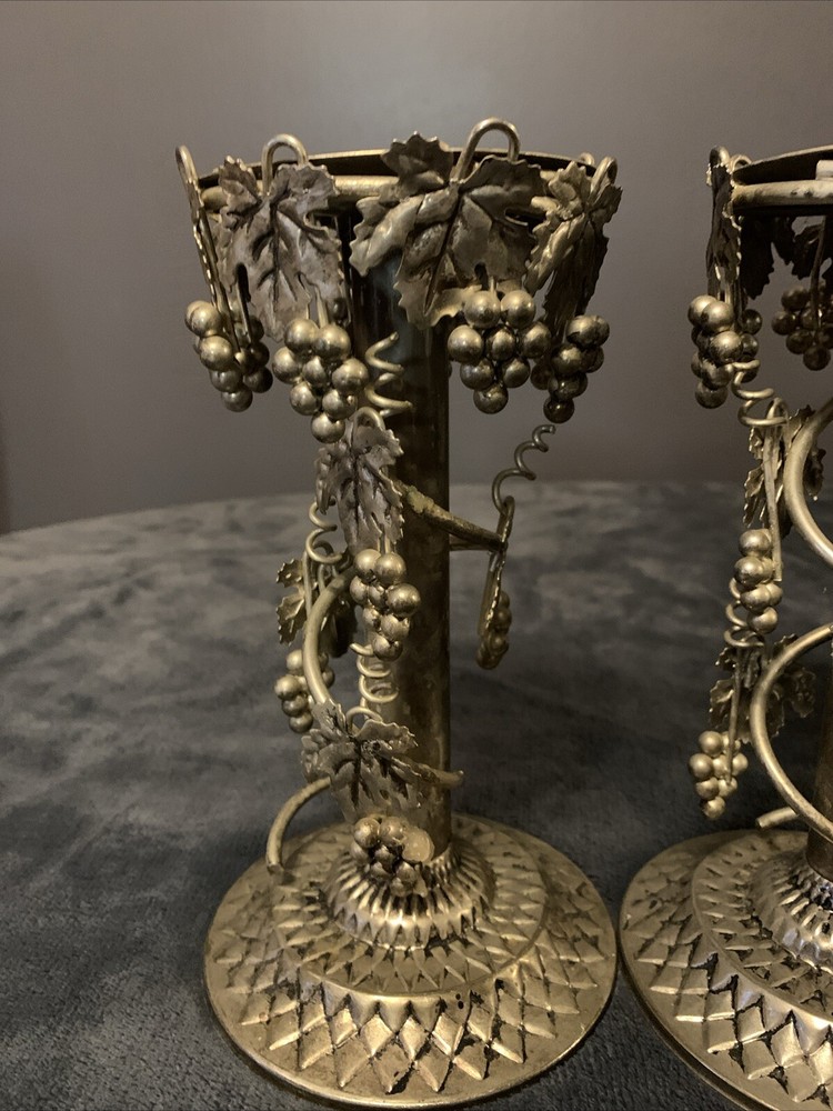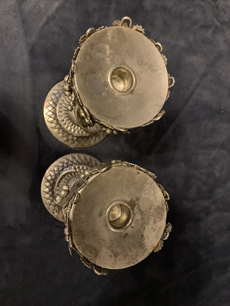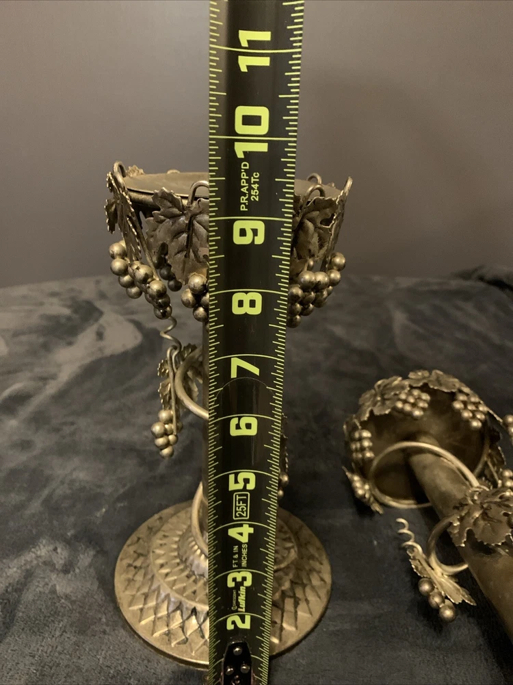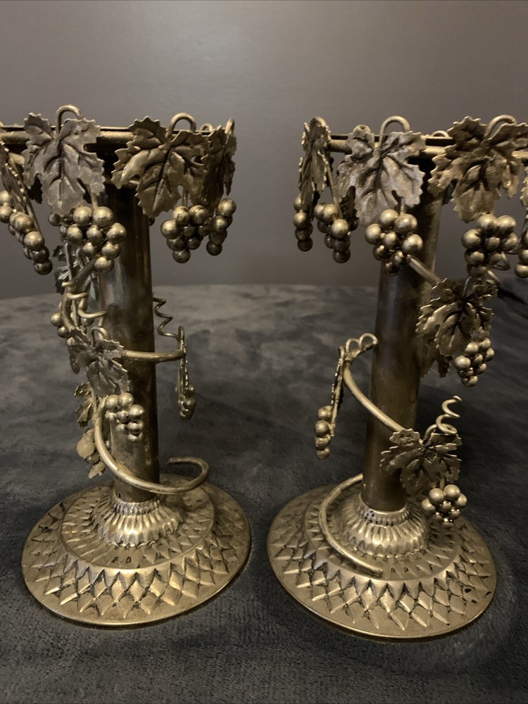 Add a touch of elegance to your home decor with this stunning set of two vintage candle holders from Studio Silversmith. These asymmetrical candle holders feature a beautiful pattern of grapes and leaves, perfect for any occasion and suitable for all types of candles. The silver-plated finish gives them a luxurious look, and they can be easily hung from a window or placed on any furniture for added ambiance. Measuring 9.5 inches in length and height, and 5 inches in width, these candle holders are the perfect size for any room. The Mediterranean style and candle theme make them a great addition to any collection, and they weigh 2.8lbs which ensures they are sturdy and durable. Get this set of two candle holders to add a touch of sophistication to your home decor today! Please see photos for any imperfections you may see. Please reach out with any questions or for more info/photos.