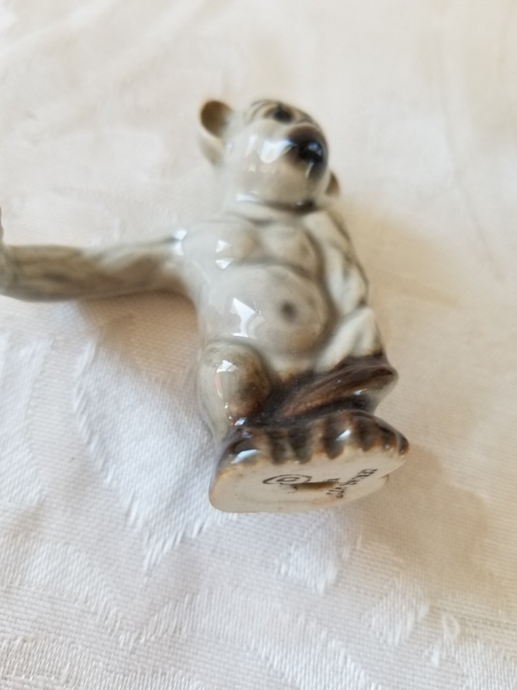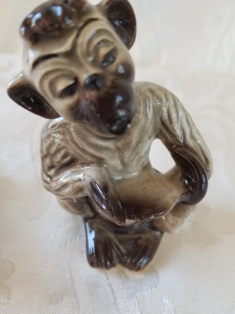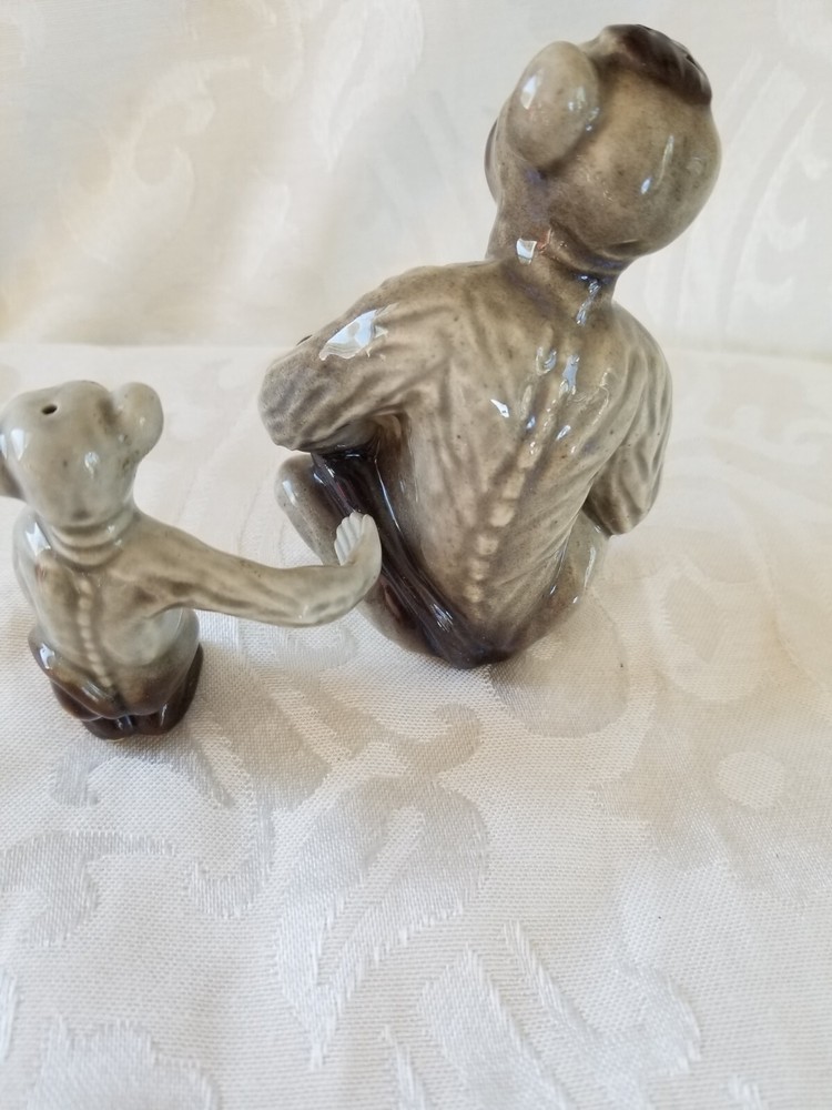 This vintage Ceramic Arts Studio salt and pepper shaker set features a charming design of a monkey and baby, both crafted in gray ceramic with a handmade touch. The set portraying a 1950s style. These animal-shaped shakers are reusable making them a delightful addition to any kitchen collection. Made in Madison Wisc. United States, this original piece from 1952 adds a touch of whimsy to any dining experience. Any questions please ask. Thanks for looking.