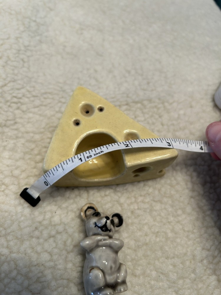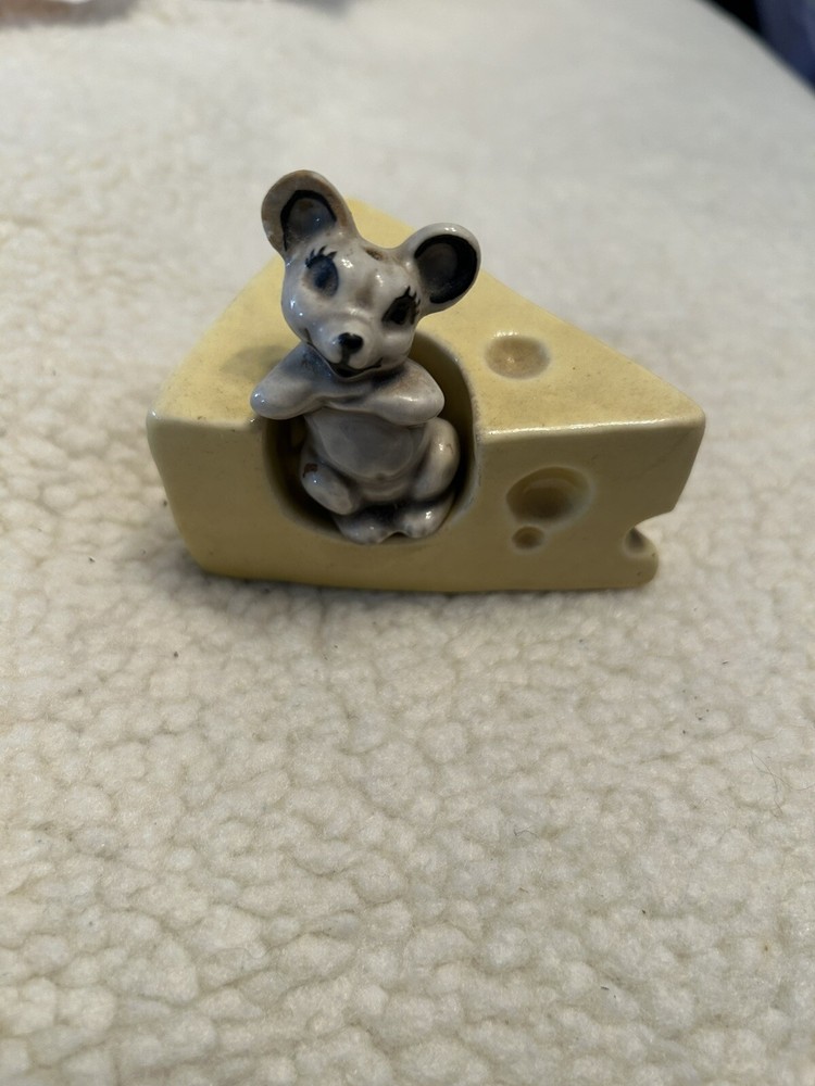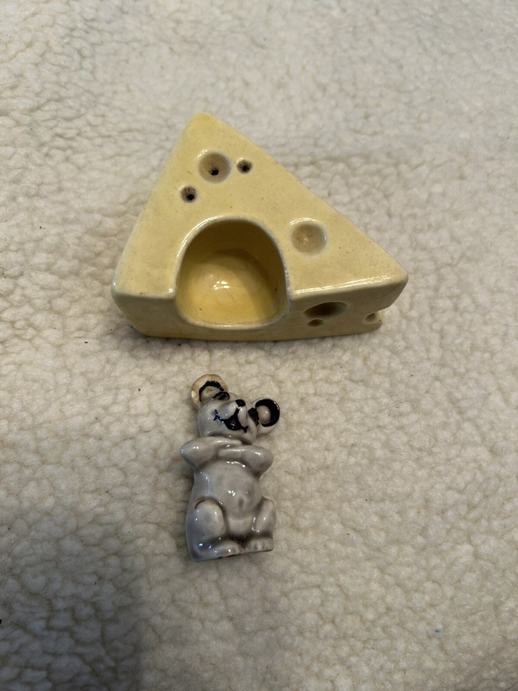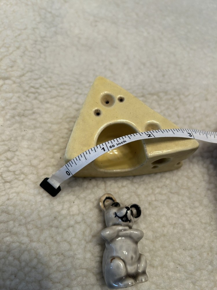 Add a touch of vintage charm to your kitchen with these Ceramic Arts Studio mouse and cheese-shaped salt and pepper shakers. Crafted in the 1950s in the United States, this set includes one pepper shaker and one salt shaker, both made of yellow and gray ceramic material with an abstract art pattern. Measuring 2 inches in height, 2.5 inches in length, and 3 inches in width, this medium-sized set is perfect for all occasions and compatible with cheese food. The set is in original condition and weighs 4 oz.