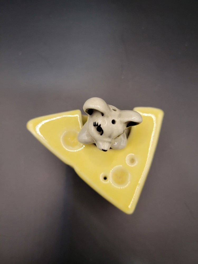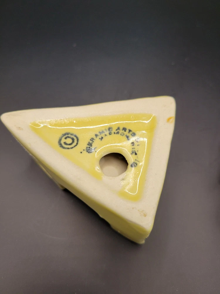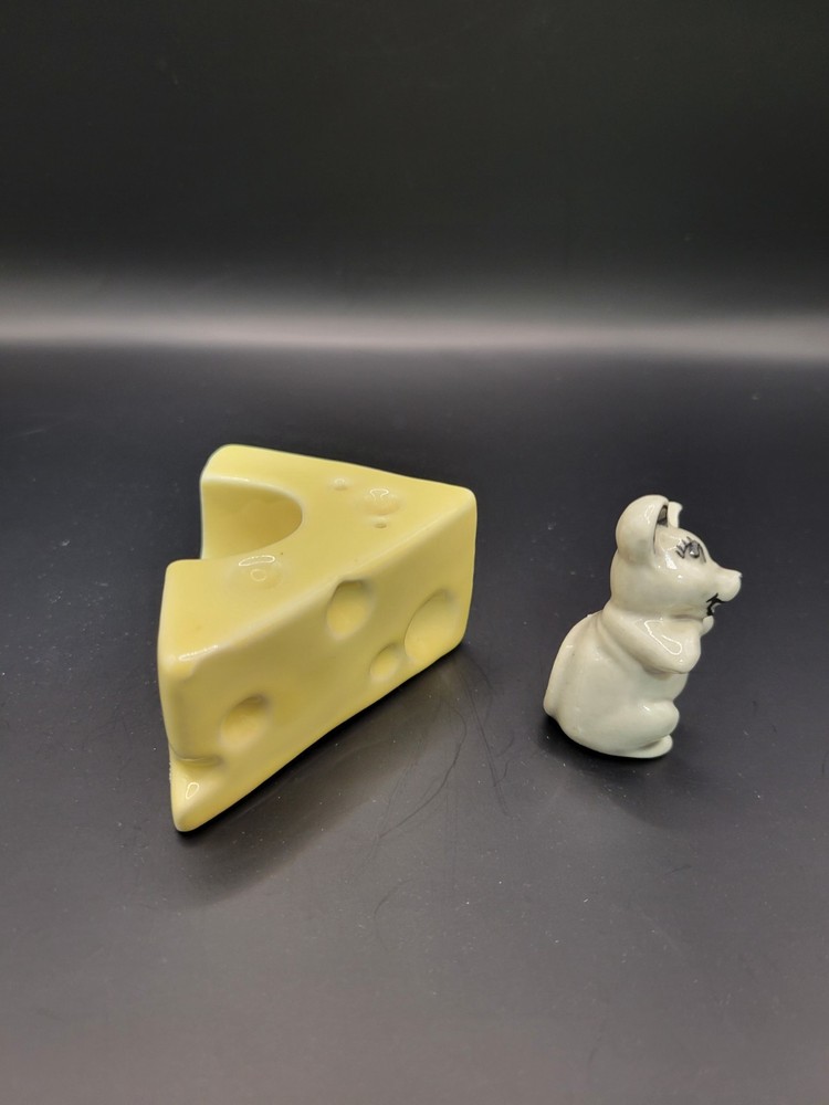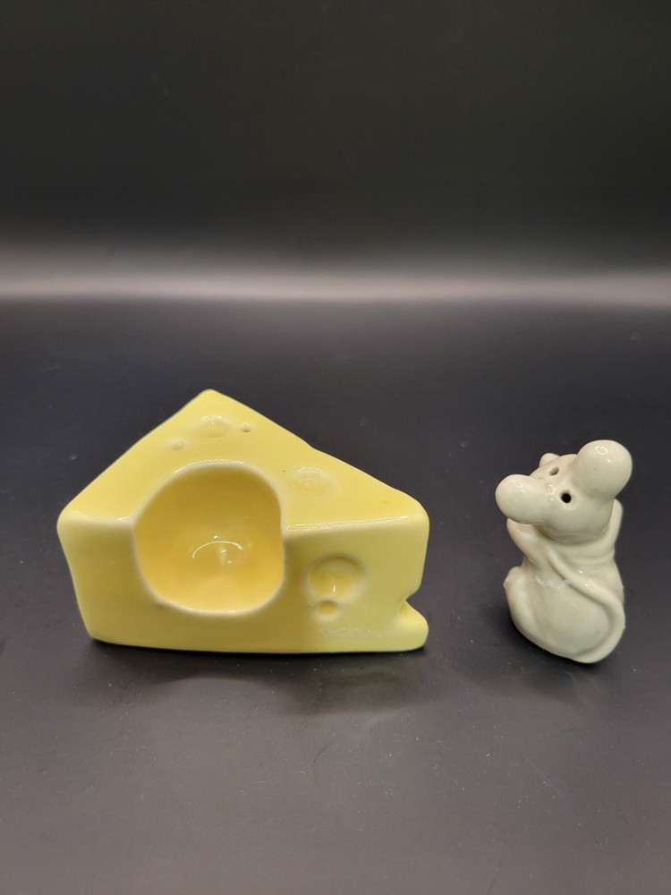 Vintage Ceramic Arts Studio Mouse With Cheese Salt And Pepper Shakers. is a set of small ceramic shakers shaped like a mouse and cheese. Made in the United States in the 1950s, these novelty shakers are colorful and original. The set includes a pepper shaker and a salt shaker, both measuring 3 inches in length, 2.75 inches in height, and 2.25 inches in width. Perfect for all occasions and collectors of unique kitchen items. There are no plugs for the shakers.