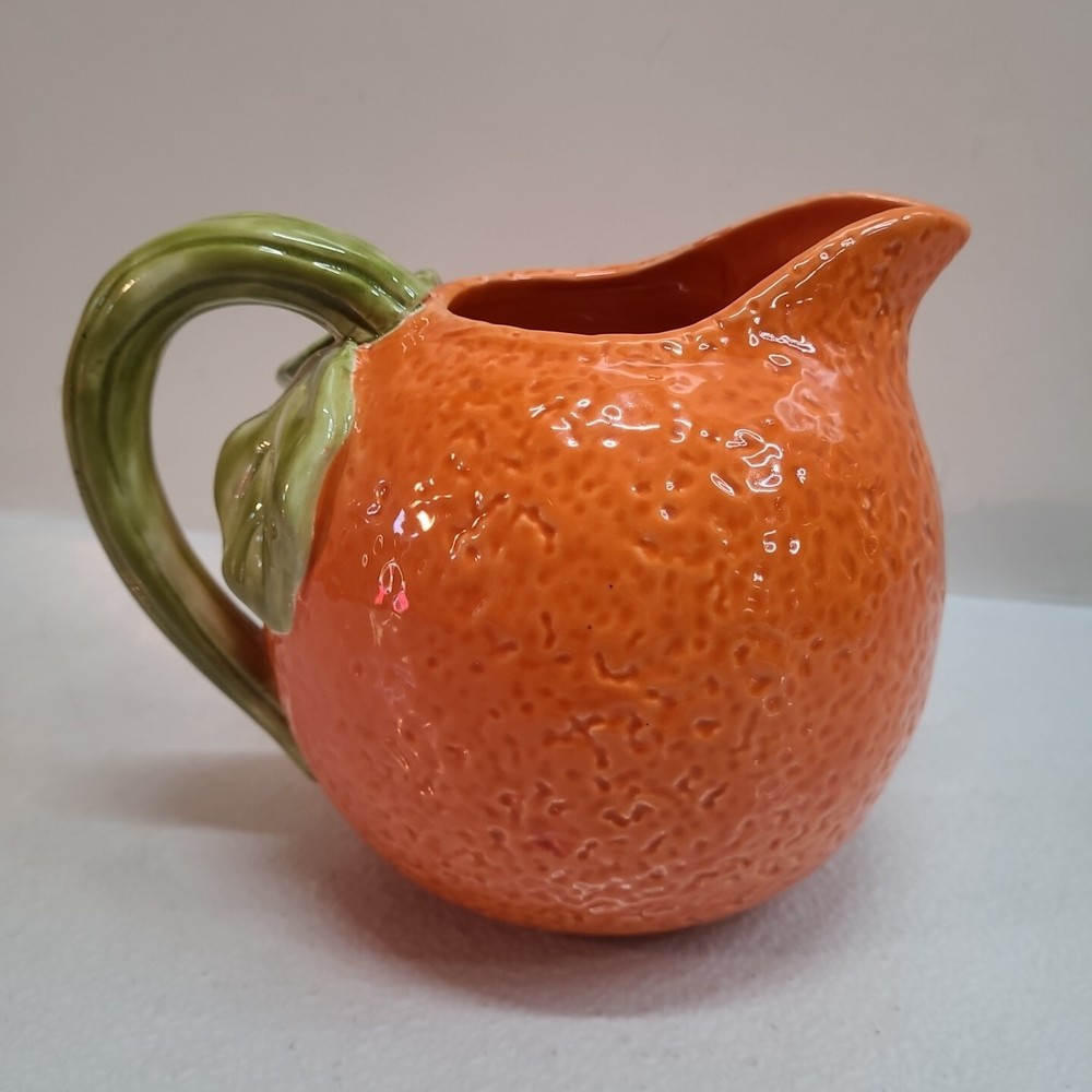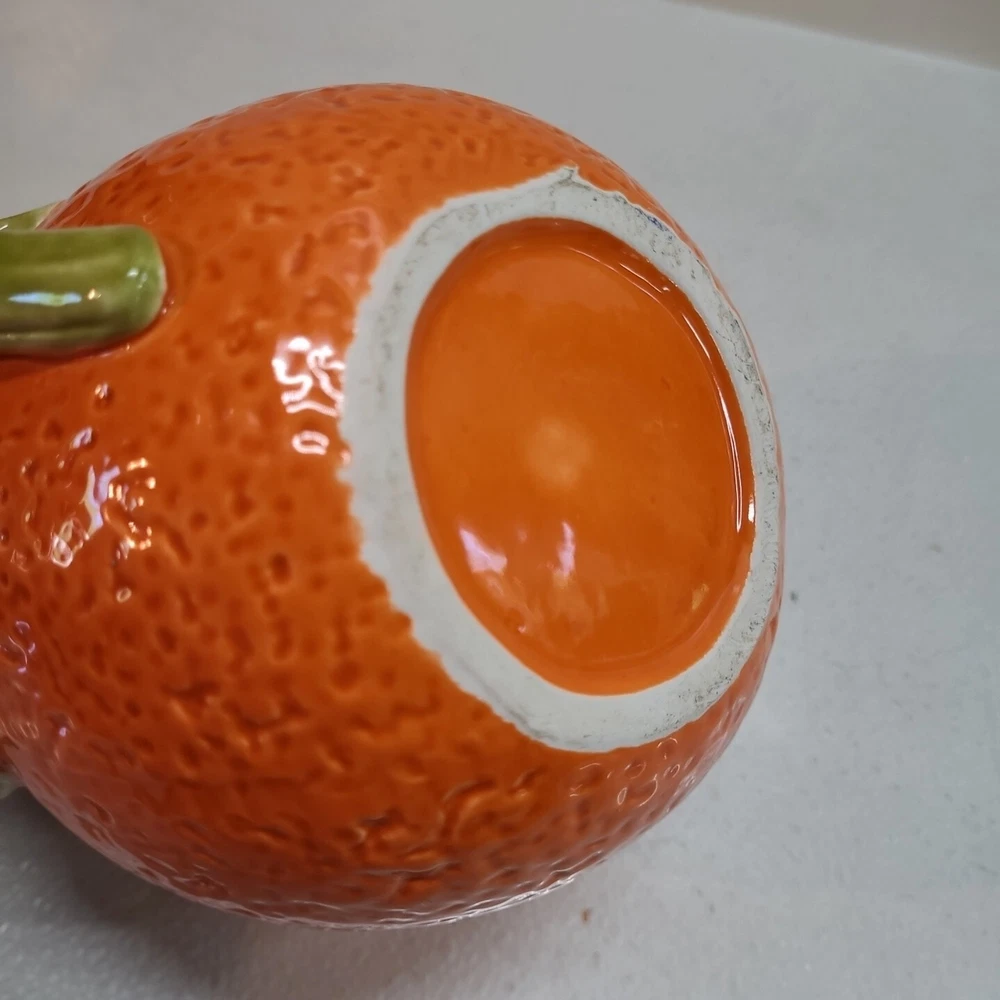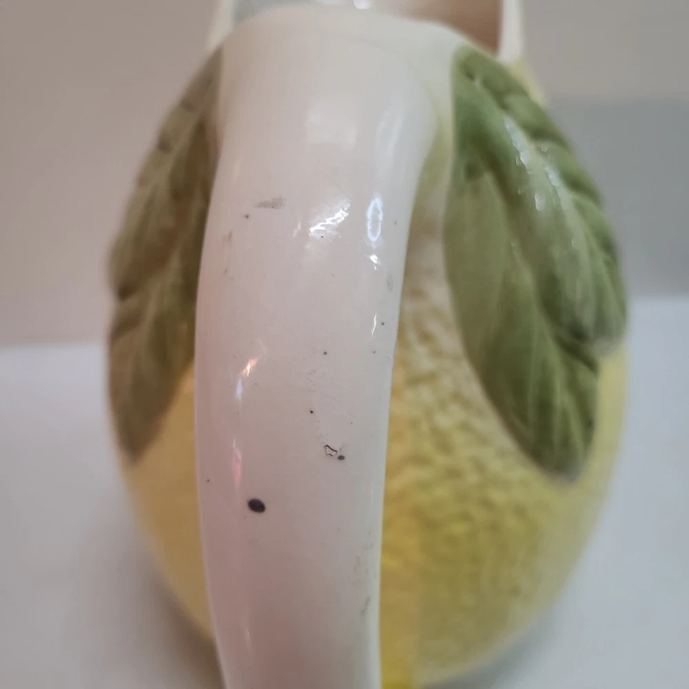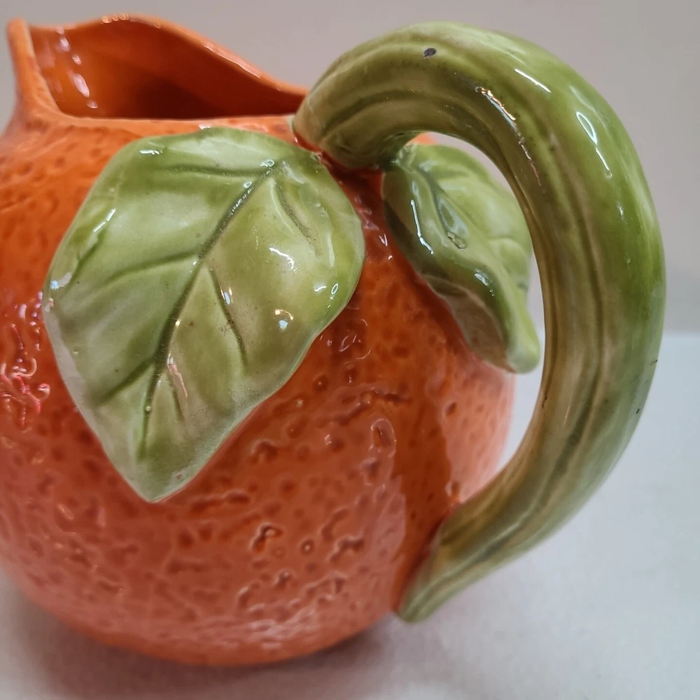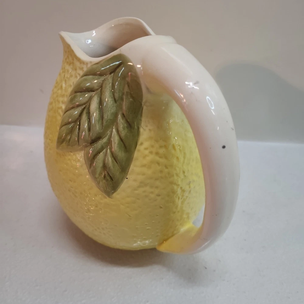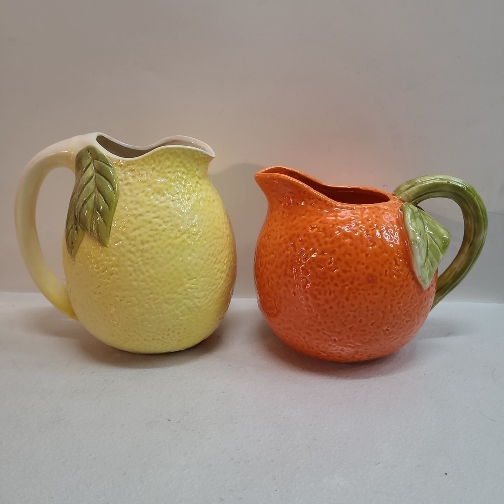 Vintage Ceramic Lemon Shaped Pitcher/Carafe & Orange Shaped Pitcher/Carafe. The orange pitcher measures 5.5" tall x 6" wide x 6" long (w/o handle) 7.5" (w handle) and weighs 1 lb, 6.3 oz. I don't see any cracks in it. The lemon pitcher measures 7" tall x 5" wide x 5" long (w/o handle) 7.5" (w handle) and weighs 1 lb, 3 oz. There is a hairline crack on the top rear near the handle. It starts at the top and goes down approximately 2". Itbl is still structurally strong and it does not leak. I do not know exactly how old these are or what brand they may be. Please view photos for more info and condition and always feel free to ask questions. Thank you for viewing! Be sure to check out all the other items in my store - pickerparadise9Vintage Ceramic Lemon Shaped Pitcher/Carafe & Orange Shaped Pitcher/Carafe. The orange pitcher measures 5.5" tall x 6" wide x 6" long (w/o handle) 7.5" (w handle) and weighs 1 lb, 6.3 oz. I don't see any cracks in it. The lemon pitcher measures 7" tall x 5" wide x 5" long (w/o handle) 7.5" (w handle) and weighs 1 lb, 3 oz. There is a hairline crack on the top rear near the handle. It starts at the top and goes down approximately 2". Itbl is still structurally strong and it does not leak. I do not know exactly how old these are or what brand they may be. Please view photos for more info and condition and always feel free to ask questions. Thank you for viewing! Be sure to check out all the other items in my store - pickerparadise9