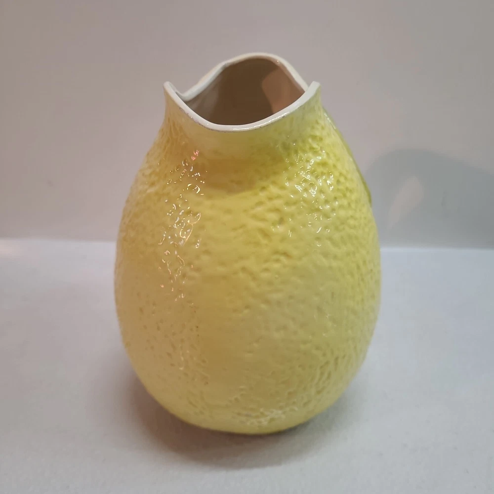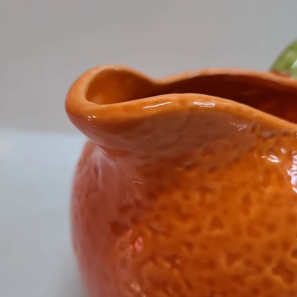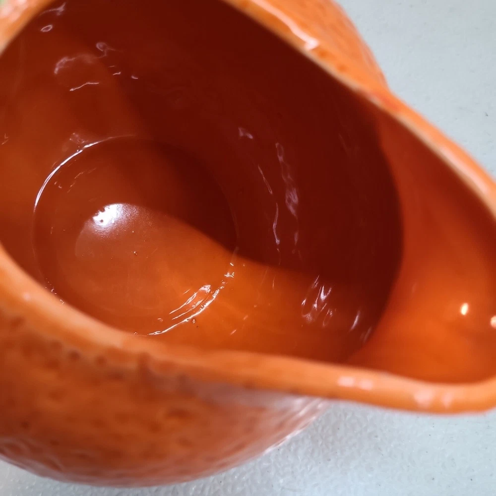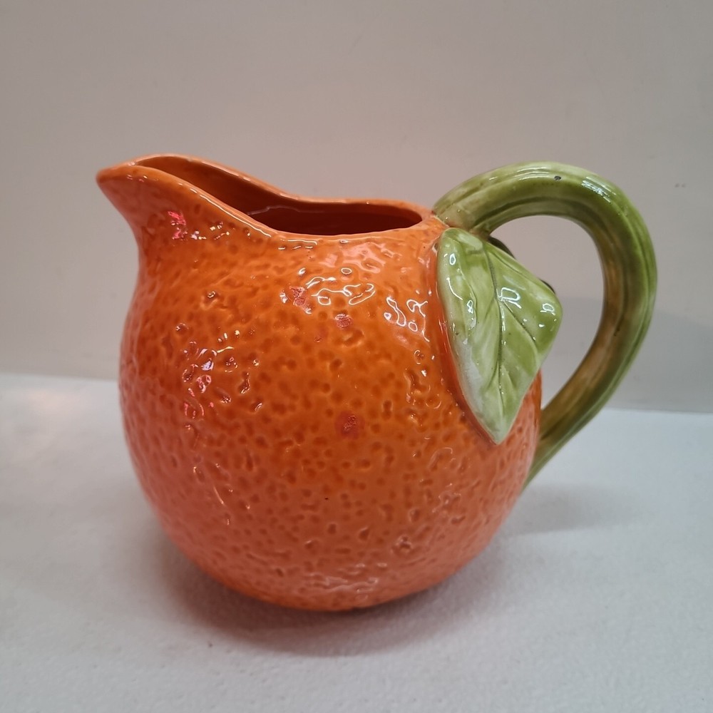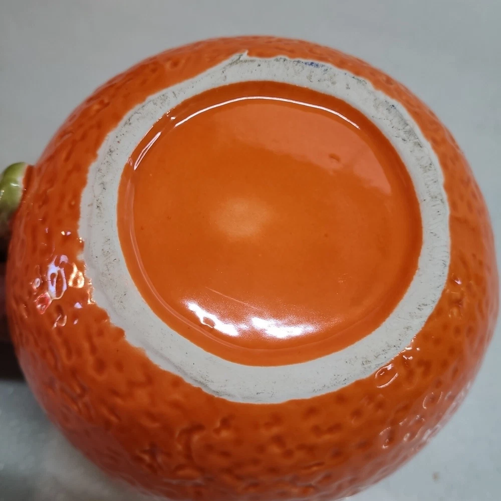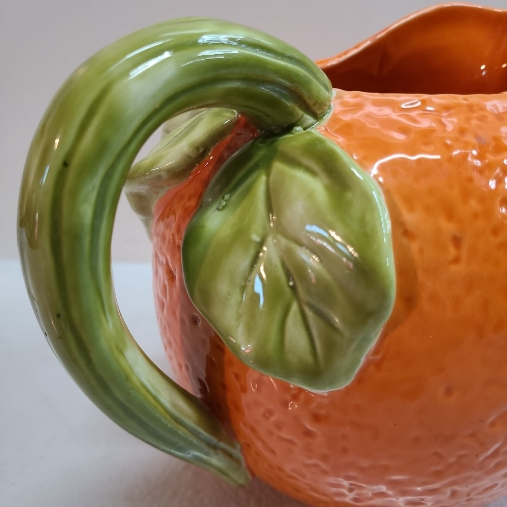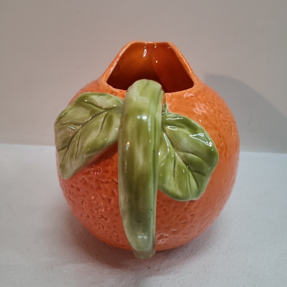 Vintage Ceramic Lemon Shaped Pitcher/Carafe & Orange Shaped Pitcher/Carafe. The orange pitcher measures 5.5" tall x 6" wide x 6" long (w/o handle) 7.5" (w handle) and weighs 1 lb, 6.3 oz. I don't see any cracks in it. The lemon pitcher measures 7" tall x 5" wide x 5" long (w/o handle) 7.5" (w handle) and weighs 1 lb, 3 oz. There is a hairline crack on the top rear near the handle. It starts at the top and goes down approximately 2". Itbl is still structurally strong and it does not leak. I do not know exactly how old these are or what brand they may be. Please view photos for more info and condition and always feel free to ask questions. Thank you for viewing! Be sure to check out all the other items in my store - pickerparadise9Vintage Ceramic Lemon Shaped Pitcher/Carafe & Orange Shaped Pitcher/Carafe. The orange pitcher measures 5.5" tall x 6" wide x 6" long (w/o handle) 7.5" (w handle) and weighs 1 lb, 6.3 oz. I don't see any cracks in it. The lemon pitcher measures 7" tall x 5" wide x 5" long (w/o handle) 7.5" (w handle) and weighs 1 lb, 3 oz. There is a hairline crack on the top rear near the handle. It starts at the top and goes down approximately 2". Itbl is still structurally strong and it does not leak. I do not know exactly how old these are or what brand they may be. Please view photos for more info and condition and always feel free to ask questions. Thank you for viewing! Be sure to check out all the other items in my store - pickerparadise9