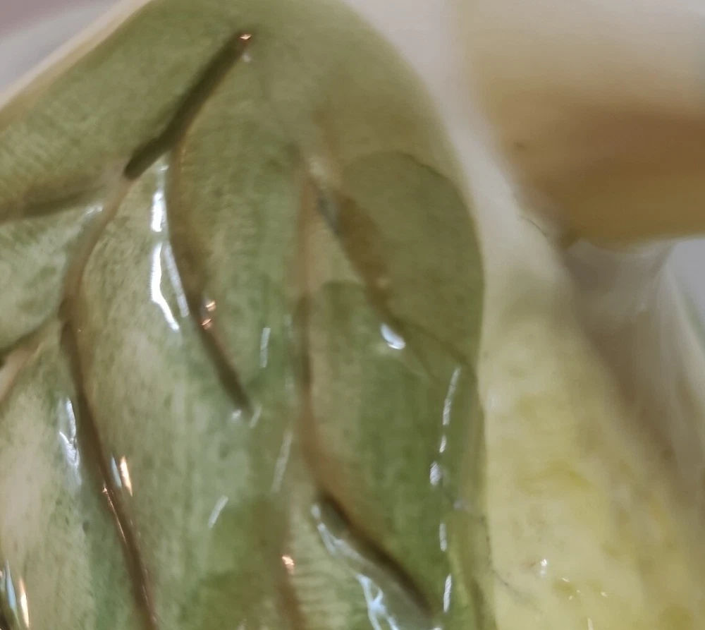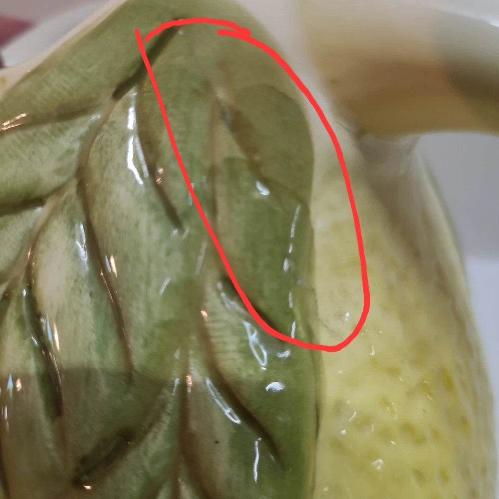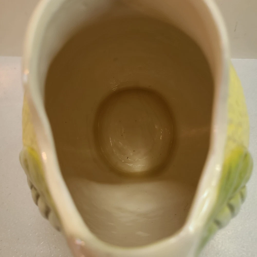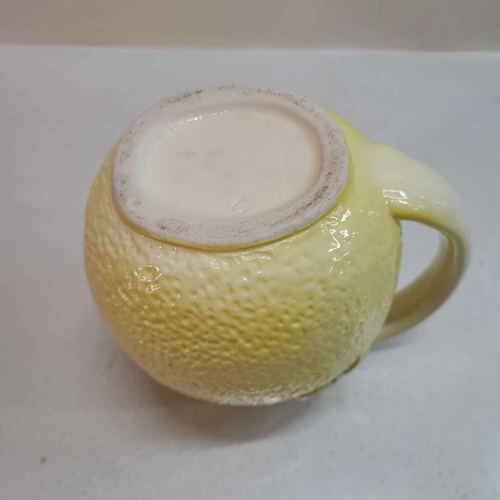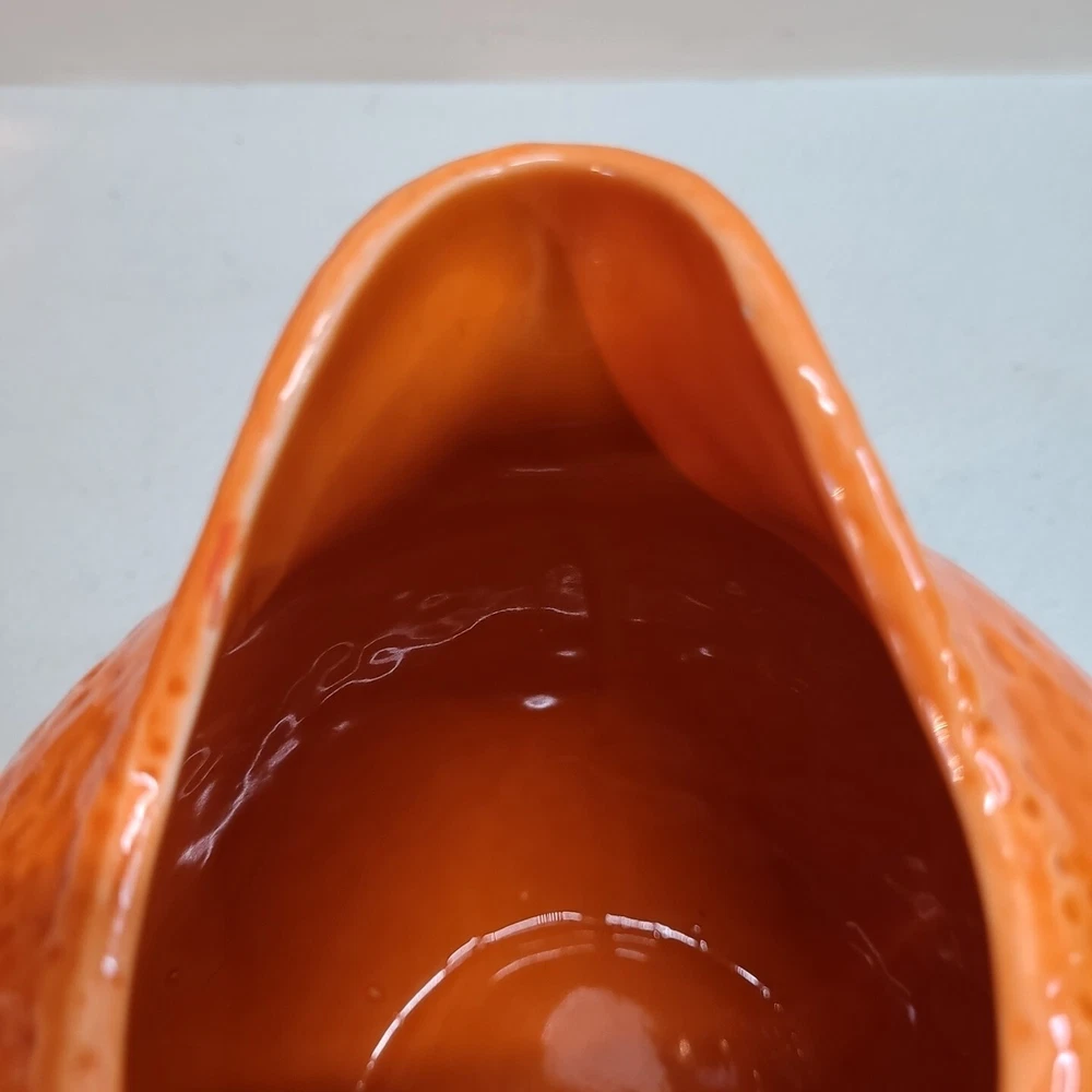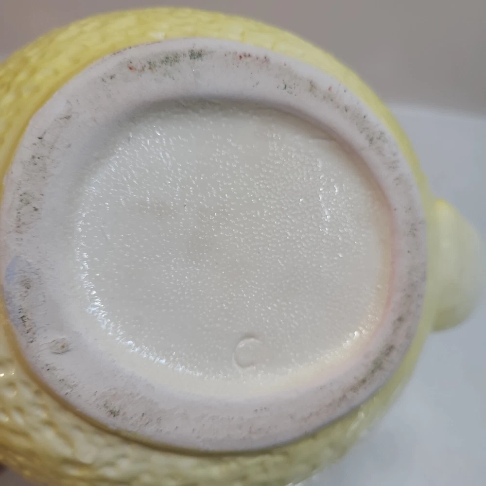 Vintage Ceramic Lemon Shaped Pitcher/Carafe & Orange Shaped Pitcher/Carafe. The orange pitcher measures 5.5" tall x 6" wide x 6" long (w/o handle) 7.5" (w handle) and weighs 1 lb, 6.3 oz. I don't see any cracks in it. The lemon pitcher measures 7" tall x 5" wide x 5" long (w/o handle) 7.5" (w handle) and weighs 1 lb, 3 oz. There is a hairline crack on the top rear near the handle. It starts at the top and goes down approximately 2". Itbl is still structurally strong and it does not leak. I do not know exactly how old these are or what brand they may be. Please view photos for more info and condition and always feel free to ask questions. Thank you for viewing! Be sure to check out all the other items in my store - pickerparadise9Vintage Ceramic Lemon Shaped Pitcher/Carafe & Orange Shaped Pitcher/Carafe. The orange pitcher measures 5.5" tall x 6" wide x 6" long (w/o handle) 7.5" (w handle) and weighs 1 lb, 6.3 oz. I don't see any cracks in it. The lemon pitcher measures 7" tall x 5" wide x 5" long (w/o handle) 7.5" (w handle) and weighs 1 lb, 3 oz. There is a hairline crack on the top rear near the handle. It starts at the top and goes down approximately 2". Itbl is still structurally strong and it does not leak. I do not know exactly how old these are or what brand they may be. Please view photos for more info and condition and always feel free to ask questions. Thank you for viewing! Be sure to check out all the other items in my store - pickerparadise9