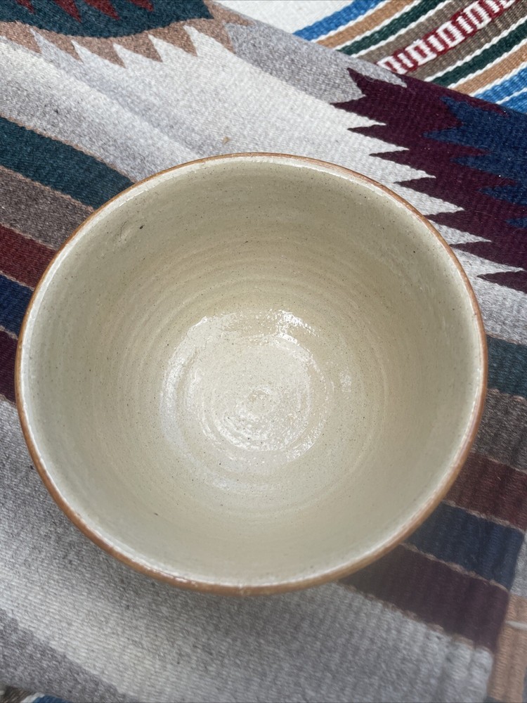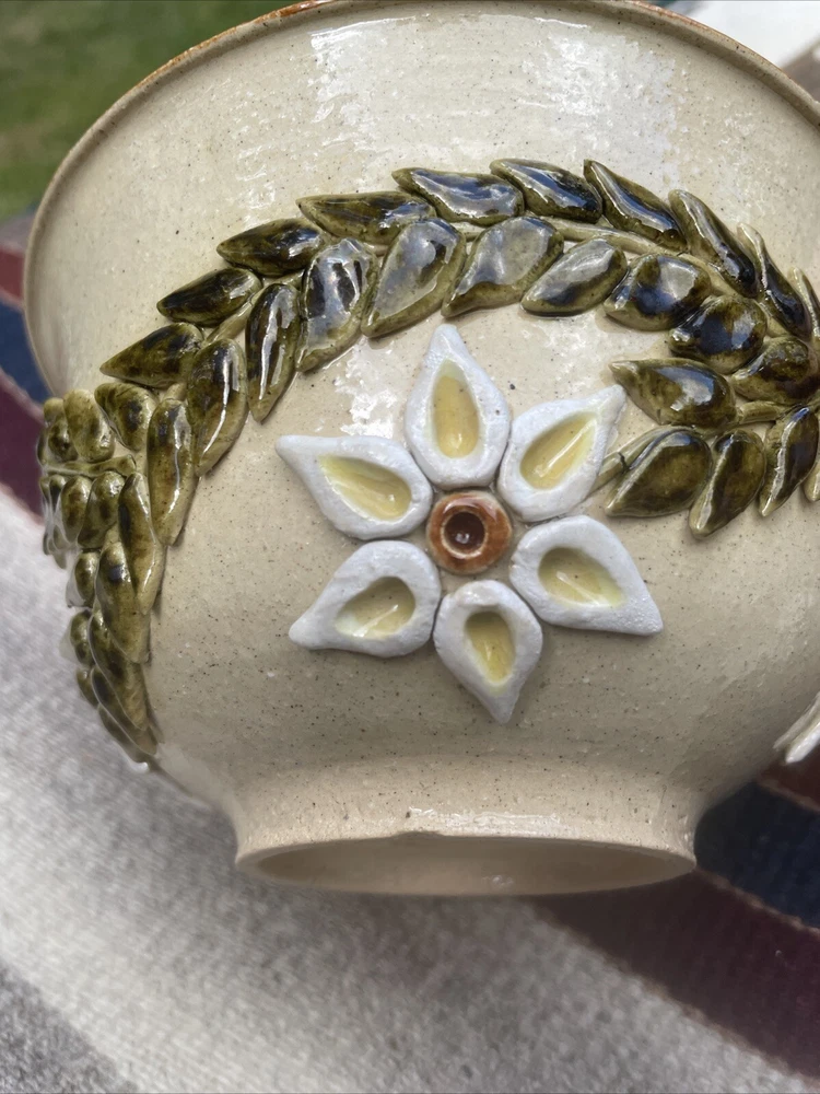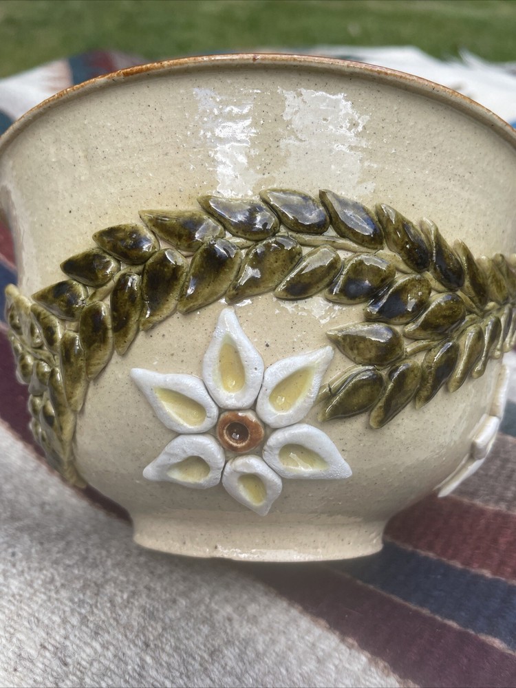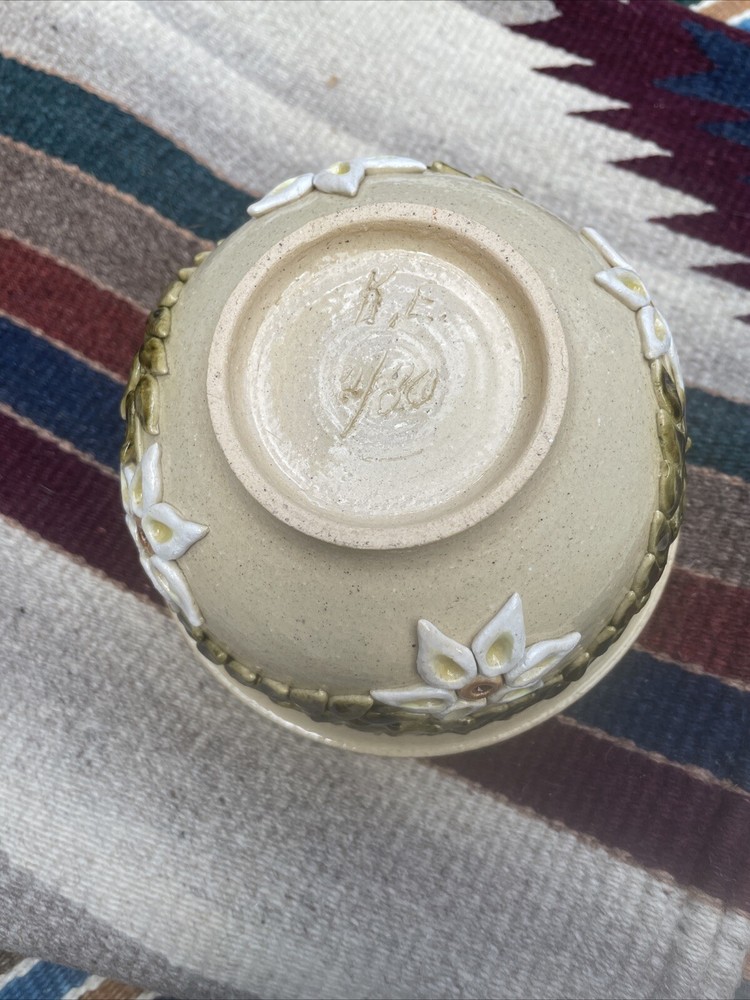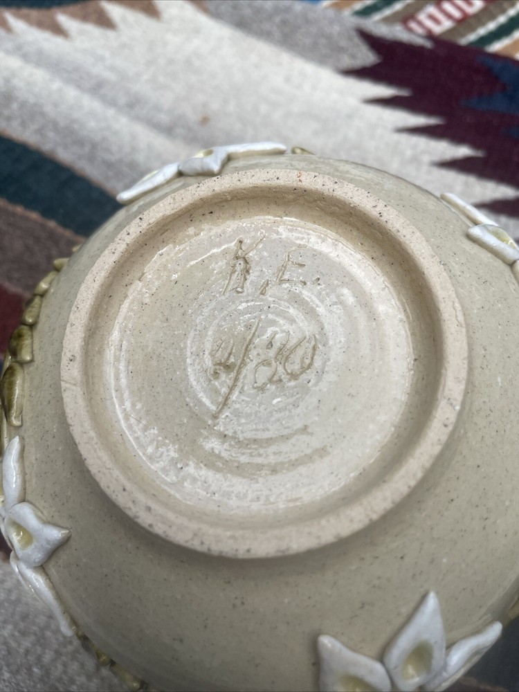 Vintage Ceramic Studio Art Pottery Bowl Signed with initials KE and 2/80. Glazed Beige Tone. Green and White Floral embellishments. Measures approximately 4” tall x 6” wide at the opening. No chips, cracks and the piece is in very nice condition. I see one area where the pottery is creased but I believe that occurred while creating. See photos for description.